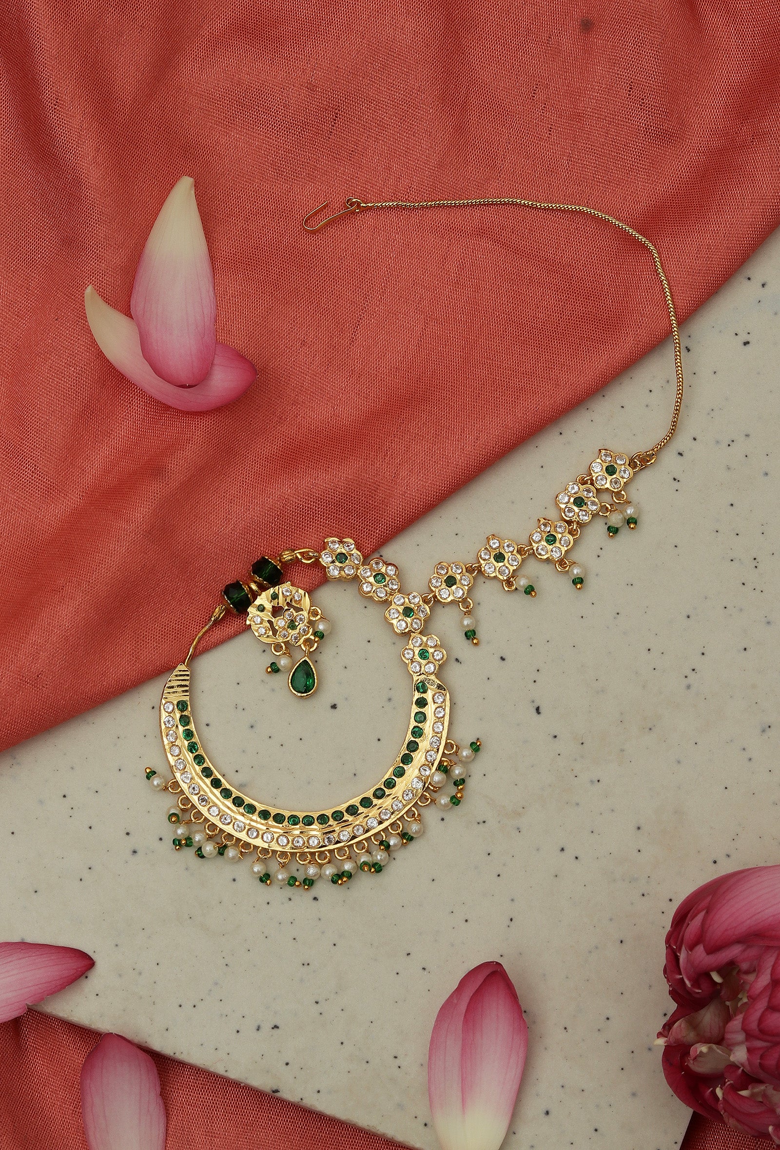 The Green Stone Kundan Crescent Nath features a graceful crescent design adorned with rich green stones and traditional Kundan work. Accented with delicate detailing, it adds a regal, timeless charm to bridal and festive ensembles.