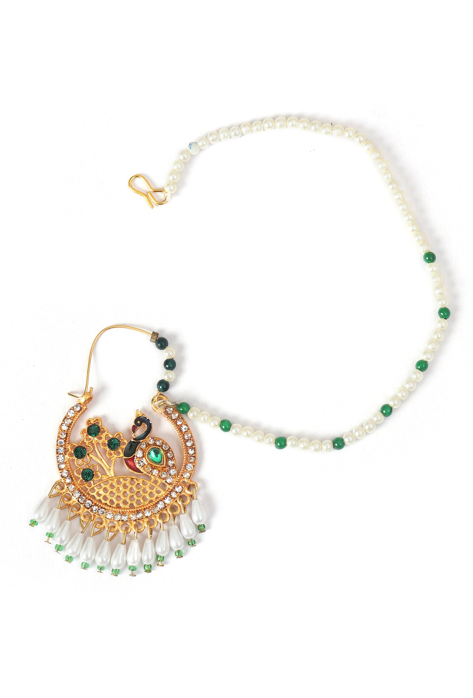 The Peacock Green Kundan Nath with Pearl Chain features a striking peacock-inspired design adorned with rich green Kundan stones and a graceful pearl chain. Elegant and traditional, it adds royal charm and timeless beauty to bridal and festive looks.