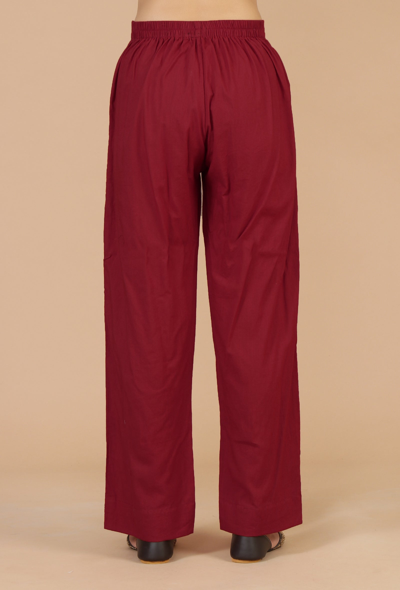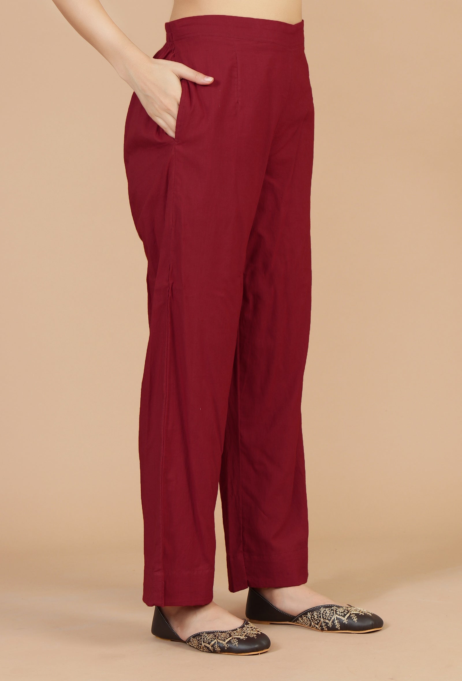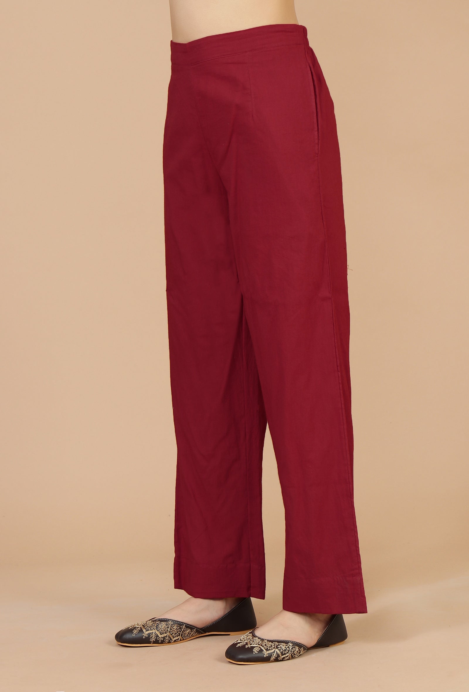 Tailored from breathable, soft cotton, these solid red pants offer a flattering straight fit and all-day comfort. A versatile essential that pairs effortlessly with printed kurtas, tunics, or festive tops—ideal for both casual wear and ethnic ensembles.