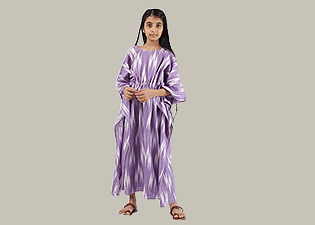 Let your girl stay relaxed in this purest cotton kaftan dress. The enchanting pink hue and beautiful ikat print make this dress a summer-perfect pick. It features a round neck and three-fourth sleeves. The drawstring tie up at the shoulder...
