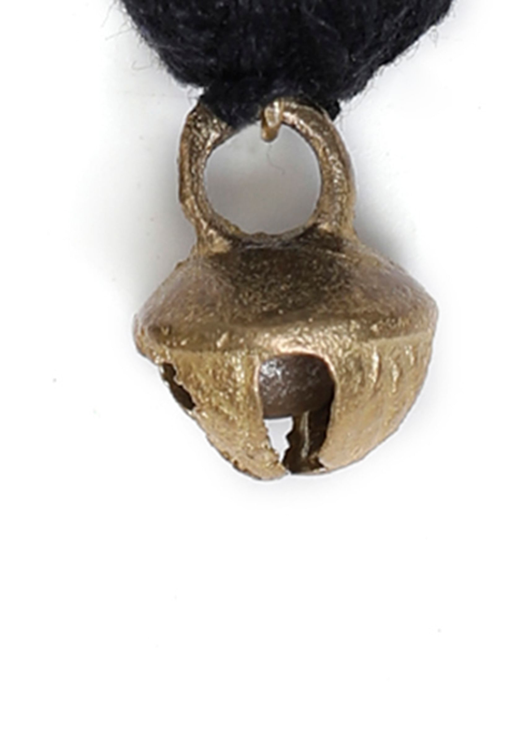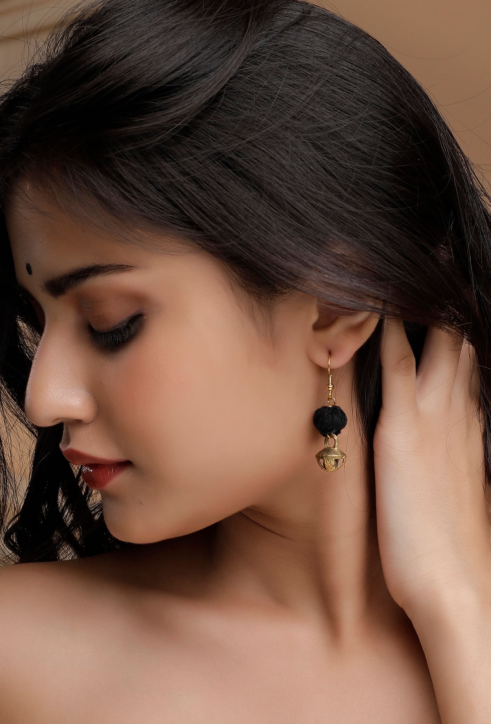 Earrings can add so much grace to the overall look. This beautiful pair of earrings has been handcrafted using gold-tone brass dancing bells with silver finish brass embellishments. Intricately engraved and featuring black glass beads for a splash of colour, these earrings will fill the room with their pleasant tinkle.