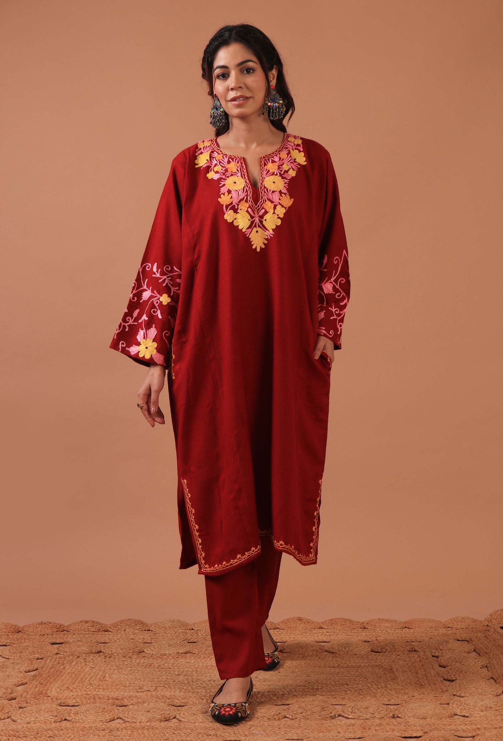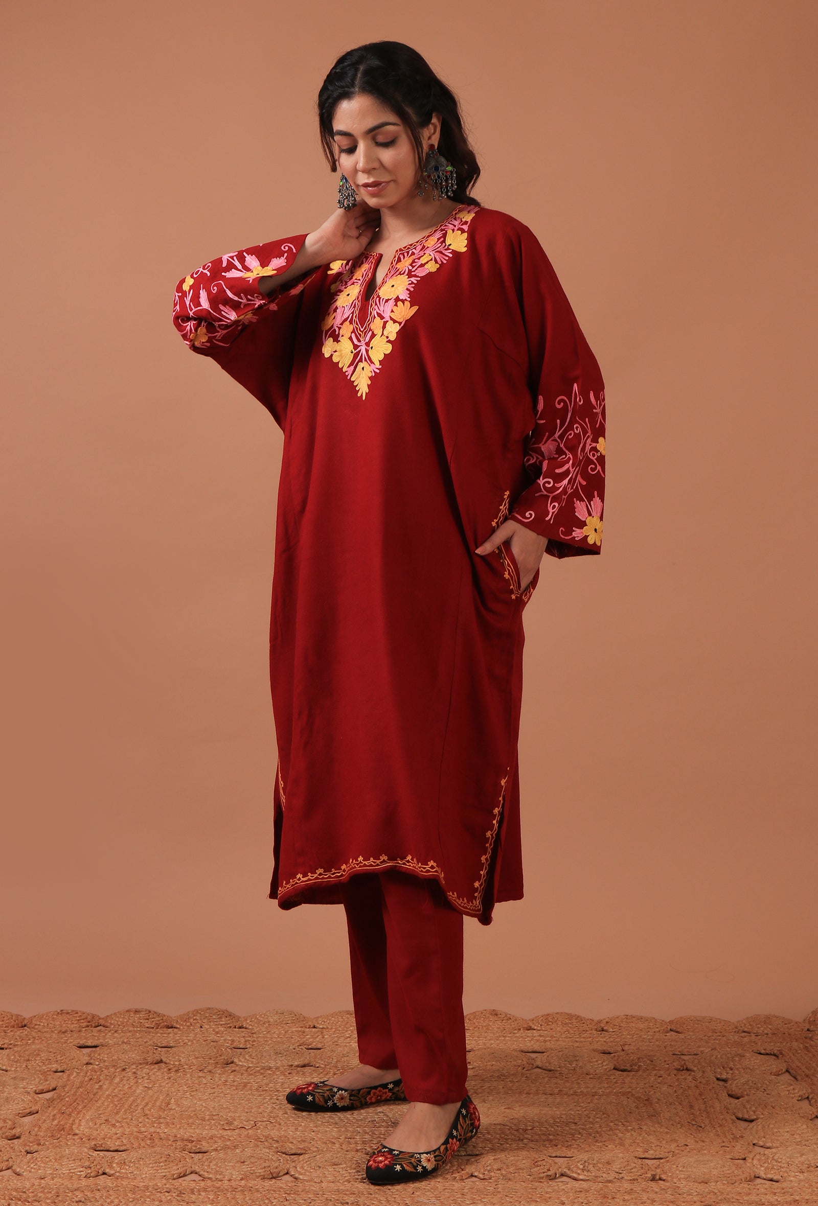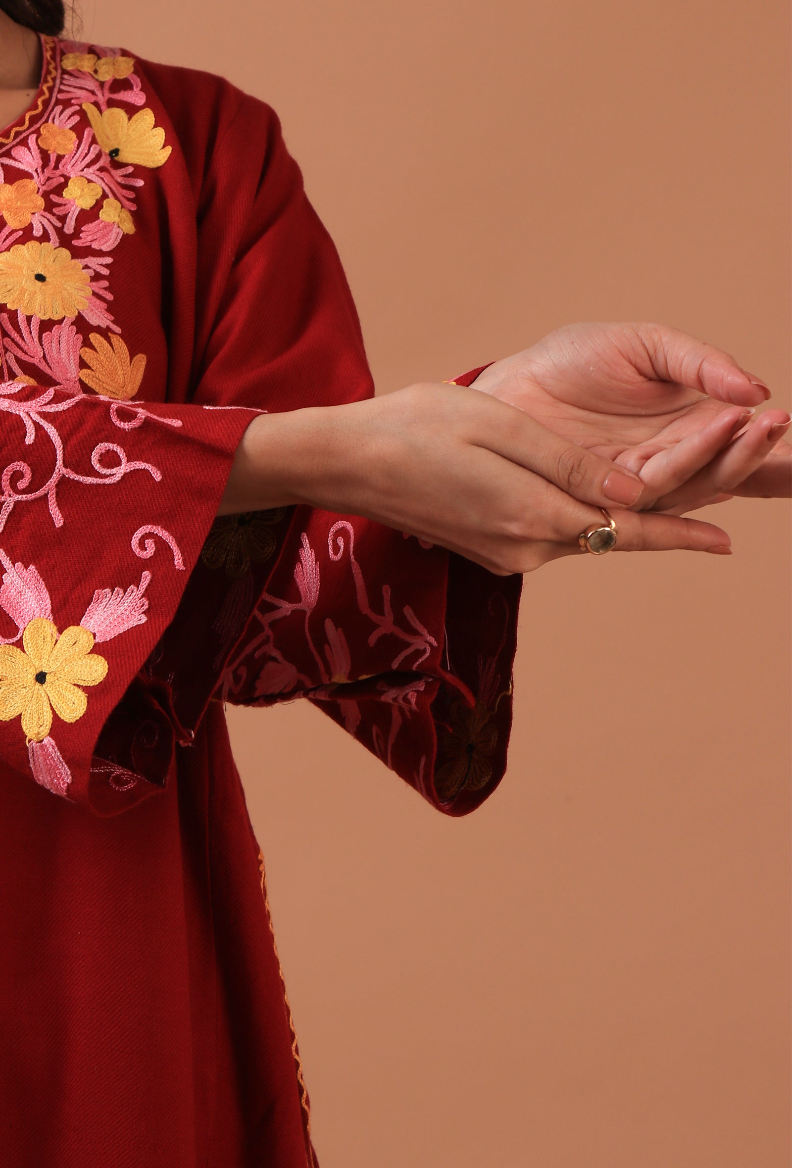Old Brick Woolen Ari Embroidered Phiran- Free Size