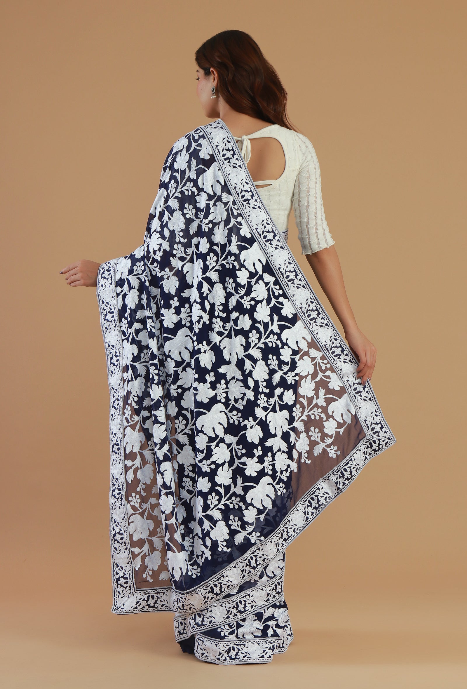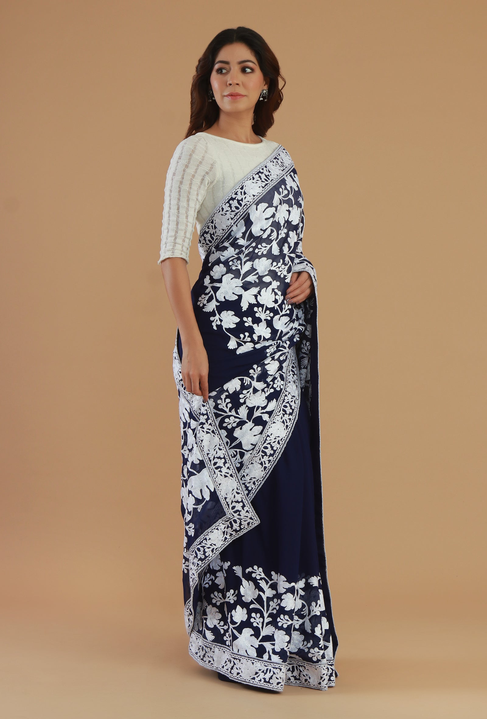This elegant navy blue georgette saree features intricate white floral embroidery that adds a refined and graceful charm. The lightweight georgette fabric drapes effortlessly, while the detailed embroidered border and pallu elevate its traditional appeal. Perfect for festive occasions, functions, and celebrations.