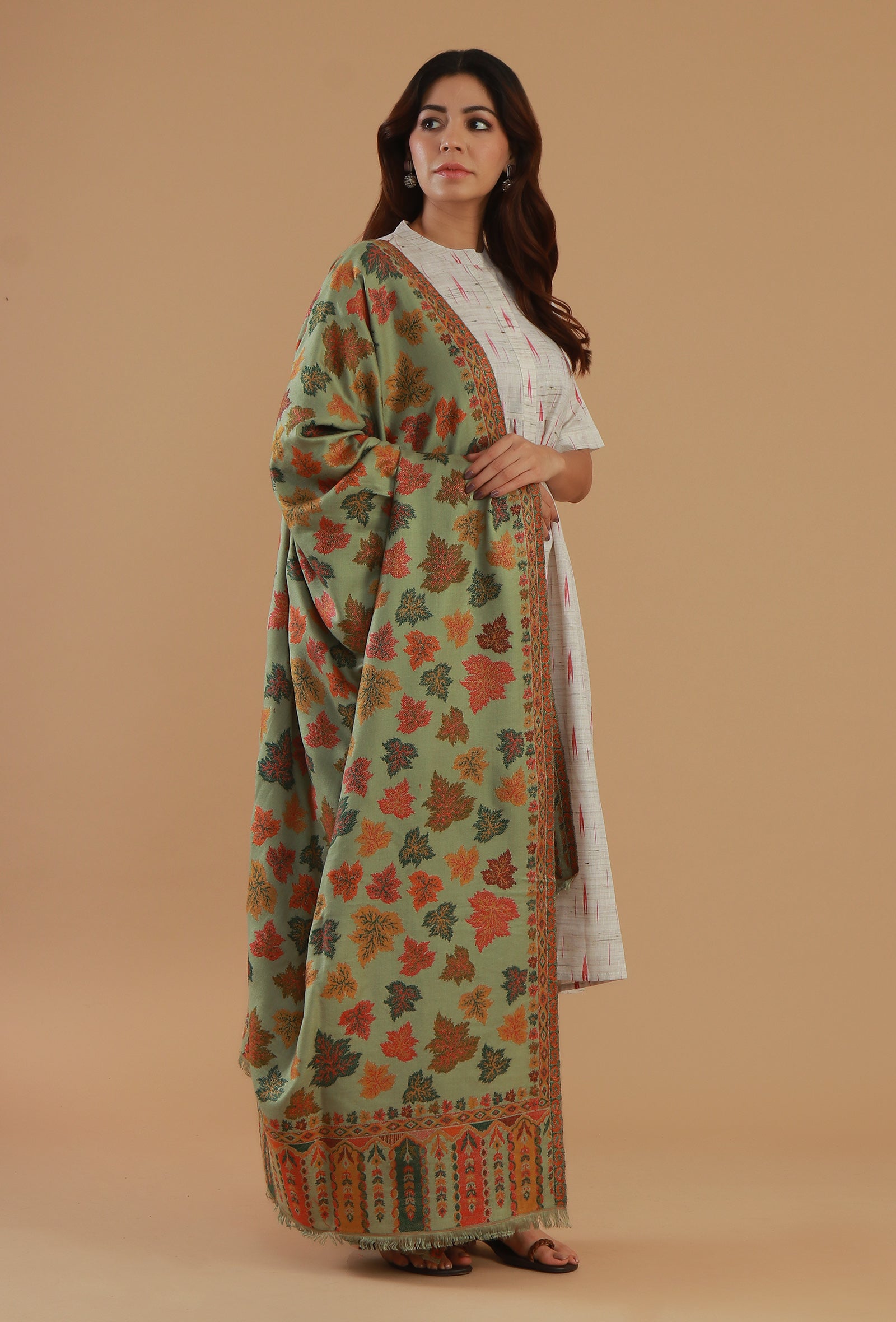 This beautiful Kashmiri Kani shawl showcases intricate chinar booti motifs on a soothing sage green base. Crafted in a warm, soft winter fabric, it blends traditional elegance with everyday comfort, making it a timeless addition to your wardrobe.