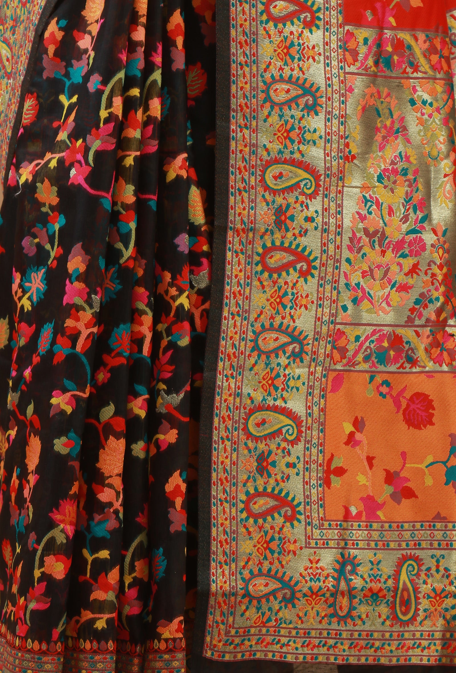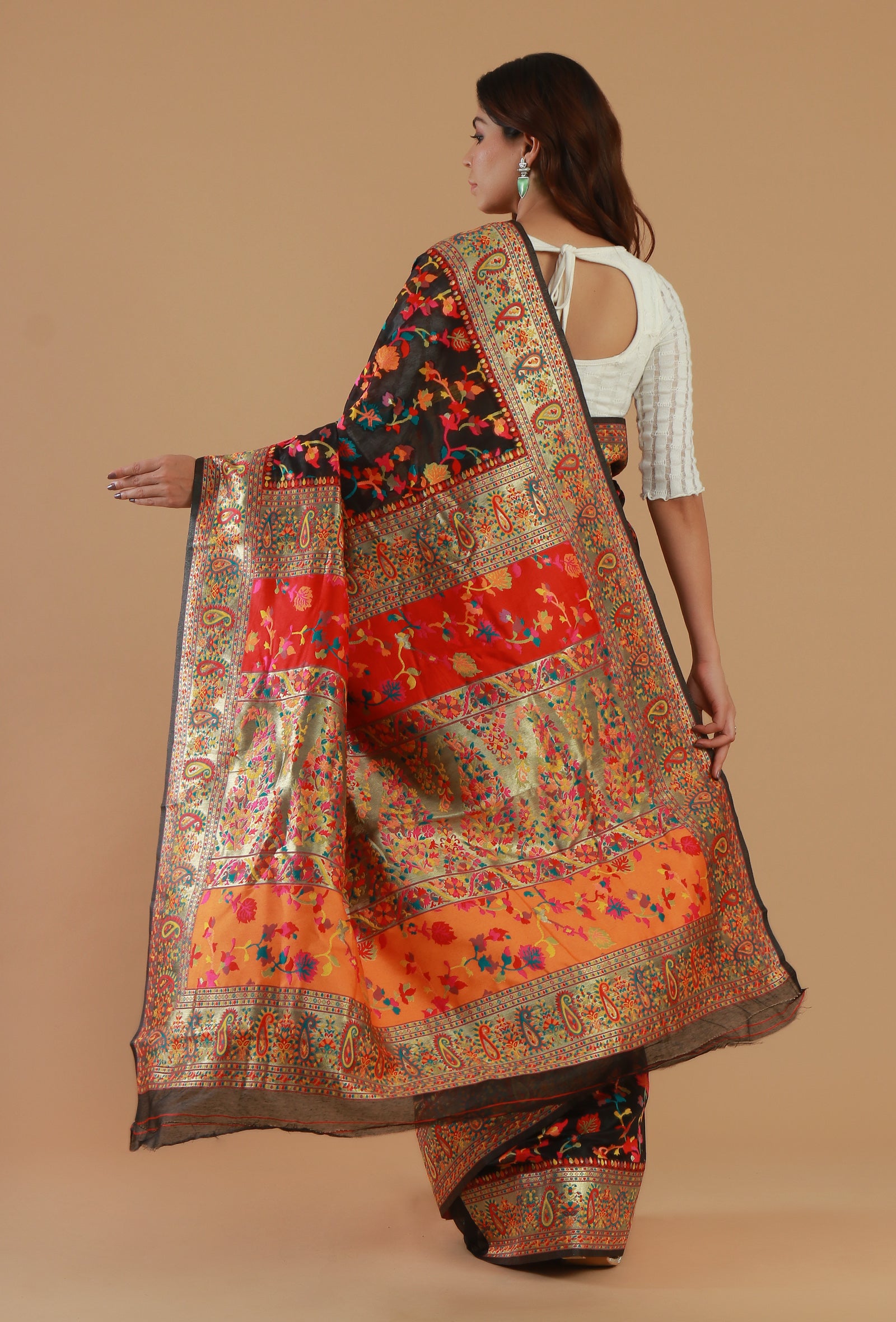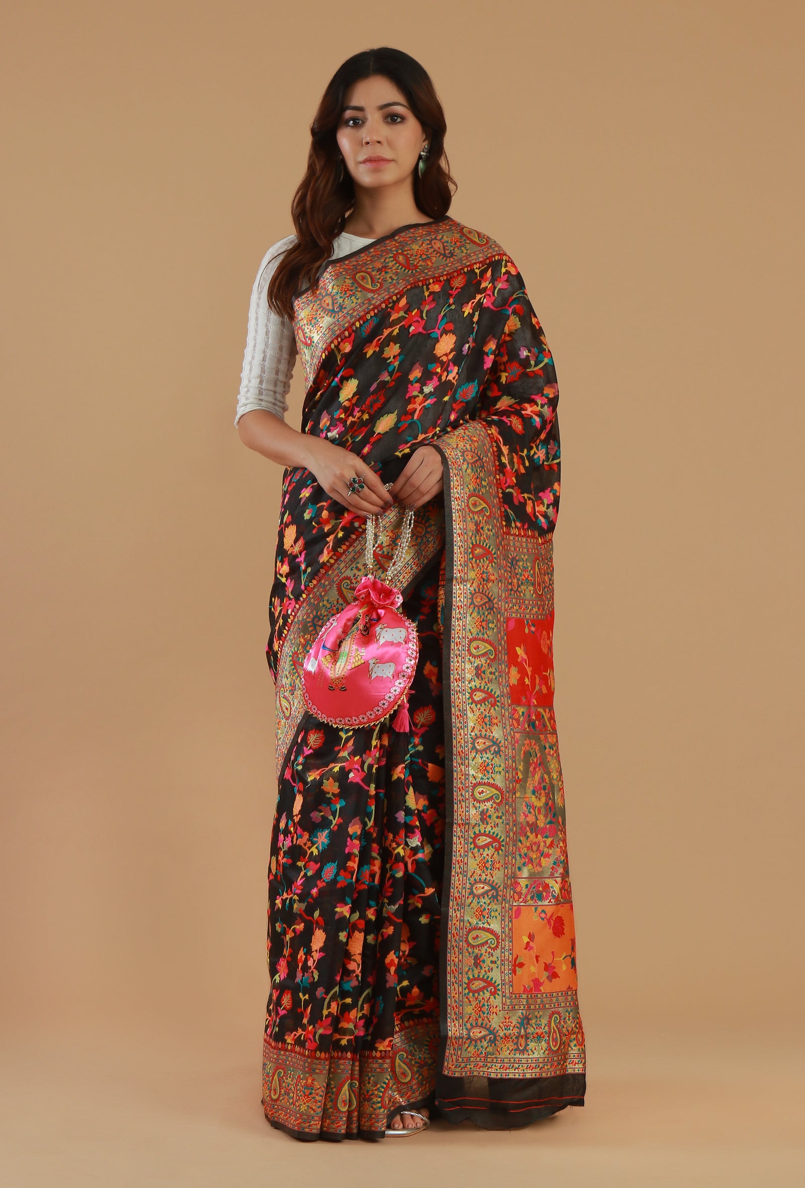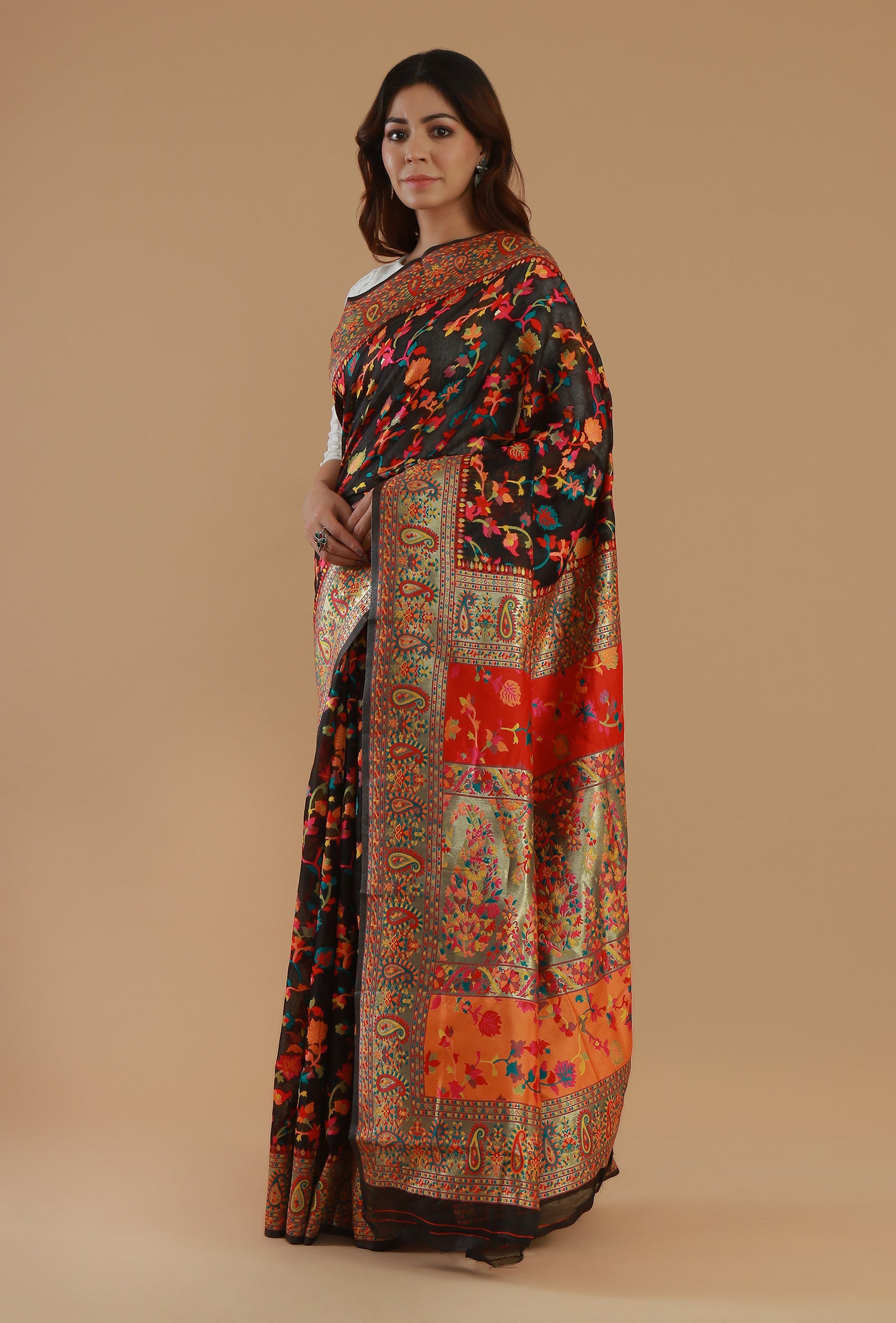 Kashmiri Inspired Floral Printed Silk Wool Saree with Unstitched Blouse