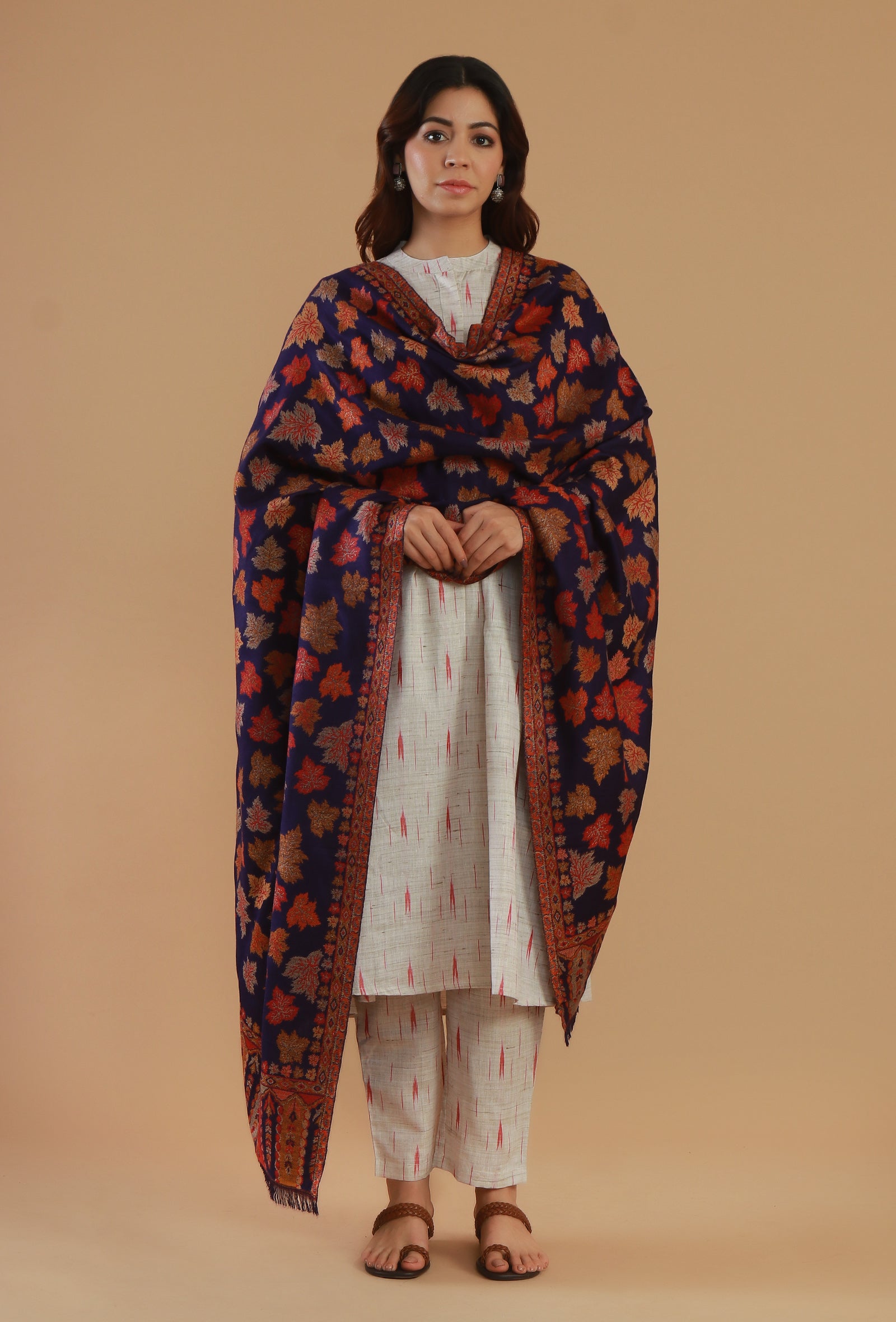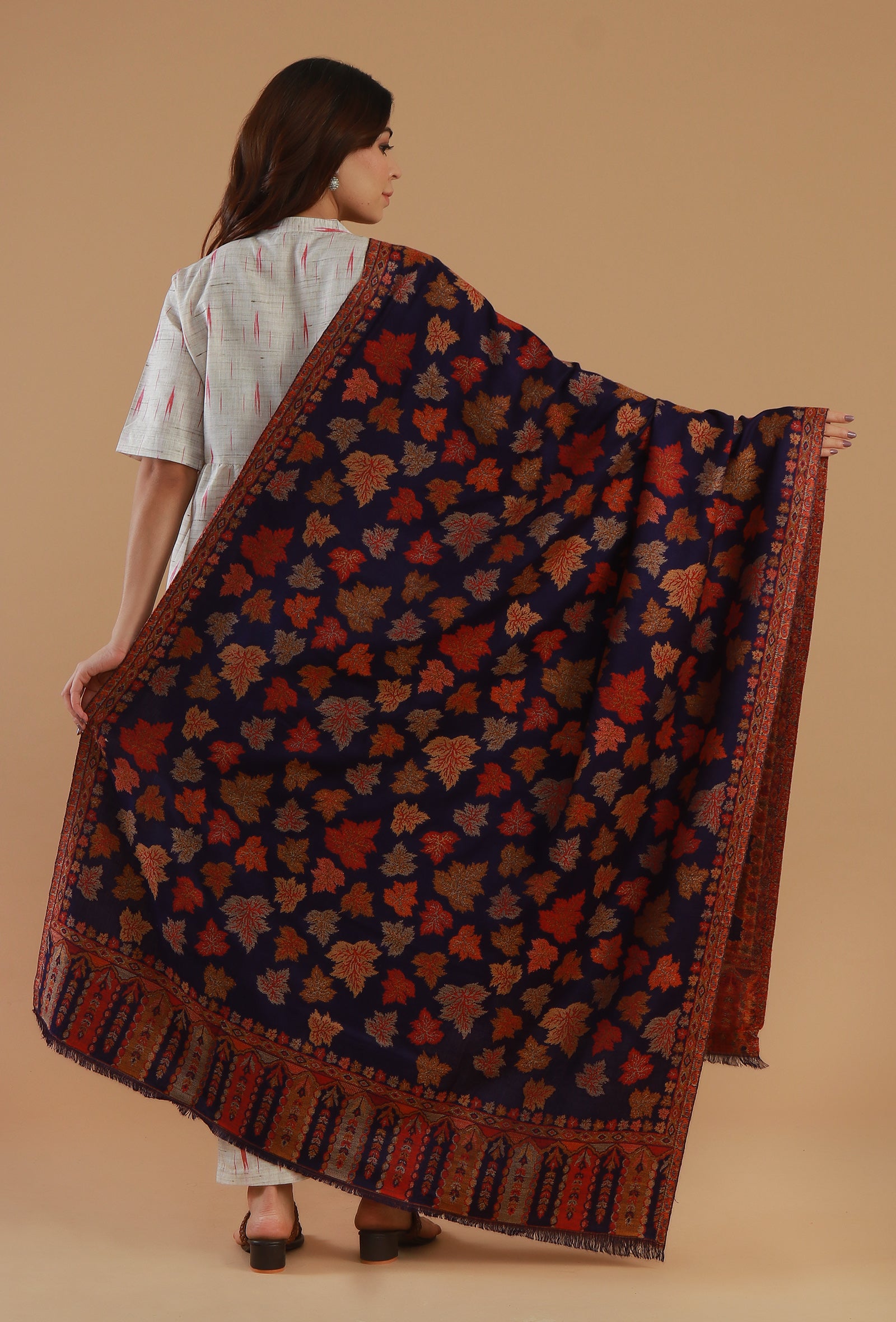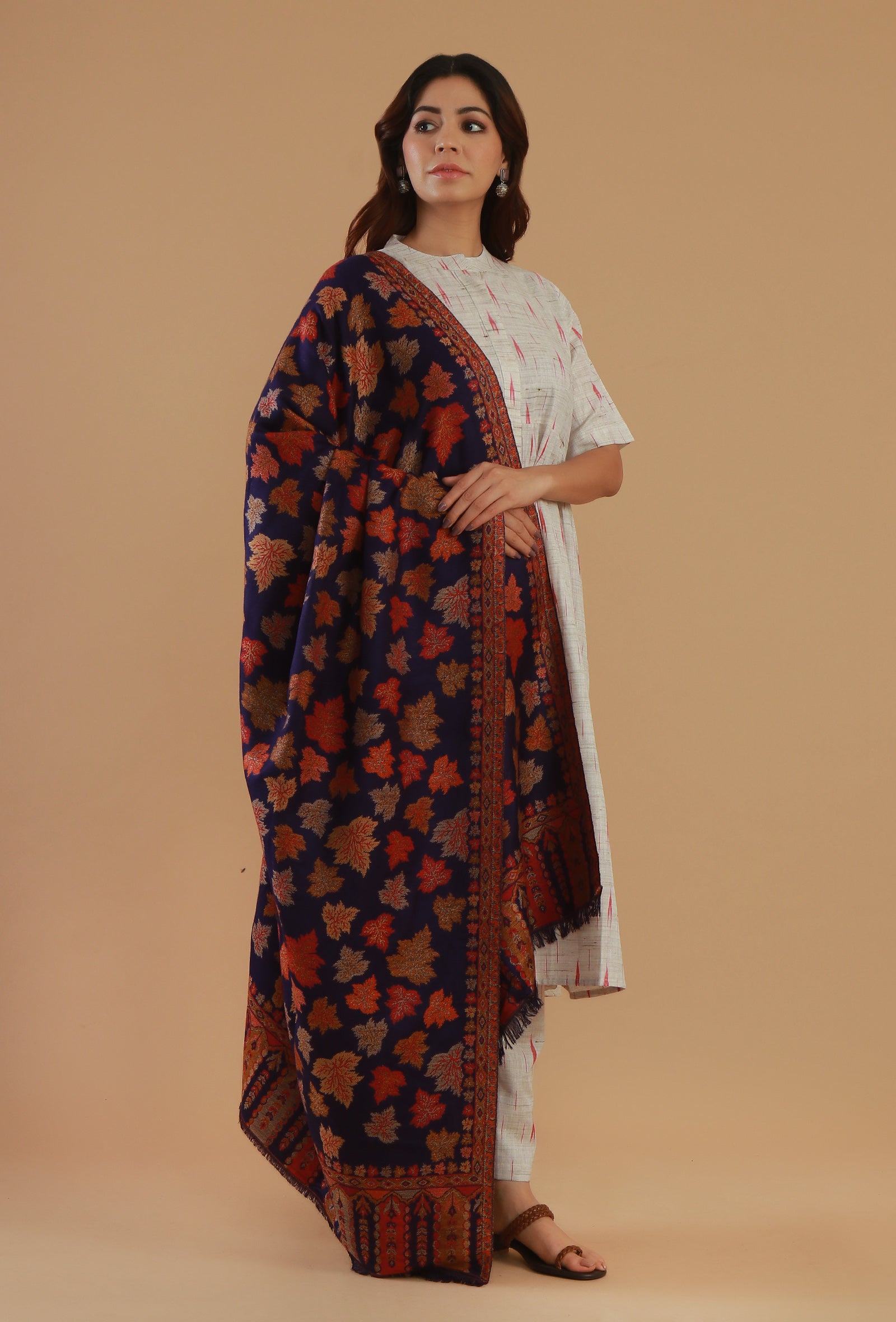 This elegant Kashmiri Kani shawl features traditional chinar booti motifs woven on a rich navy blue base. Crafted with a warm and soft winter-friendly fabric, it adds timeless charm and luxurious comfort to your ethnic and everyday outfits.