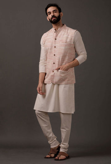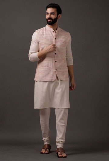 The trio never fails to impress! Look your ethnic best wearing this cotton kurta and contrast pyjama set topped with cotton nehru jacket and two welt pockets which just completes the look giving your daily wear a statement. Color: Beige...