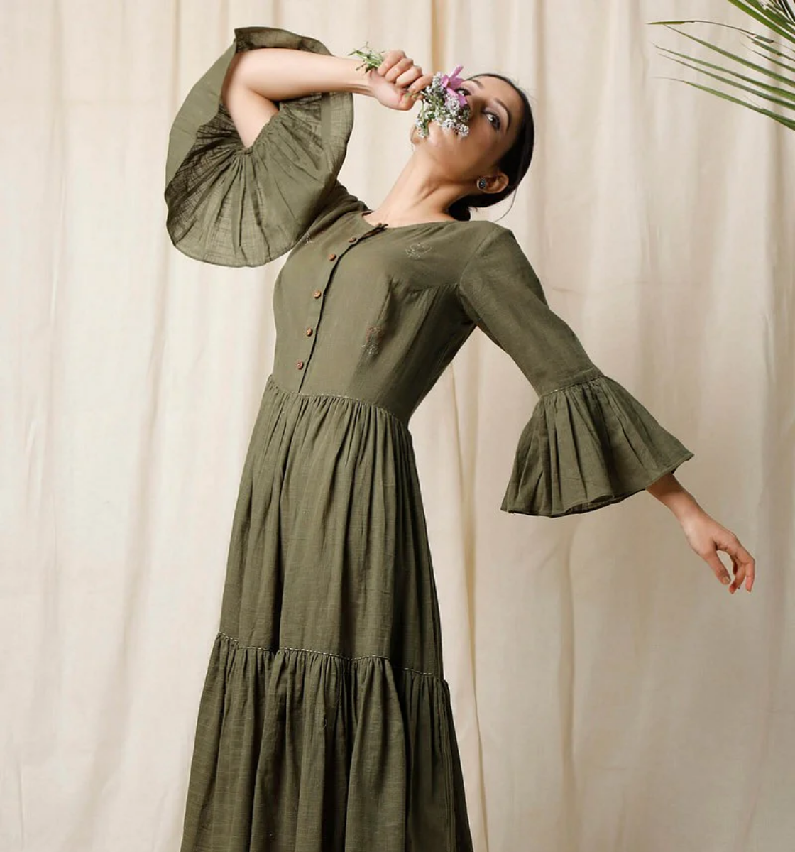 This beautiful mehendi green dress has been designed with an airy silhouette. It features Kantha flowers on the front, hand embroidered by the skilled women artisans of India, and has been handcrafted using premium cotton slub for an earthy look....