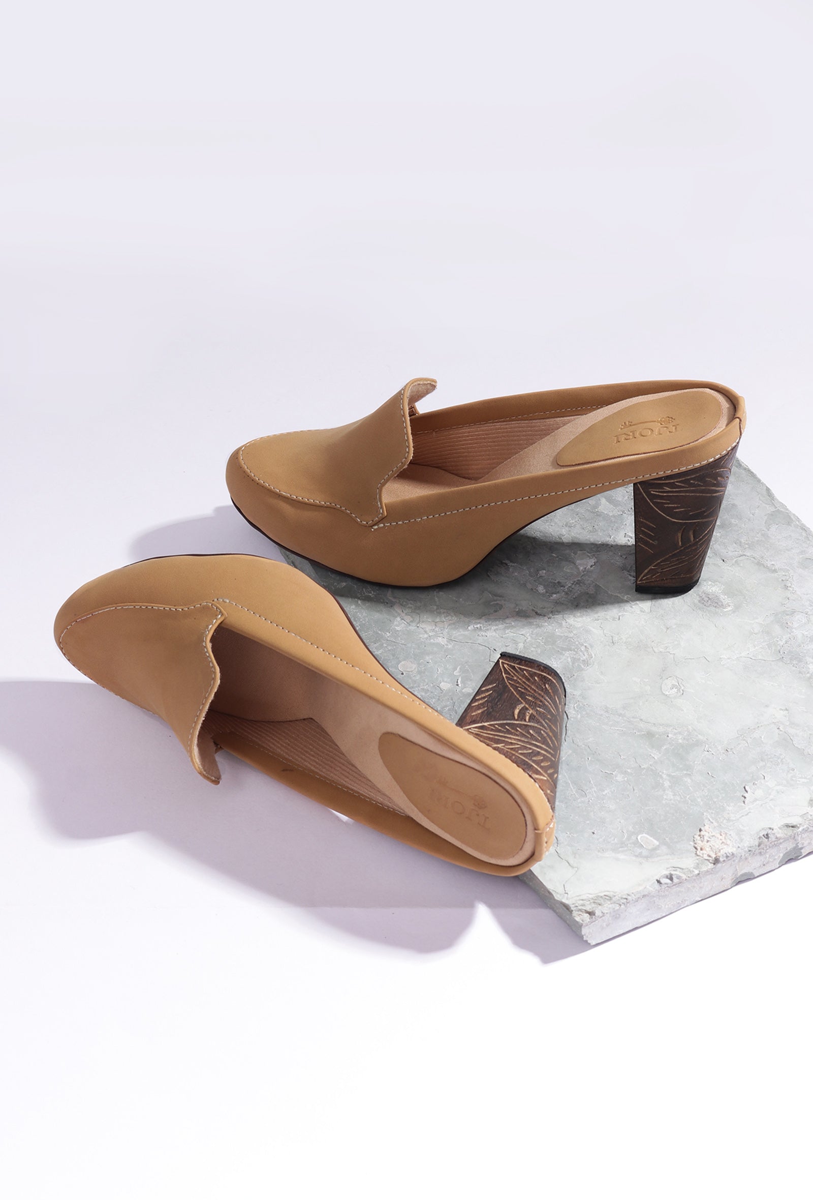 Tortilla Brown Cruelty-Free Leather Mules With Carved Heels