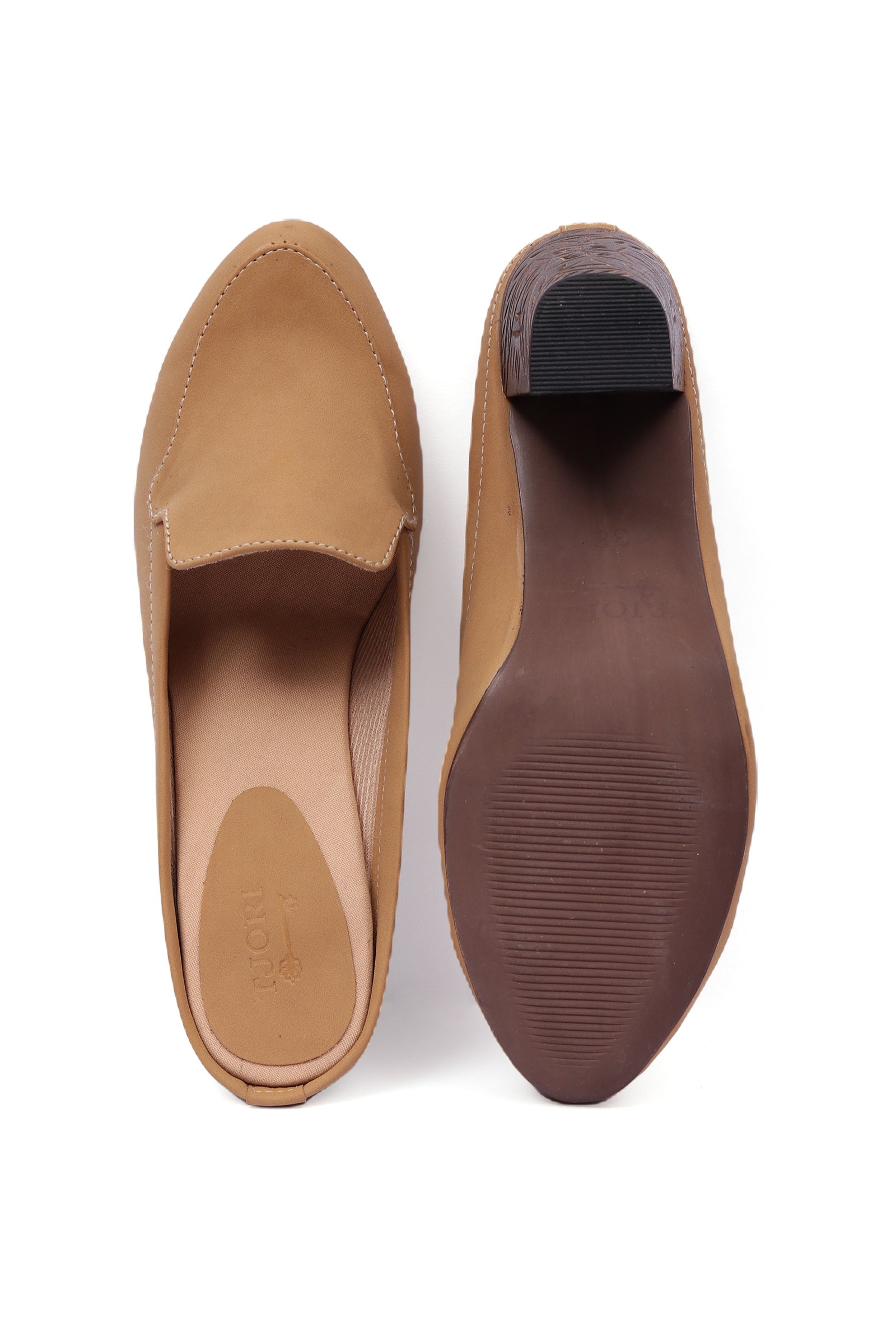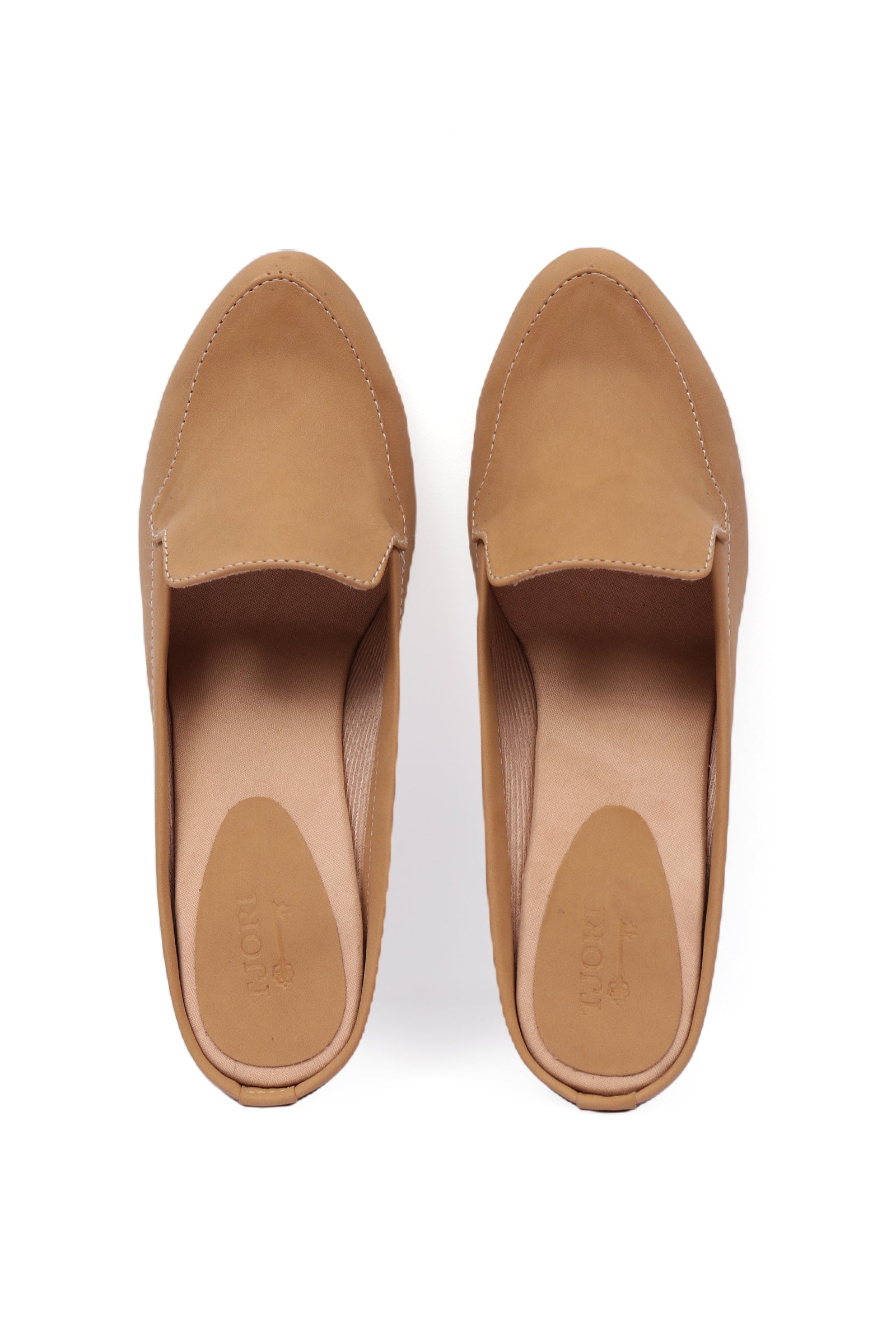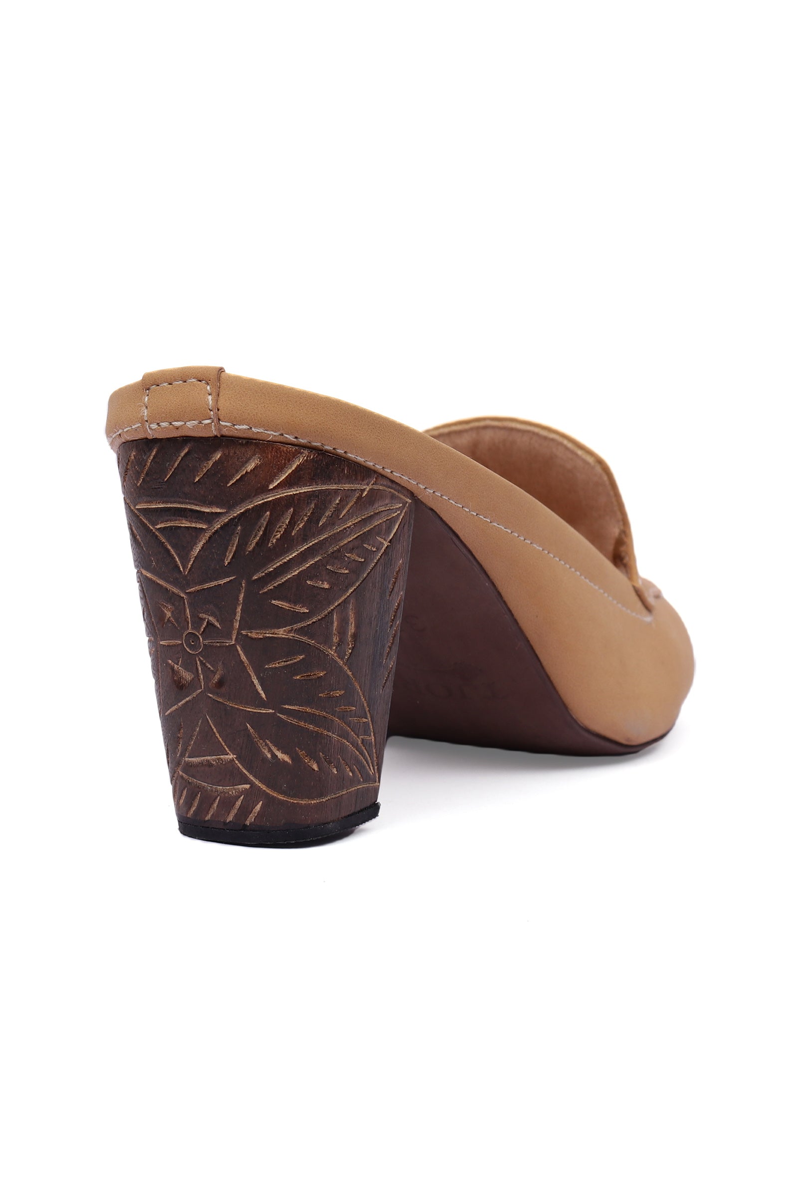 Step into the world of comfort and style with this edgy pair of tortilla brown mules. Handcrafted by expert artisans in soft cruelty-free leather, it features a durable plain upper and carved heels. The extra padding ensures utmost comfort and flexibility to your feet. This footwear will go perfectly with both western and ethnic attires.