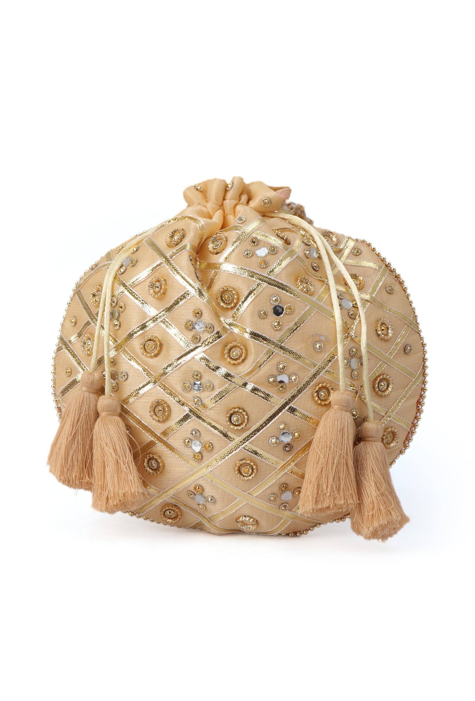 Glimmering Golden Potli with Glass Mirror Work shines with subtle elegance. The creamy base is beautifully enhanced by intricate glass mirror detailing, adding a touch of sophistication and sparkle. Perfect for elevating any outfit with a blend of classic charm and modern glamour.