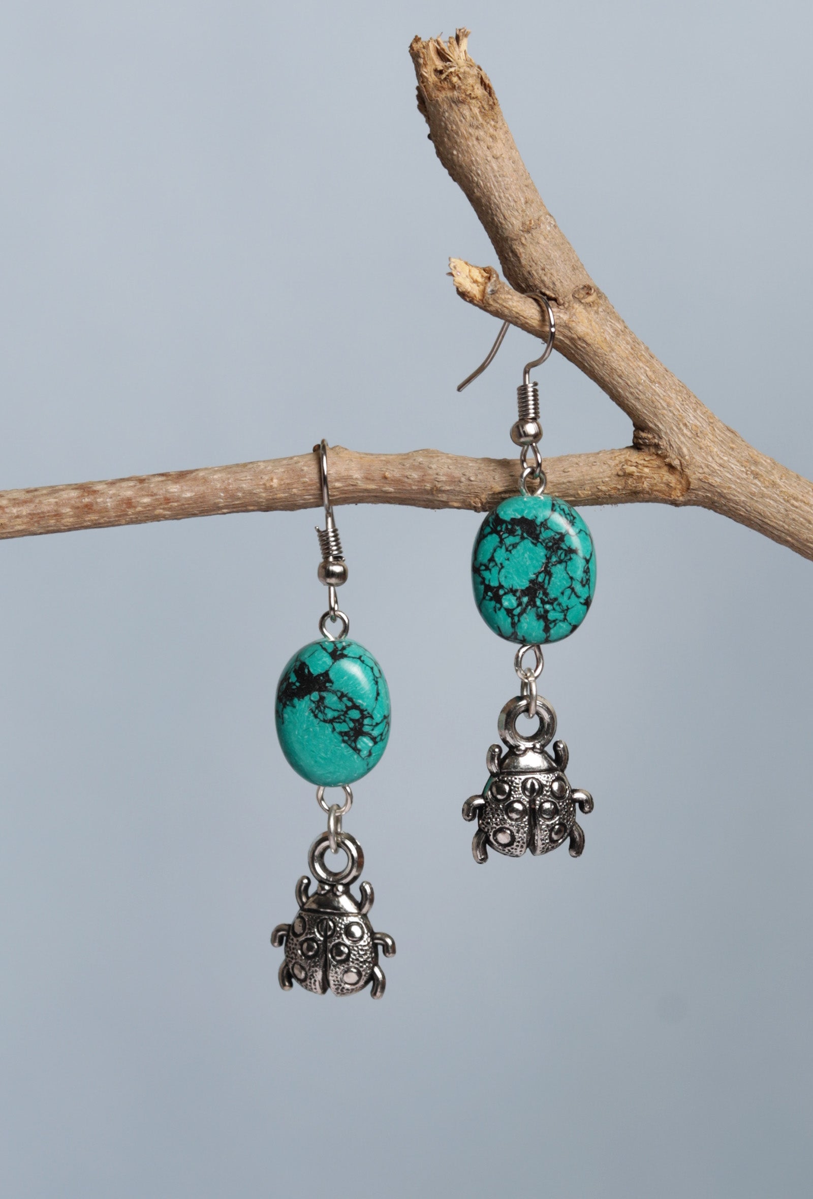 Embrace nature's beauty with our Turquoise Stone Ladybug Dangler Earrings. Crafted to perfection, these earrings feature vibrant turquoise stones adorned with delicate ladybugs for a touch of whimsical charm.