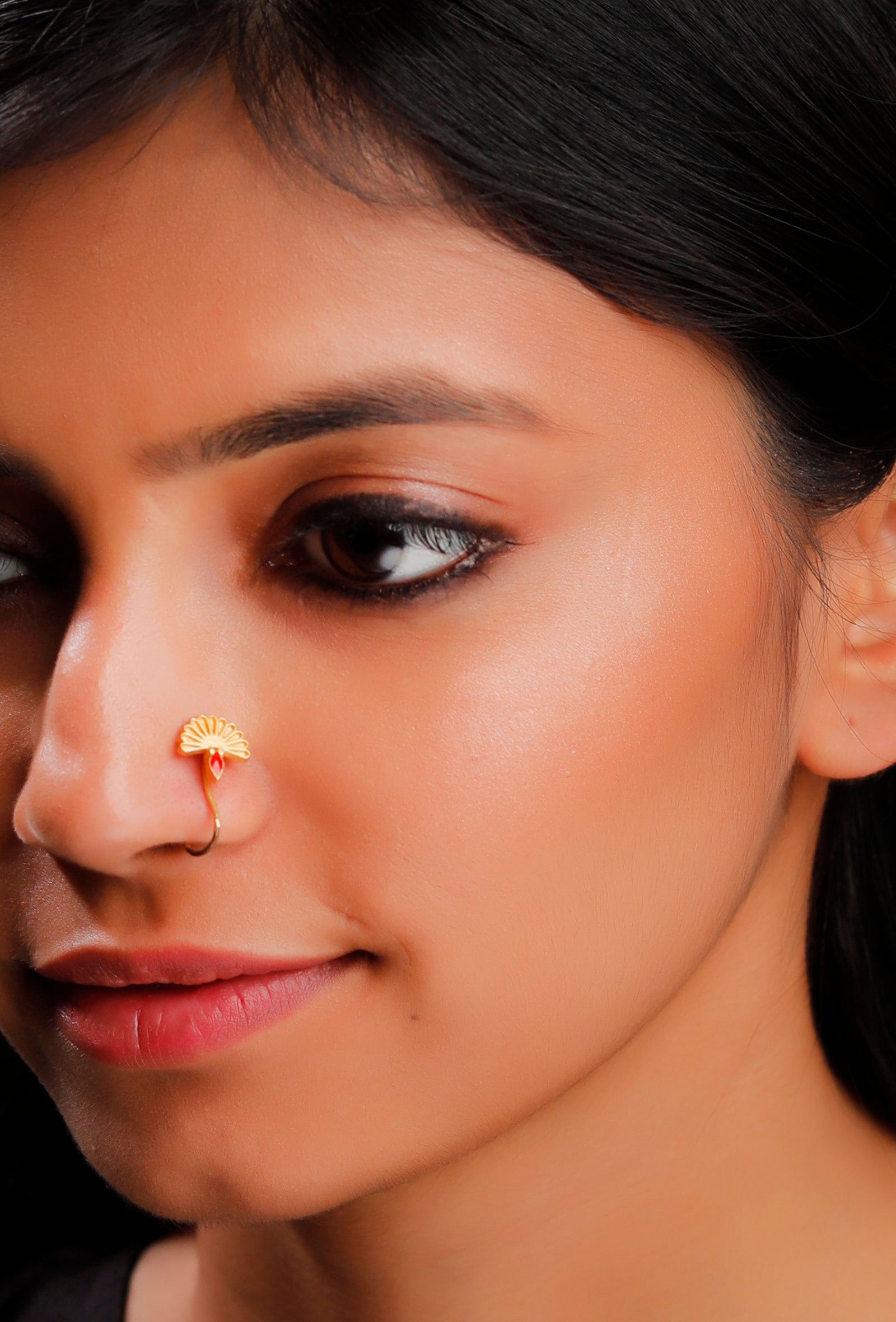 The Red Enamel Flower Intricate Motif Nosepin features a delicate floral design with intricate detailing, highlighted by vibrant red enamel. Crafted from durable brass, this piece adds a bold pop of color and elegance, perfect for those seeking a unique and artistic accessory.
