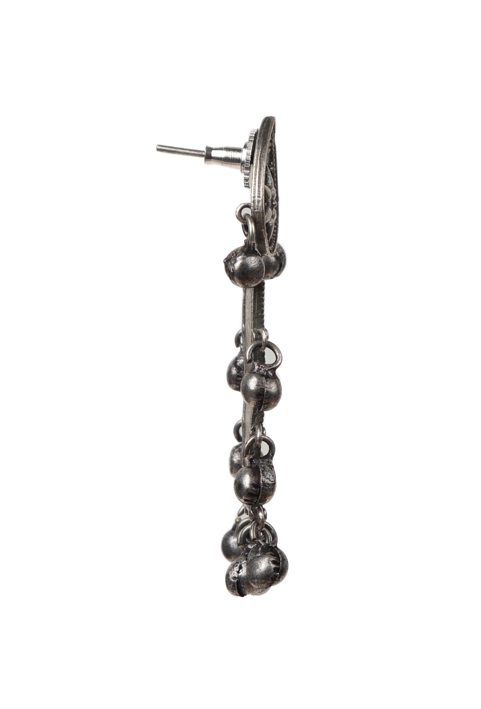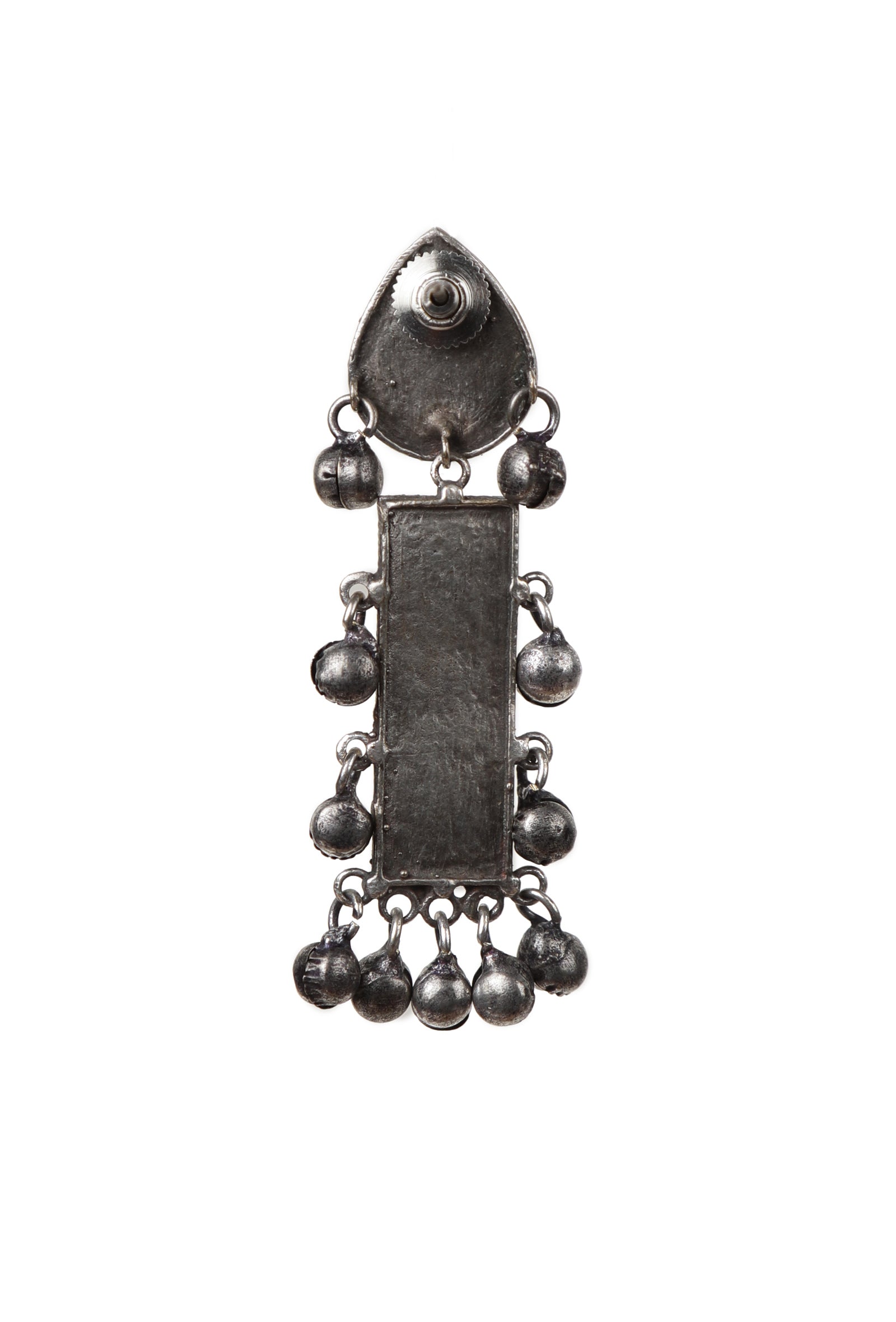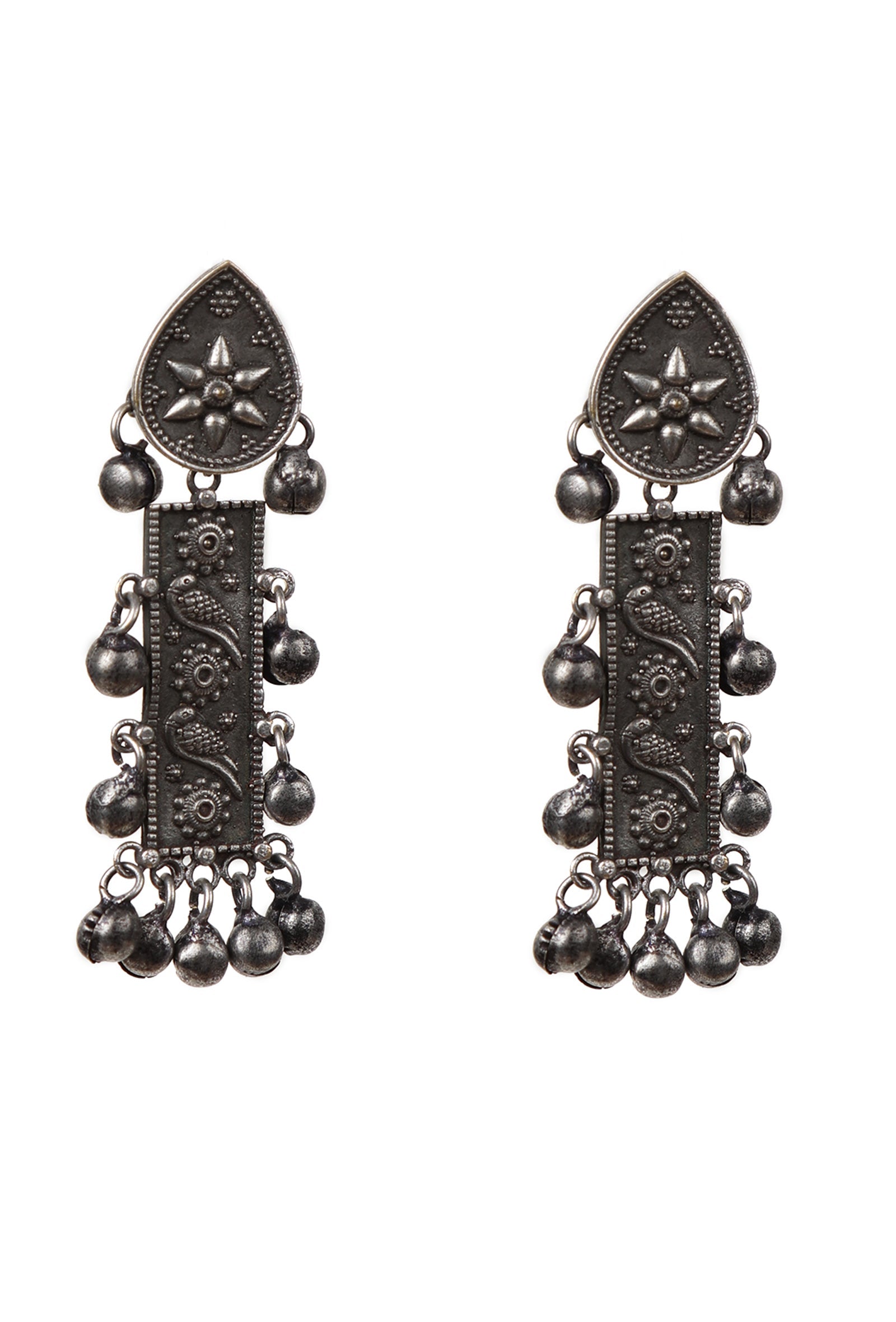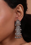 Embrace the spirit of cultural wanderlust with our Tribal Oxidized Silver Rectangular Drop Earrings featuring charming ghungroo accents. The geometric allure pays homage to tribal aesthetics, while the oxidized silver exudes modern sophistication. Let the subtle jingle of ghungroo echo your adventurous spirit, making a statement that's both distinctive and chic.