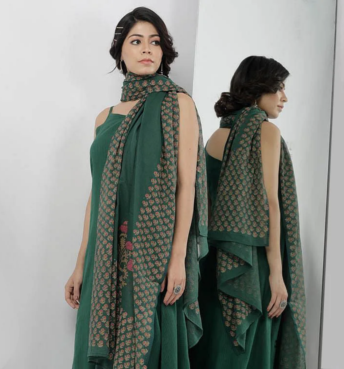 Irvin Bottle Green Floral Motif Hand Block Printed Kota Full Sleeves Cape