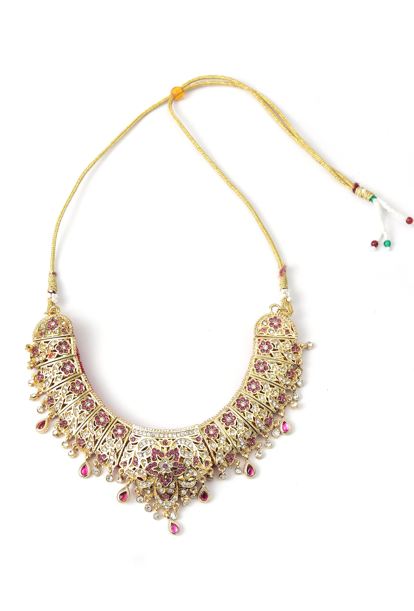 Crafted in traditional jadau style, this necklace features graceful gold-toned motifs and delicate gemstone detailing. Inspired by heritage artistry, it lends timeless elegance and refined charm to festive and bridal ensembles.