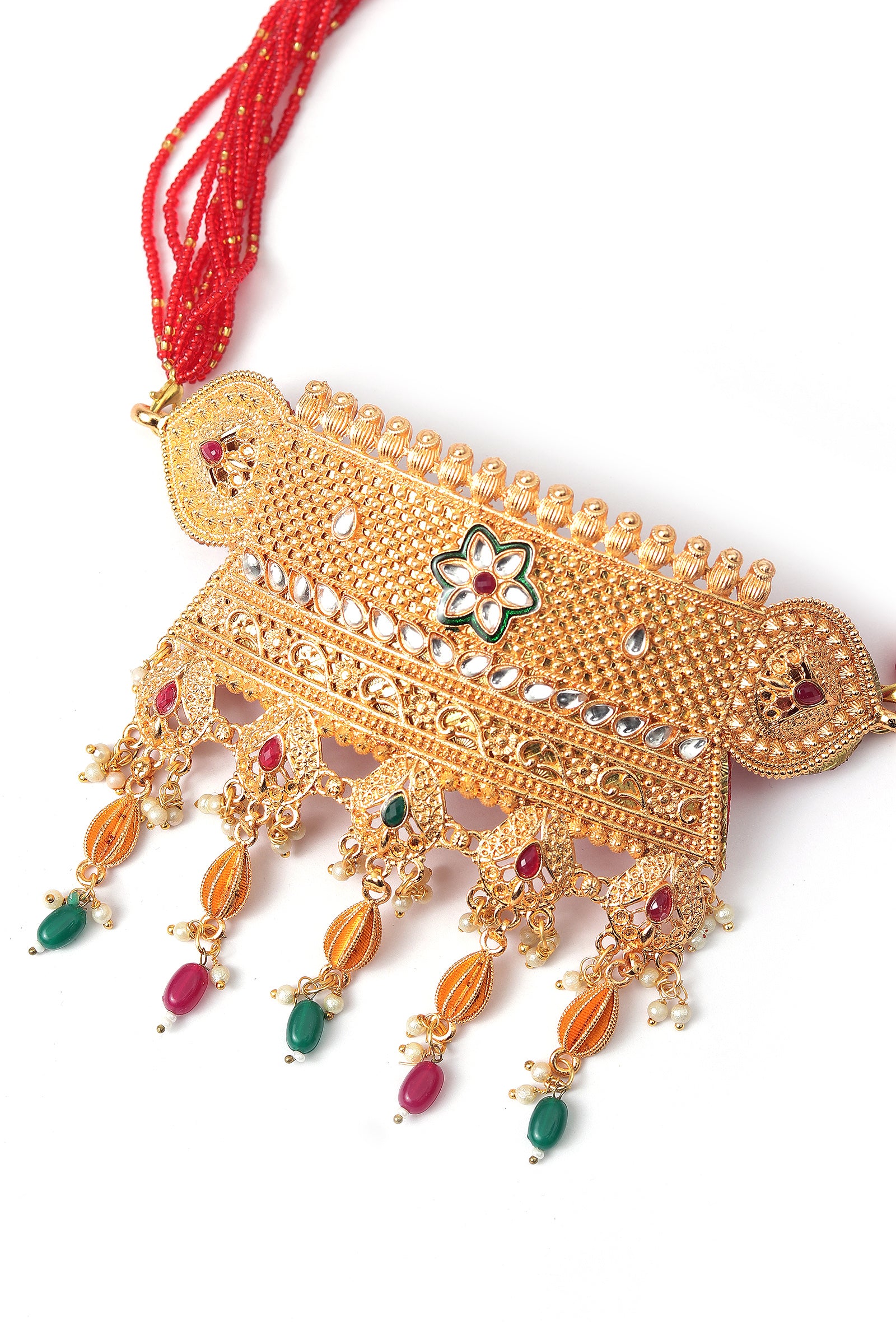 Handcrafted with traditional jadau detailing, this gulbandh-style necklace features rich gold tones and vibrant ratna accents. Inspired by royal heirlooms, it brings heritage elegance and artisanal charm to bridal and festive looks.