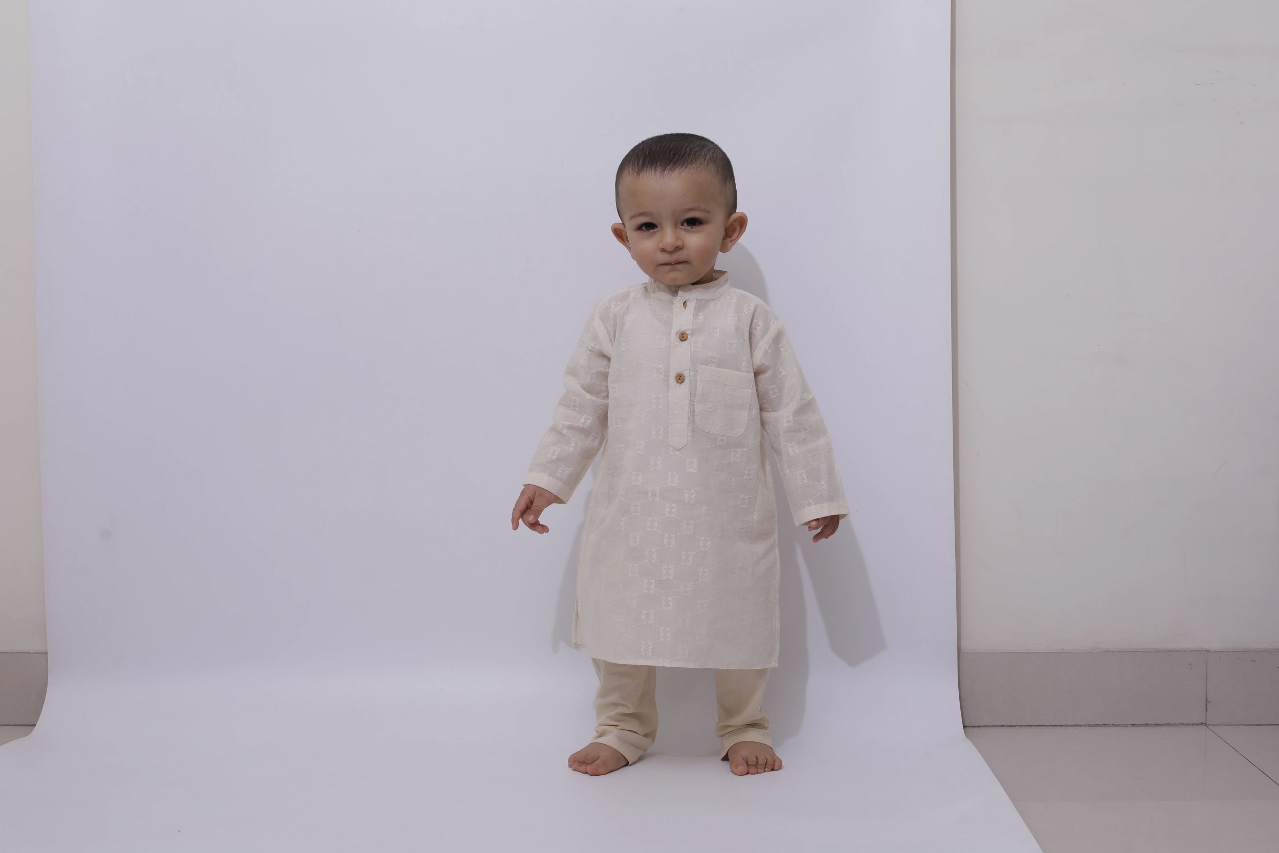 This beautiful off-white malmal kurta-pyjama is for your little ones. The malmal fabric is best for kids as it is super soft, made in 100% cotton and is uber comfortable.