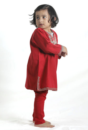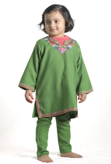 A gorgeous woollen phiran in the beauty of Aari Embroidery of Kashmir. Make your baby girl look look absolutely beautiful in this set of Pure Woollen phiran with bottoms. The phiran is normally loosely gathered at the Sleeves with side...