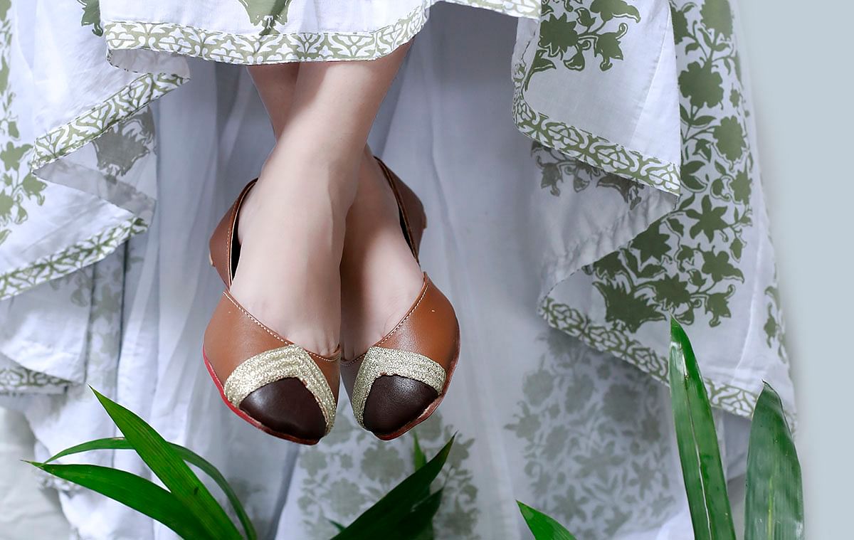 Skilfully hand-stitched juttis in a tasteful brown colour. These juttis have been handcrafted in cruelty-free leather and enhanced with beautiful embroidery.
