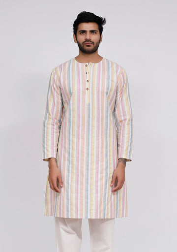 Presenting a classic and stylish long kurta from tjori. The slim-fit kurta is made from the finest cotton and is embellished with intricate Stripes. Full sleeves and a mandarin collar with detail work done on the yoke add to the...