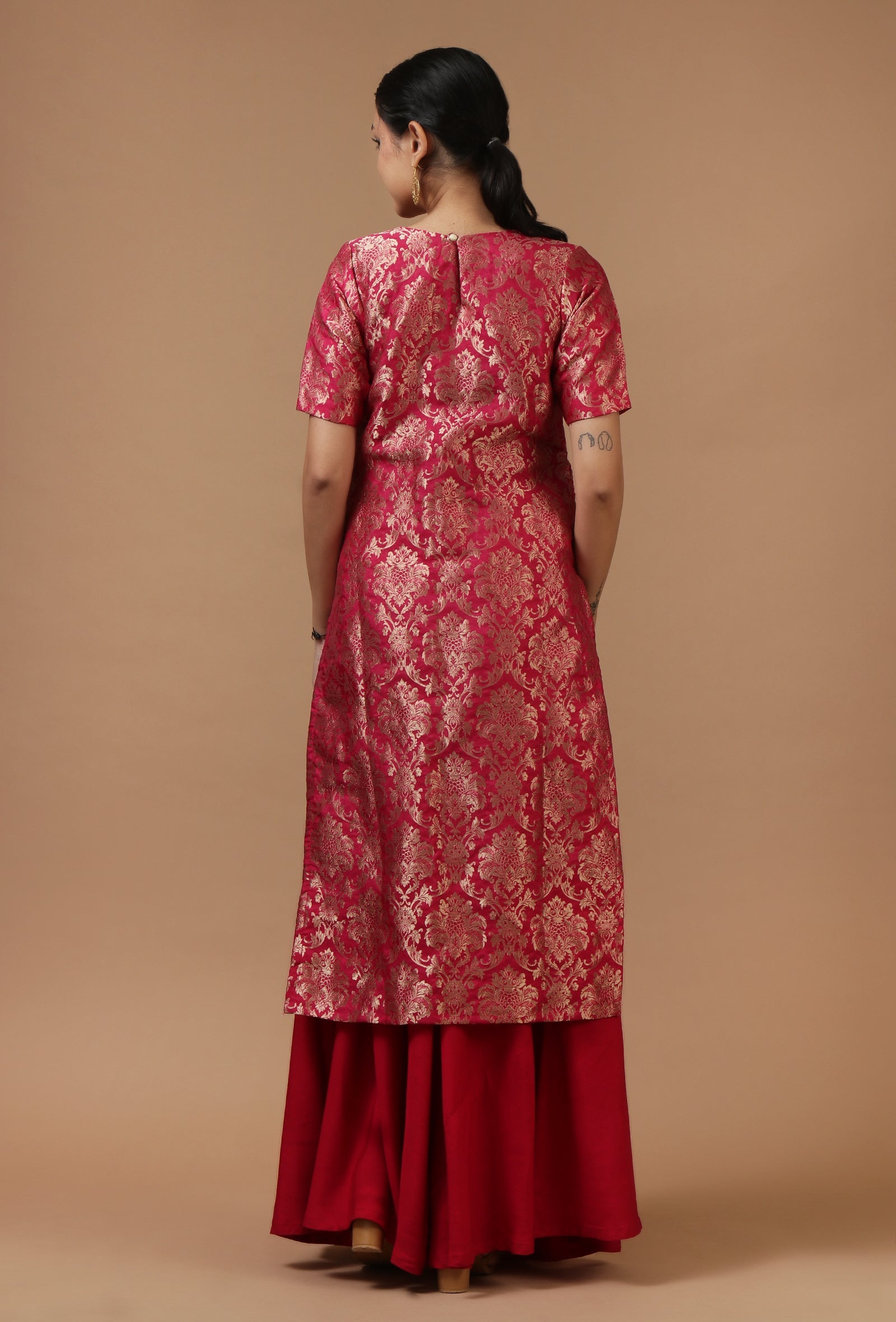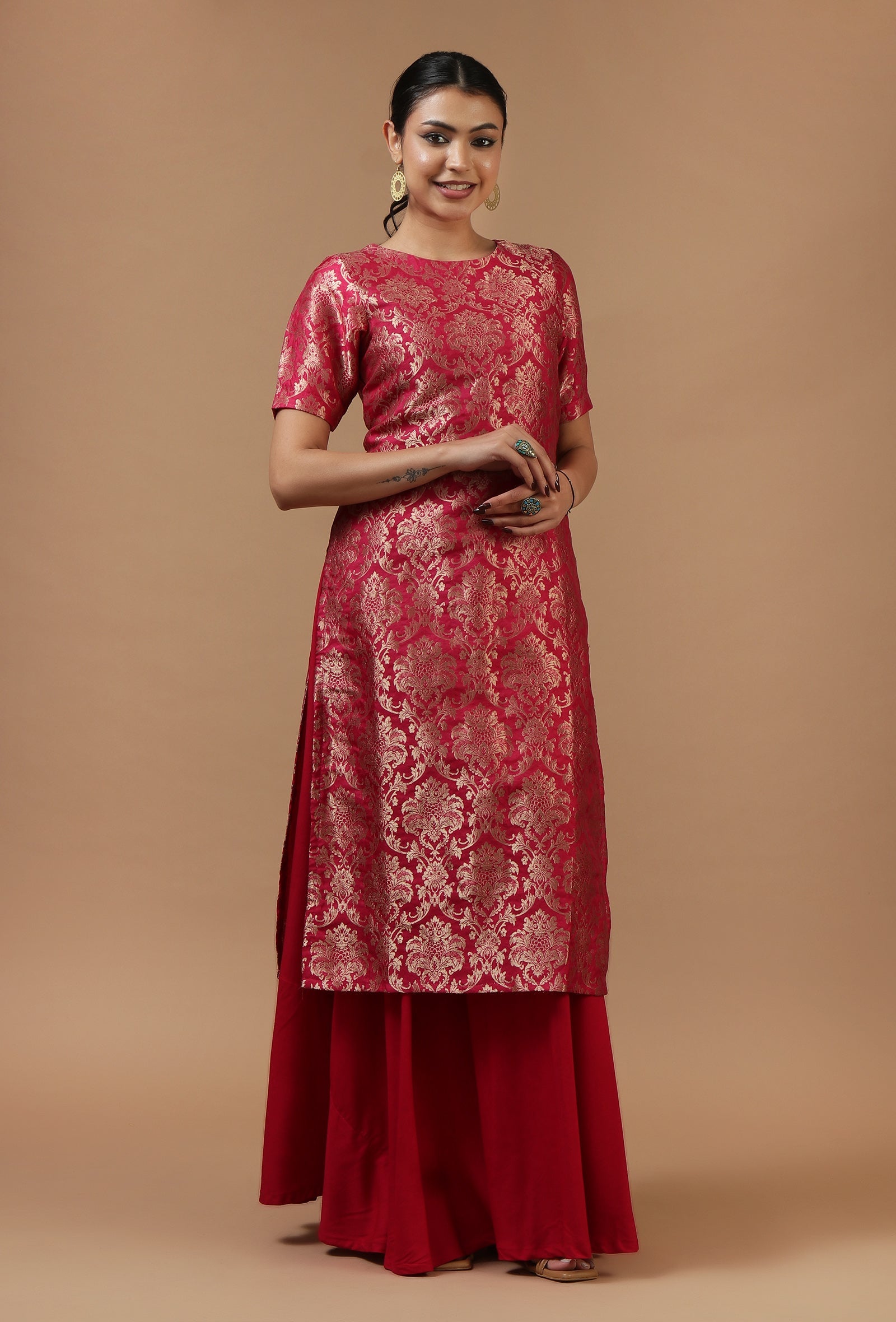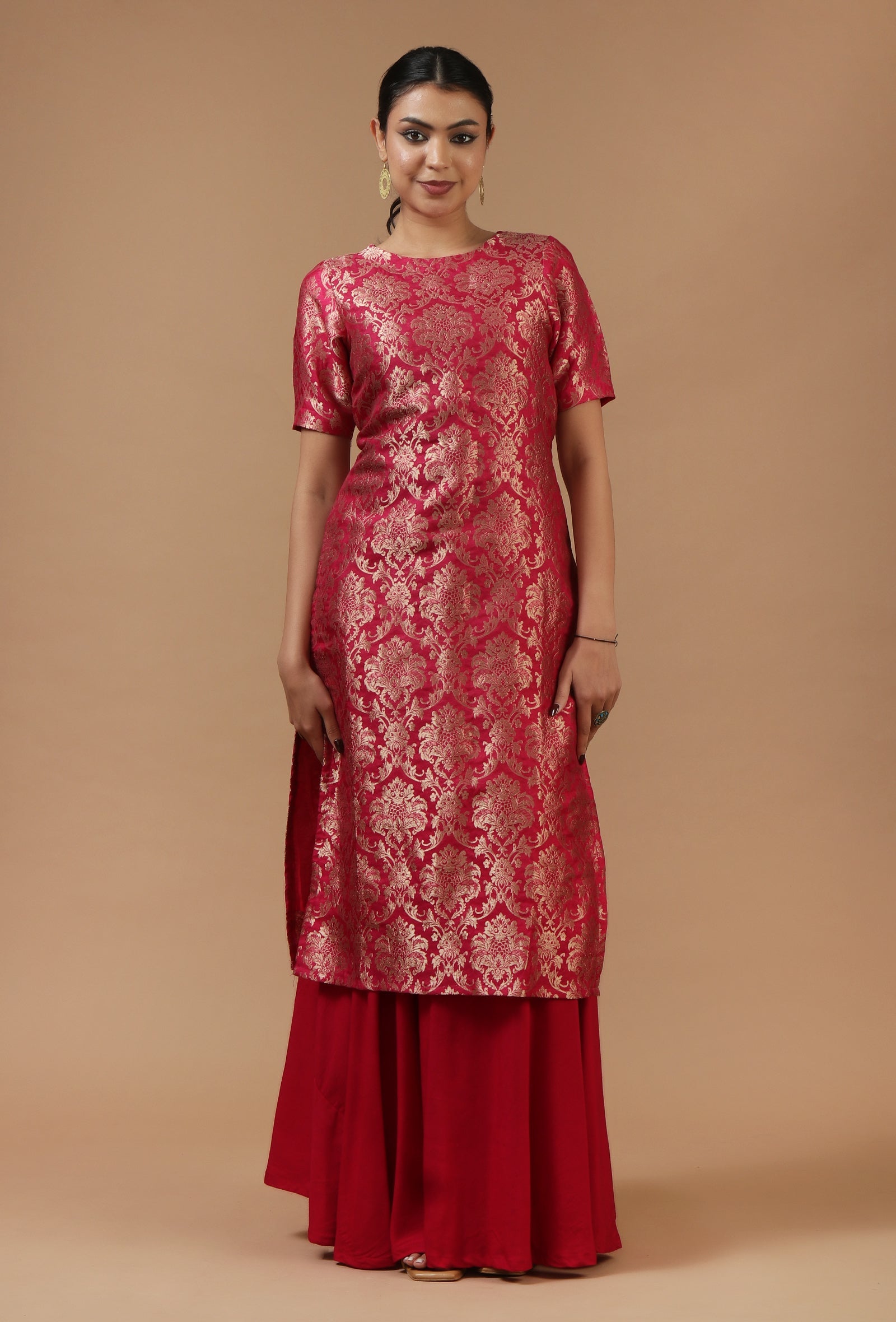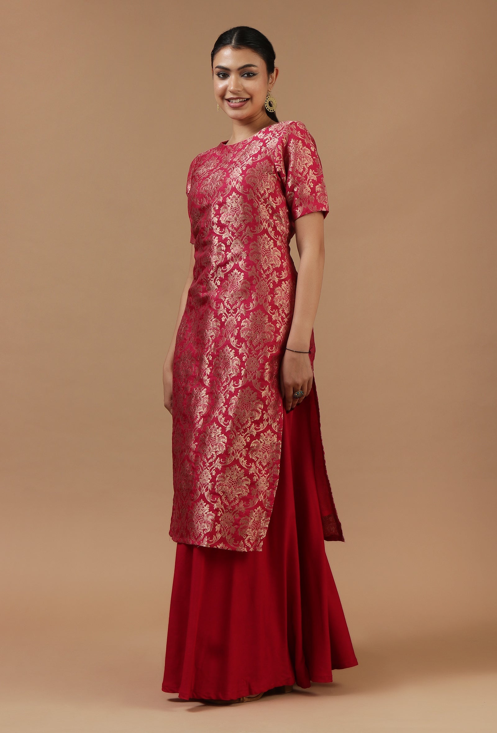 This elegant crimson kurta is crafted in rich Chanderi brocade fabric, featuring an all-over traditional woven floral pattern with a subtle sheen. The straight silhouette and short sleeves give it a refined festive appeal, making it ideal for weddings, celebrations, and special occasions.