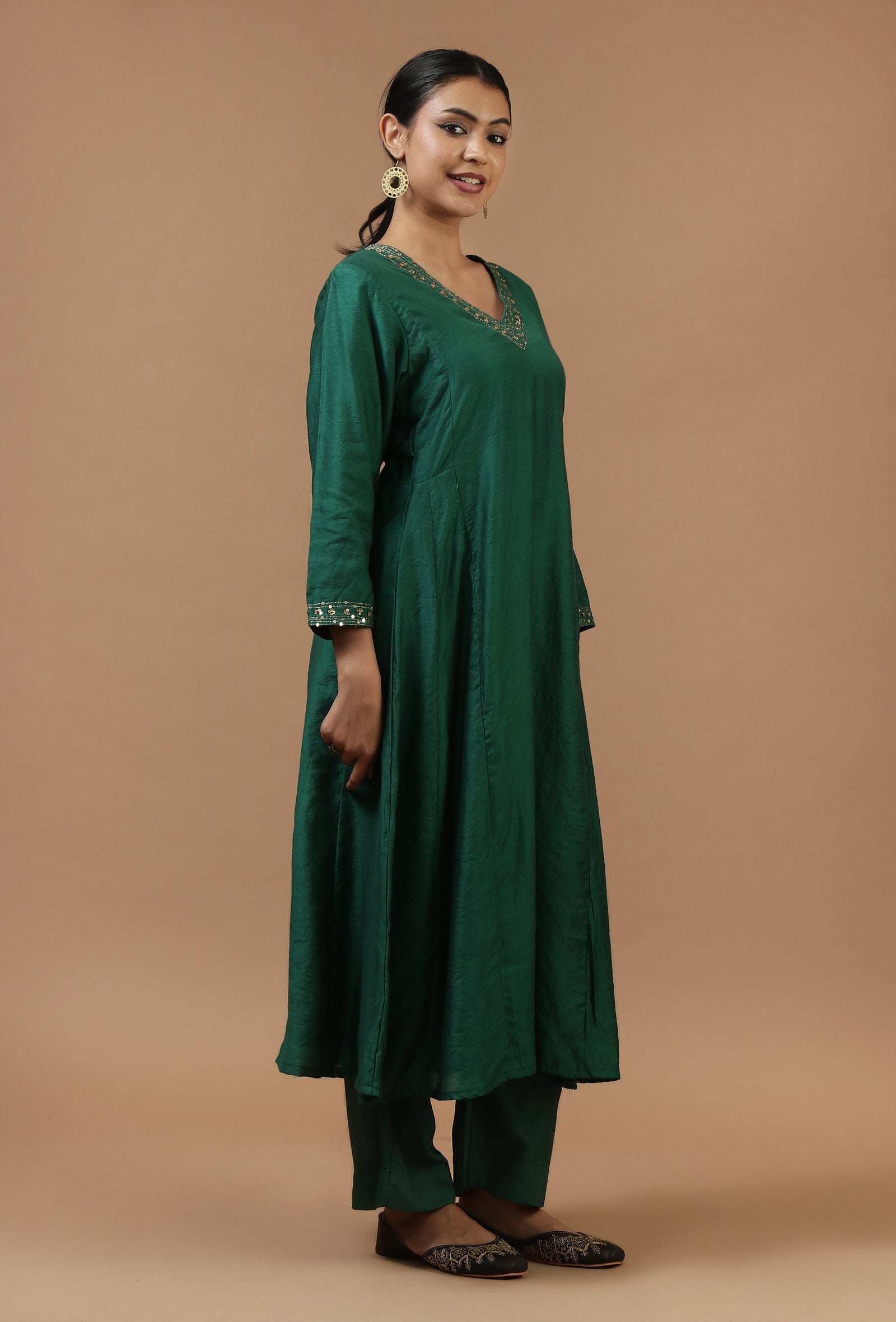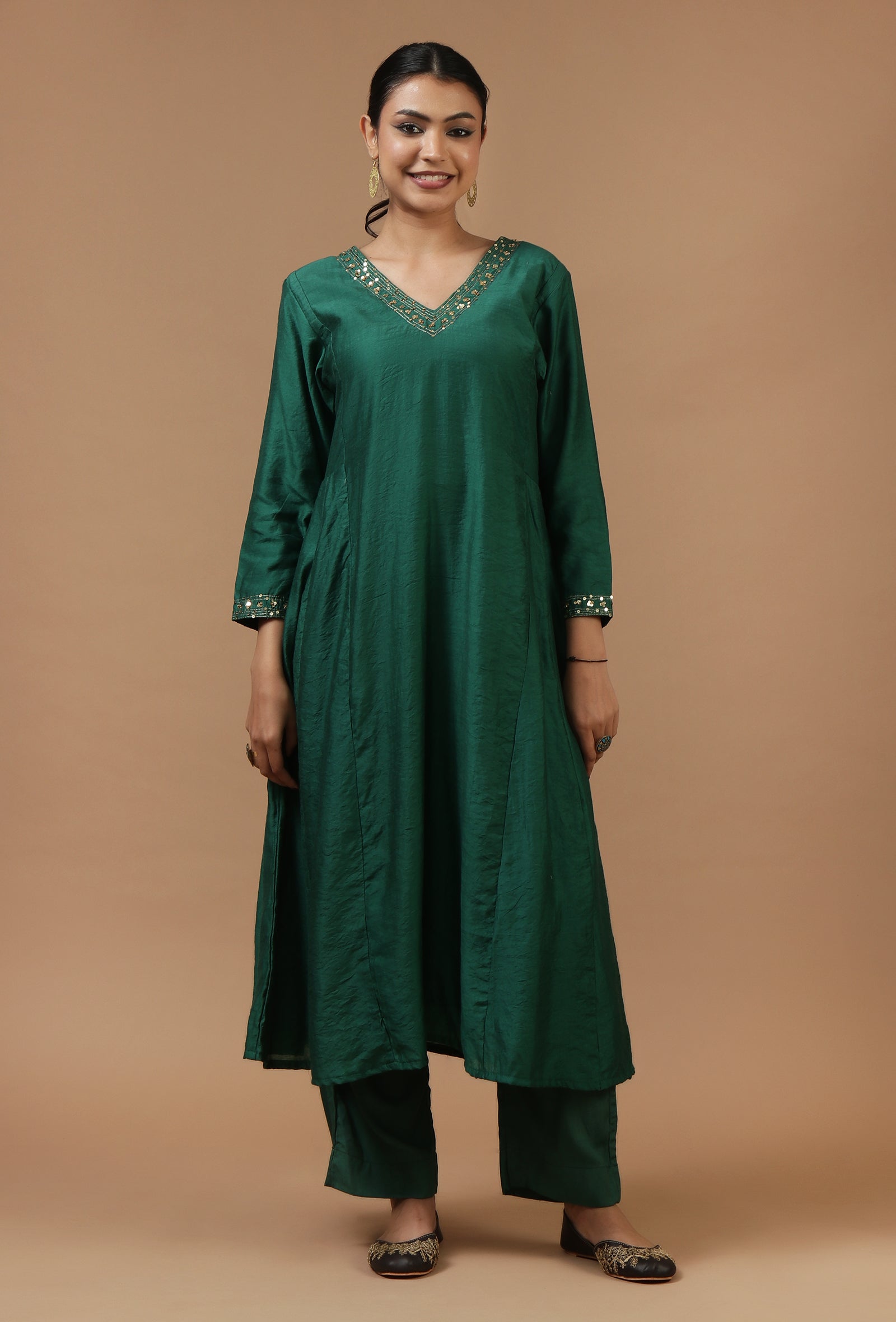 This emerald green kurta is crafted from premium Chanderi fabric, featuring a graceful flared silhouette. The V-neckline and sleeve cuffs are highlighted with subtle embellishment, adding a refined festive touch. Lightweight and elegant, this kurta is perfect for celebrations and special occasions.