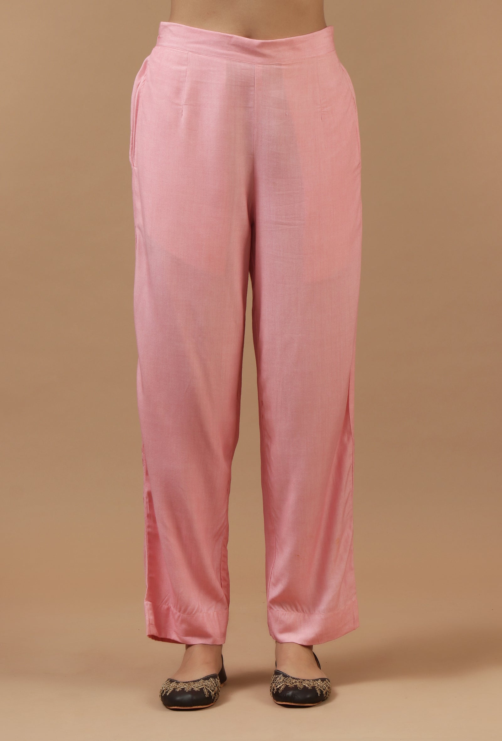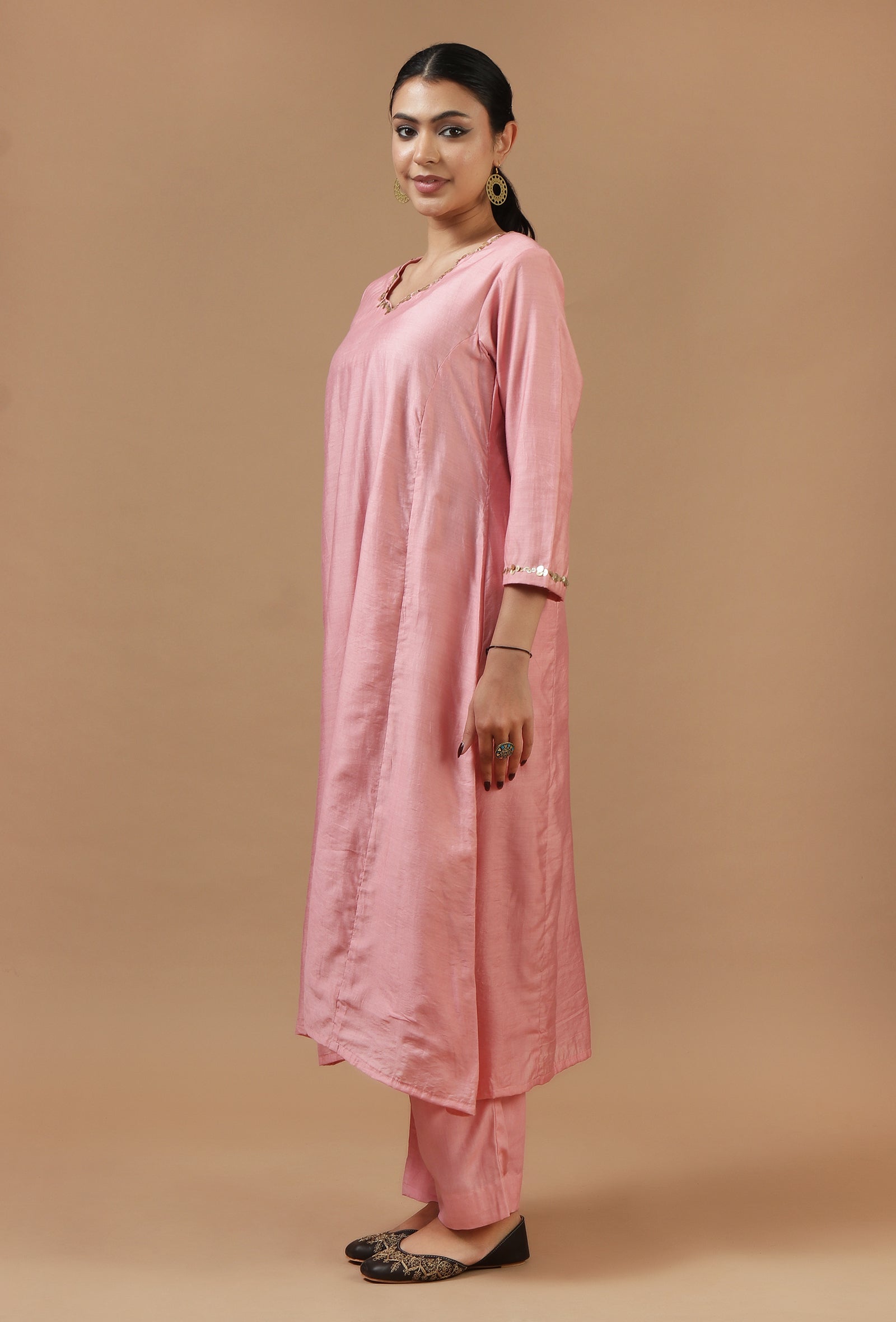 This elegant blush pink kurta set features a soft Chanderi A-line kurta highlighted with delicate embellishment on the neckline and sleeves, paired with a comfortable Shantoon straight pant for a refined, festive and everyday look.