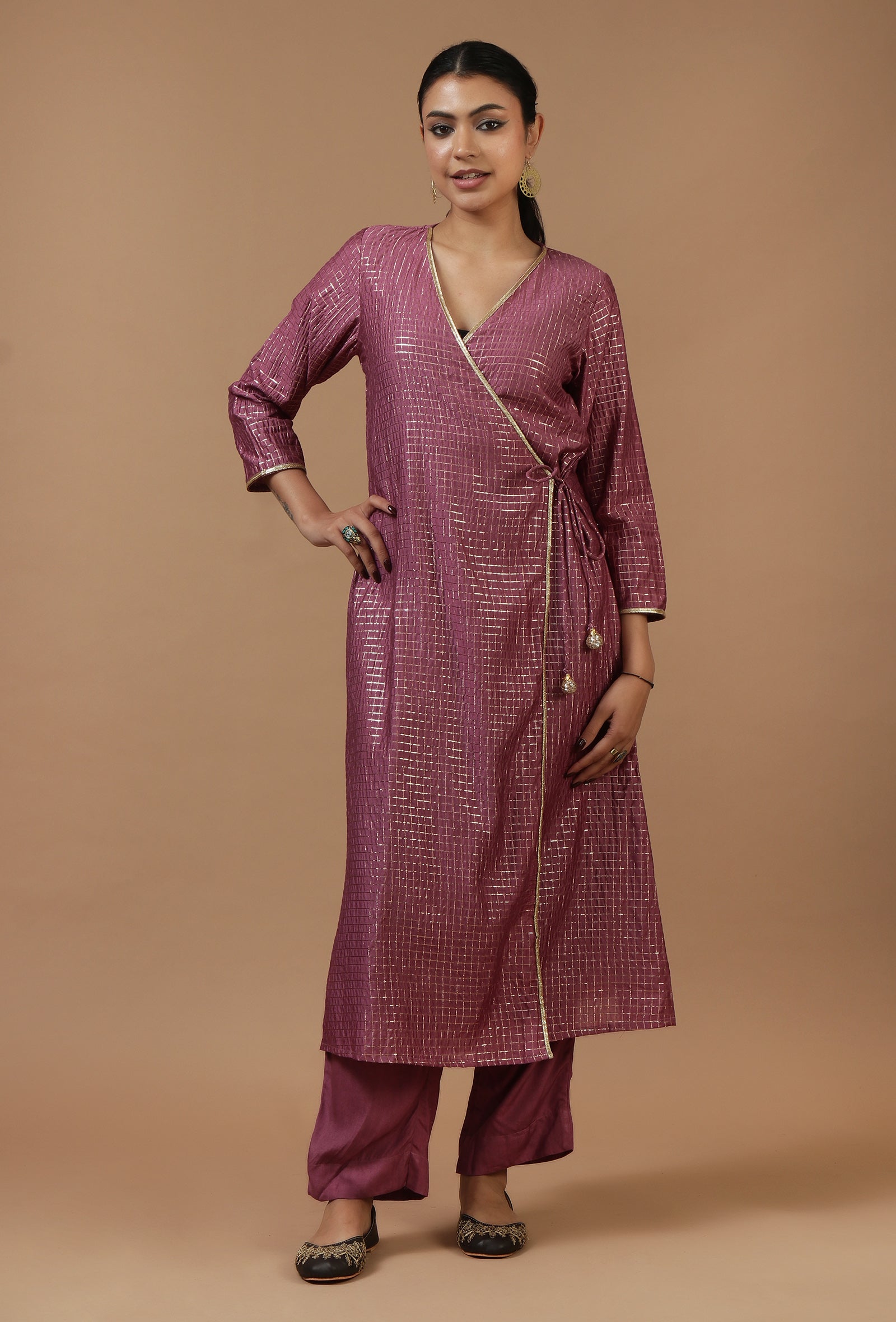 This elegant set of 2 features a wine checkered Chanderi kurta paired with a matching Shantoon straight pant. Designed with a flattering V-neck wrap-style detailing and subtle woven checks, this ensemble offers a refined, festive, and occasion-ready ethnic look.
