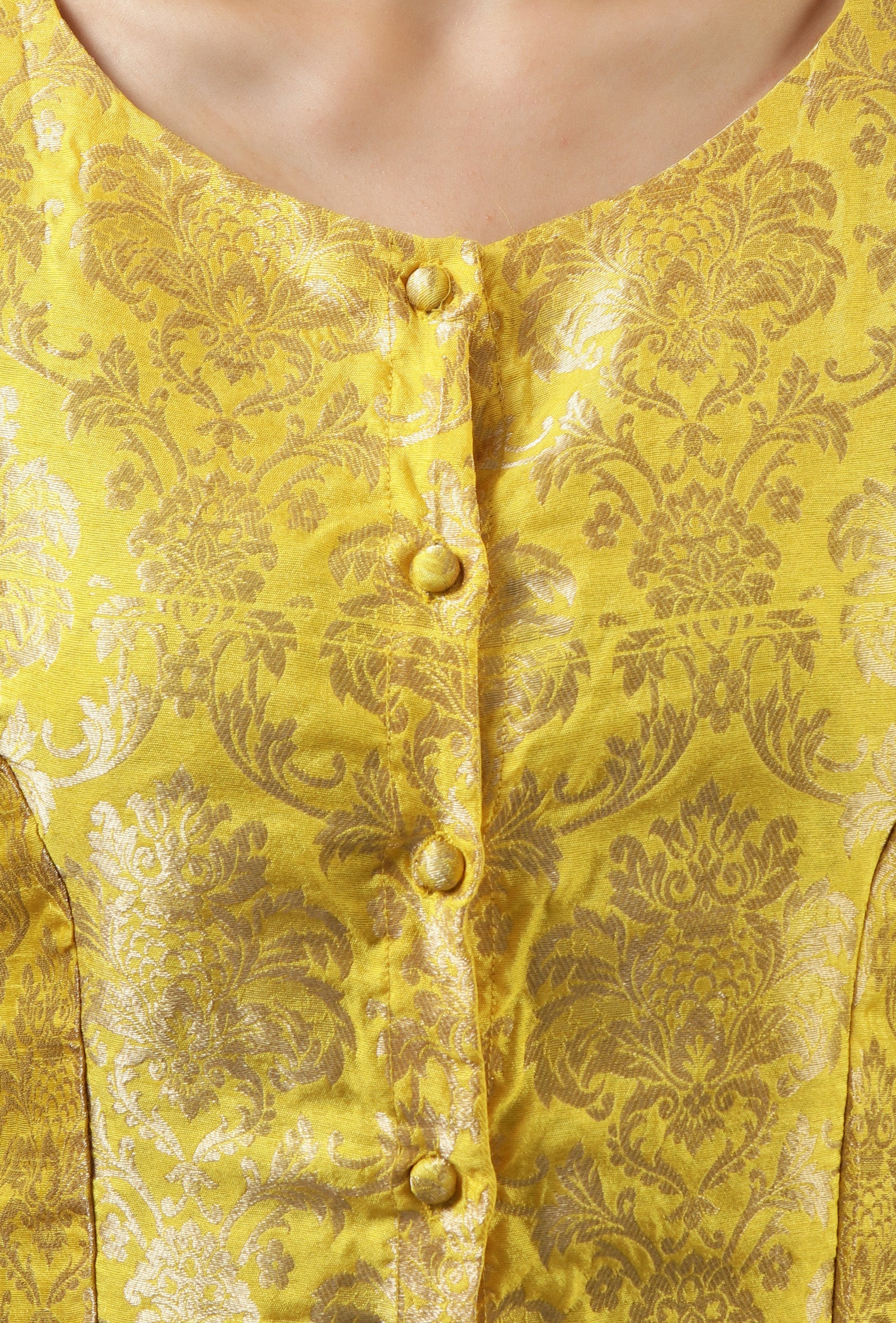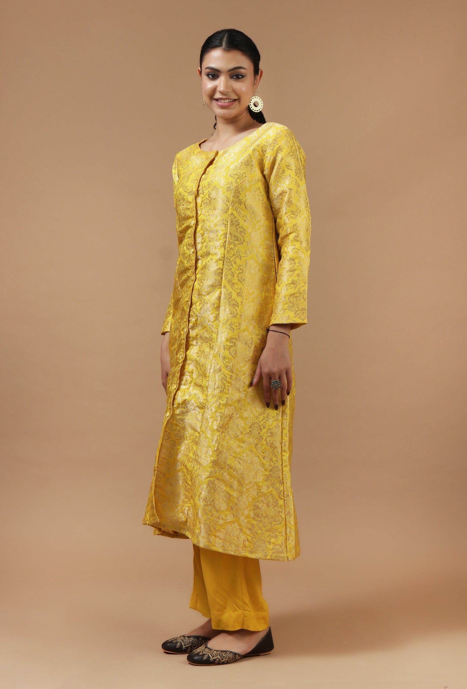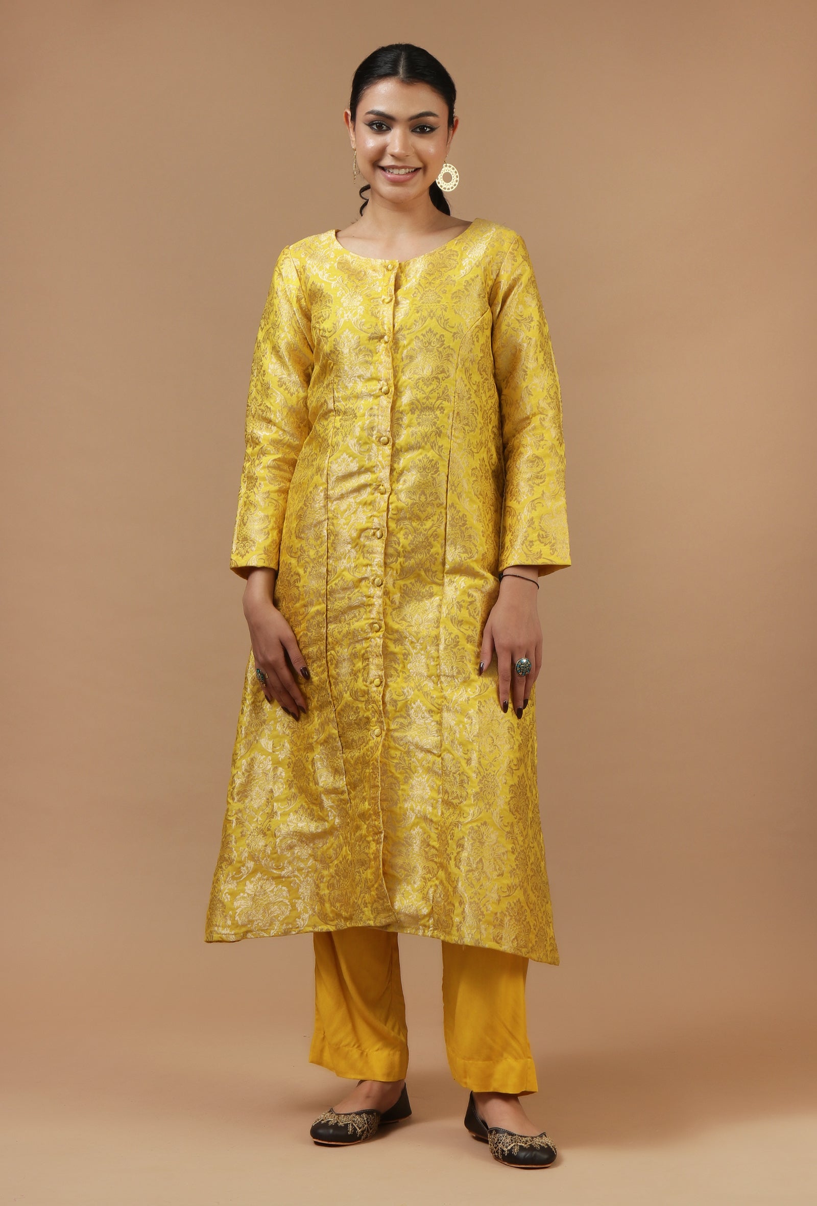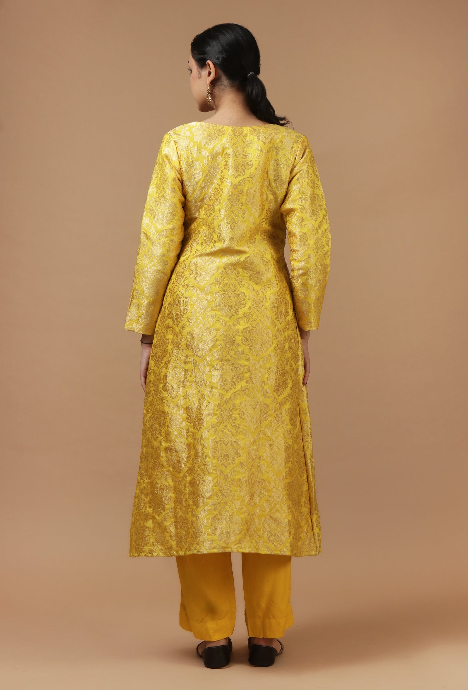 This elegant set of 2 features a mustard brocade kurta paired with a matching pant. Crafted in rich woven brocade, the kurta showcases a subtle floral pattern with a classic button-down front, offering a refined, festive and occasion-ready look.