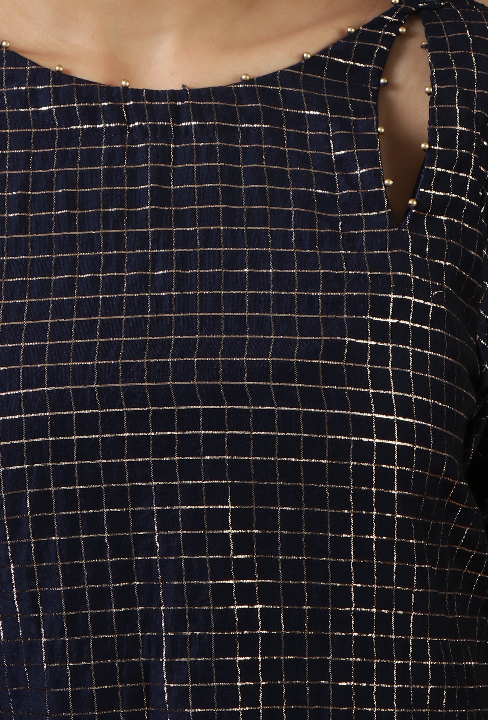 This elegant set of 2 features a navy checkered Chanderi kurta paired with a solid Shantoon straight pant. The kurta showcases a subtle woven check pattern with a soft sheen, enhanced by a classic round neckline and three-quarter sleeves. Designed for comfort and effortless elegance, this ensemble is perfect for festive occasions, office wear, and refined everyday styling.