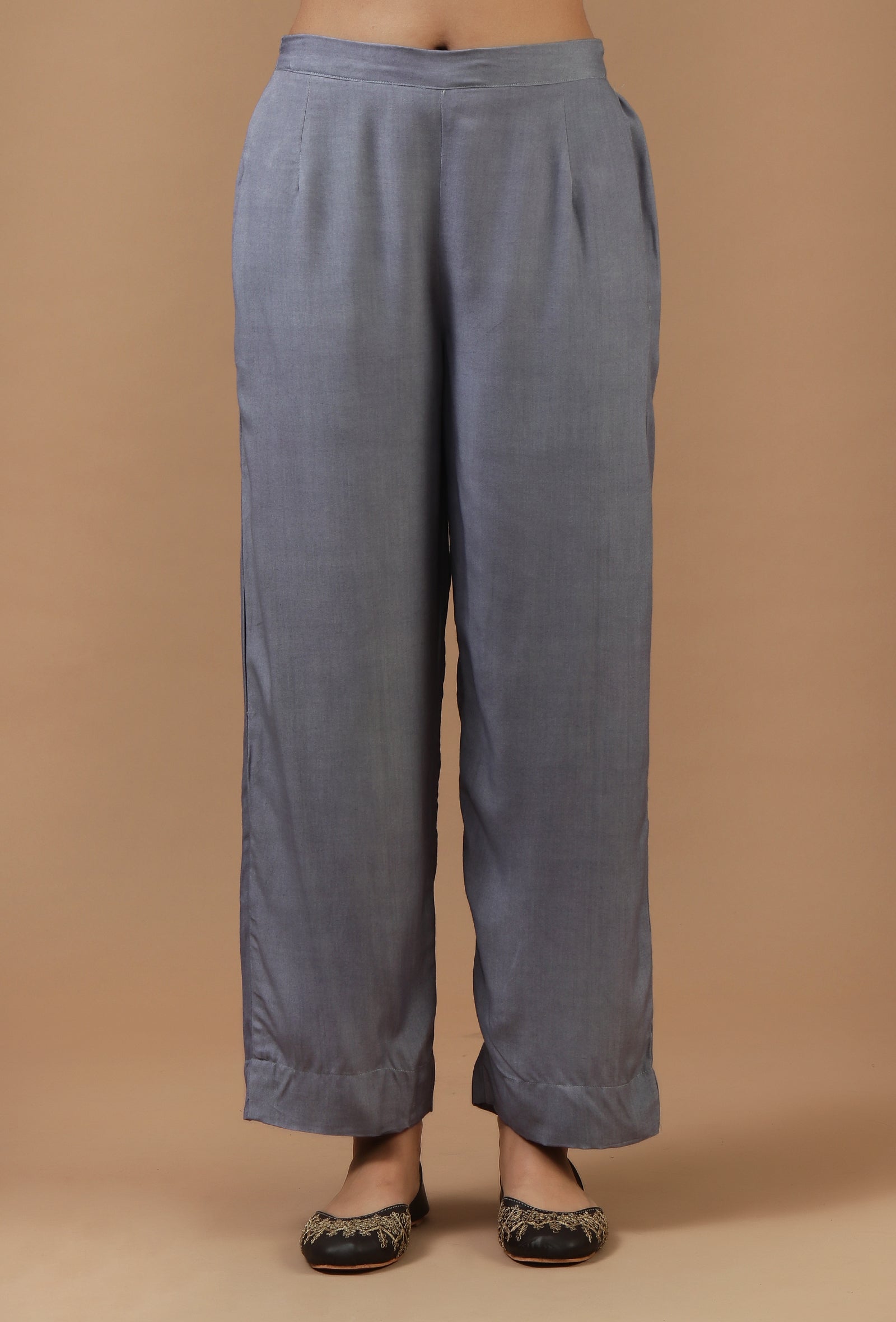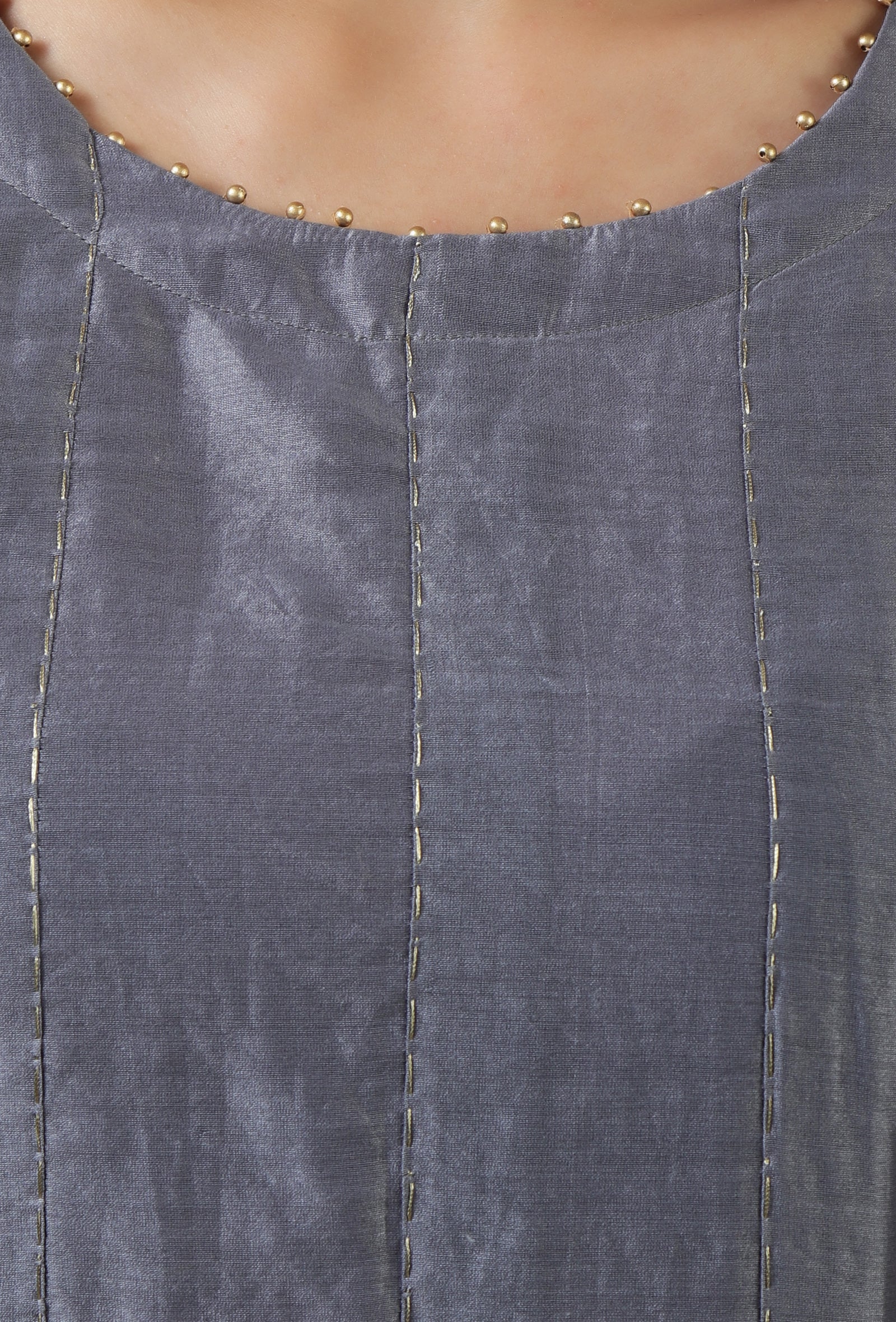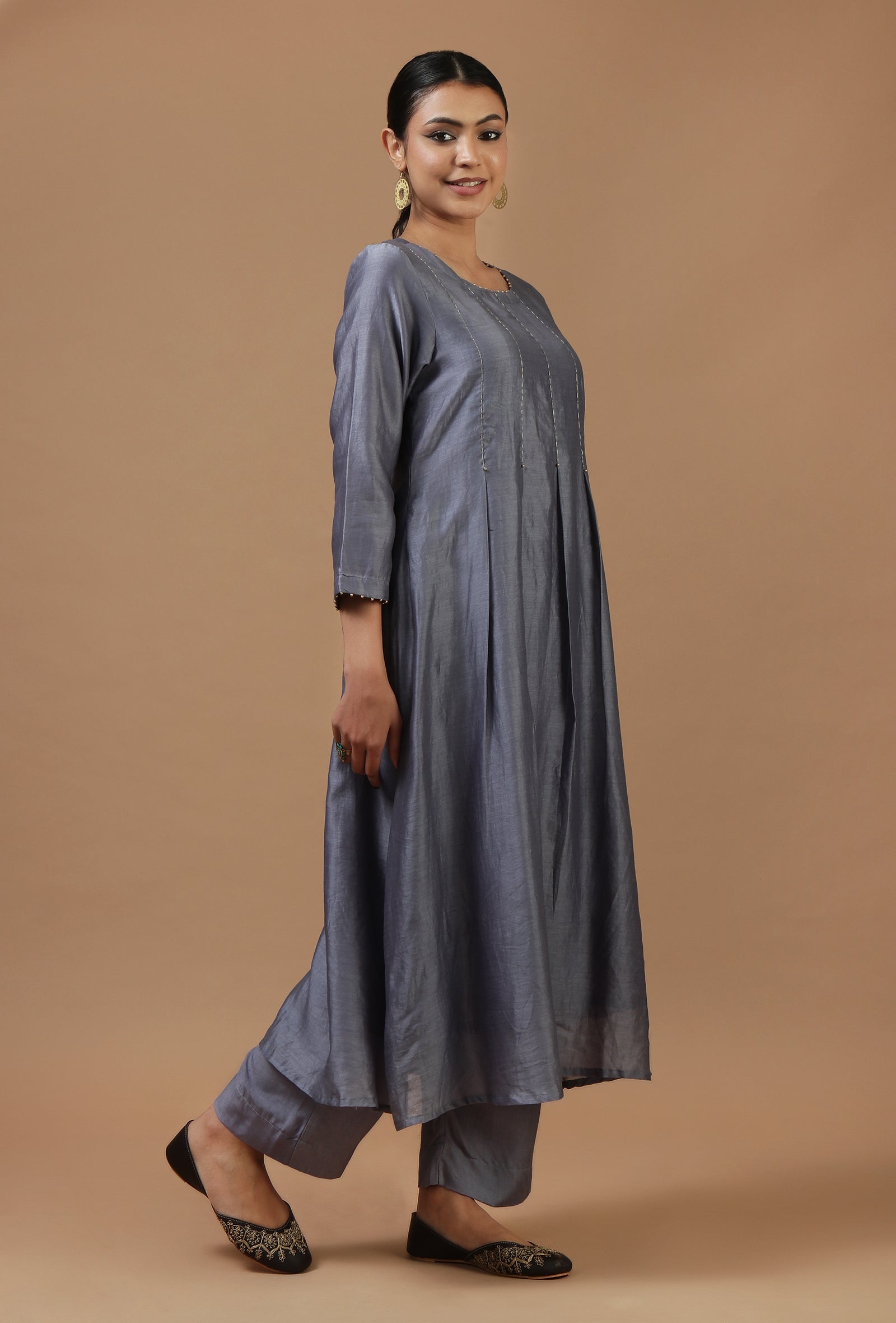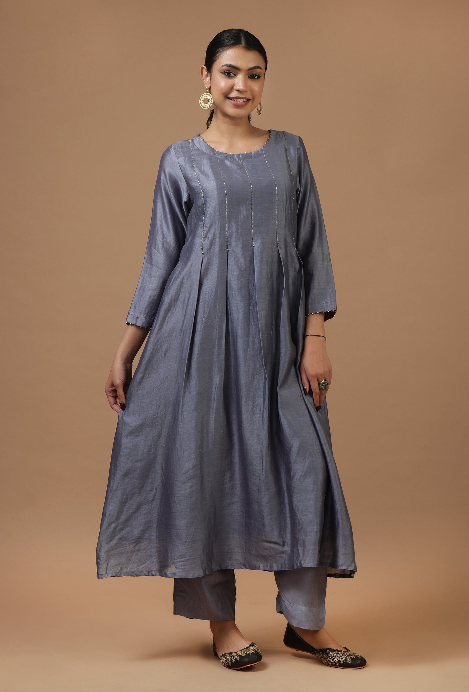 Set of 2: Steel Grey Chanderi Pleated Kurta with Matching Pant Set