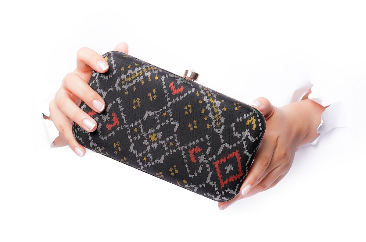Step out strutting like a diva in this abstract modern patola printed clutch from Tjori. Carry this statement clutch to make a personal style statement on your day out!