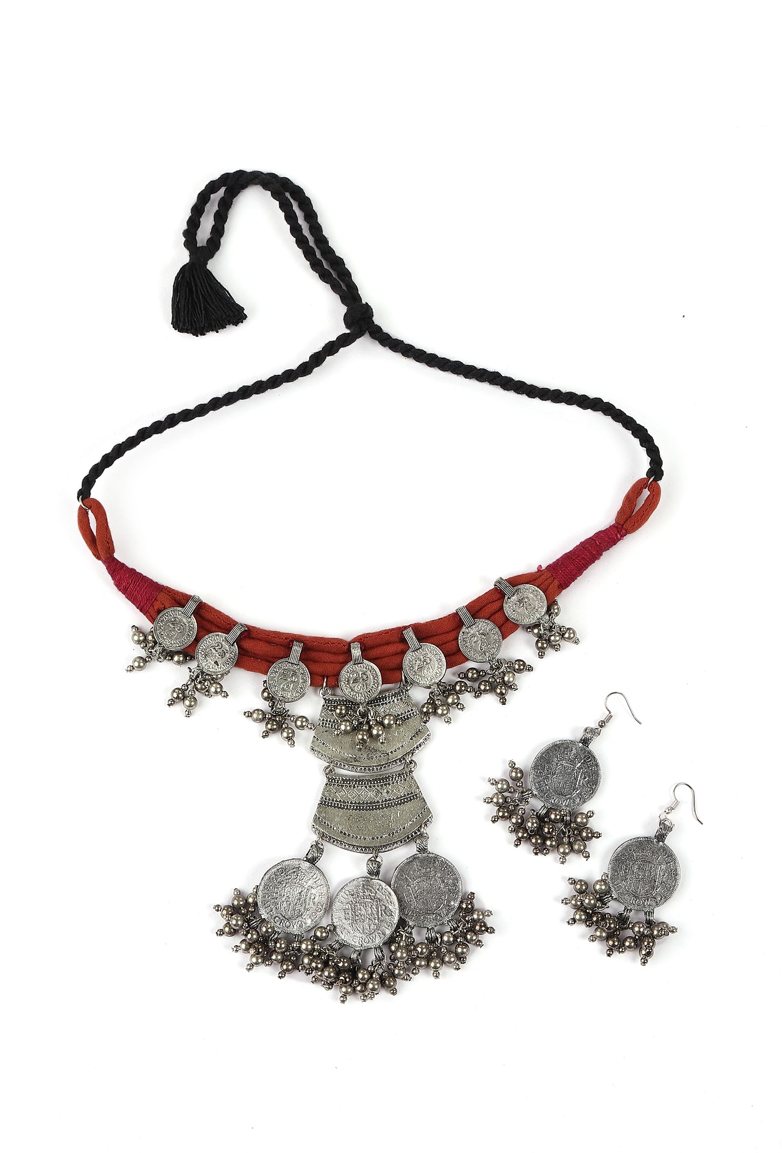 Red Thread & German Silver Tribal Coin Choker & Earrings Set