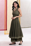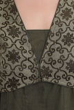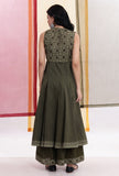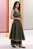 Style your festive look with this edgy olive green sheer brasso organza add-on overlay for a striking look. Tailored short, this sleeveless overlay has front-closure and beautiful detailing all over.