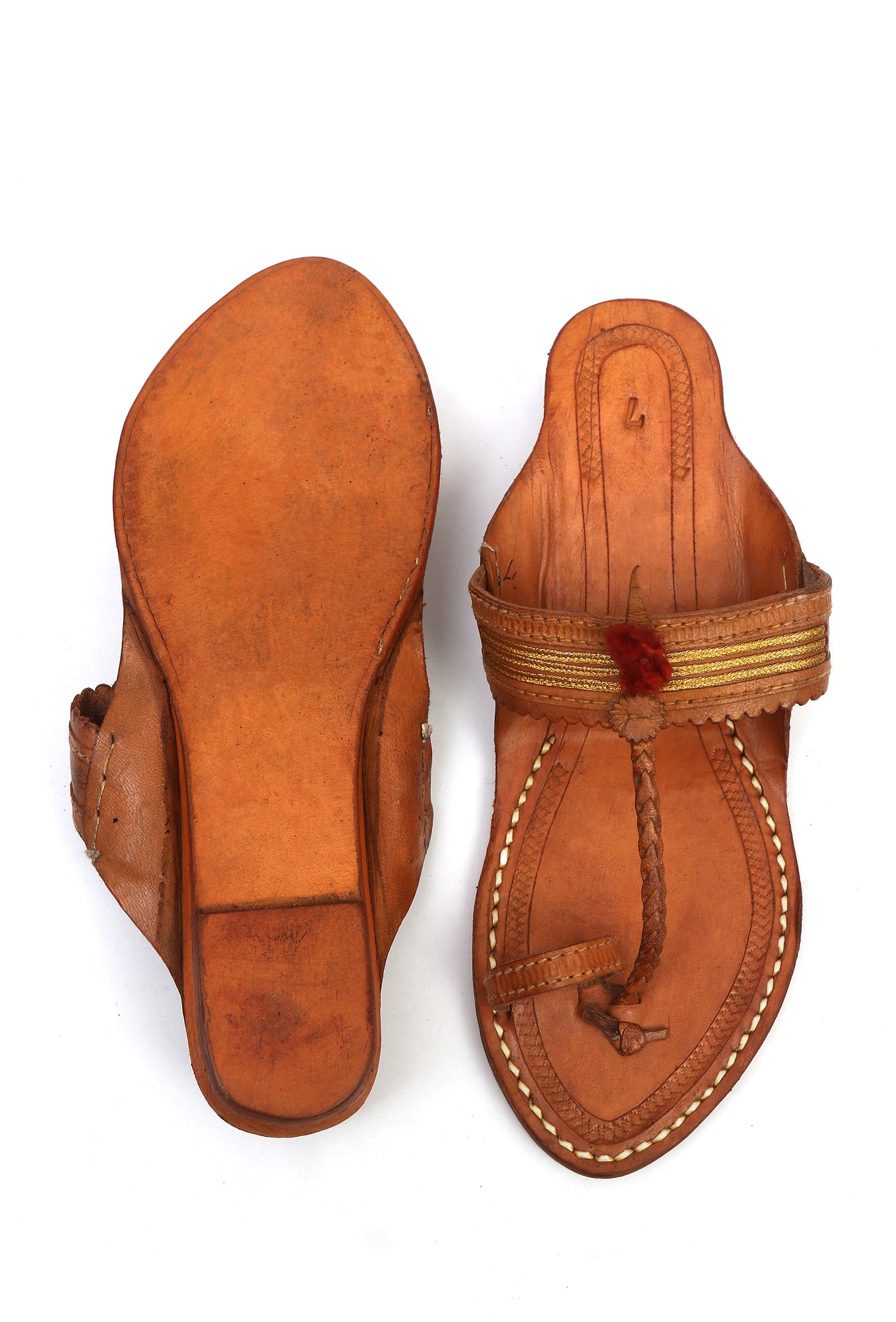 Inspired by twilight hues, these handcrafted Kolhapuri sandals feature a refined golden strap with a classic toe-ring silhouette. Blending traditional craftsmanship with understated elegance, they elevate festive looks and add graceful charm to everyday ethnic wear.