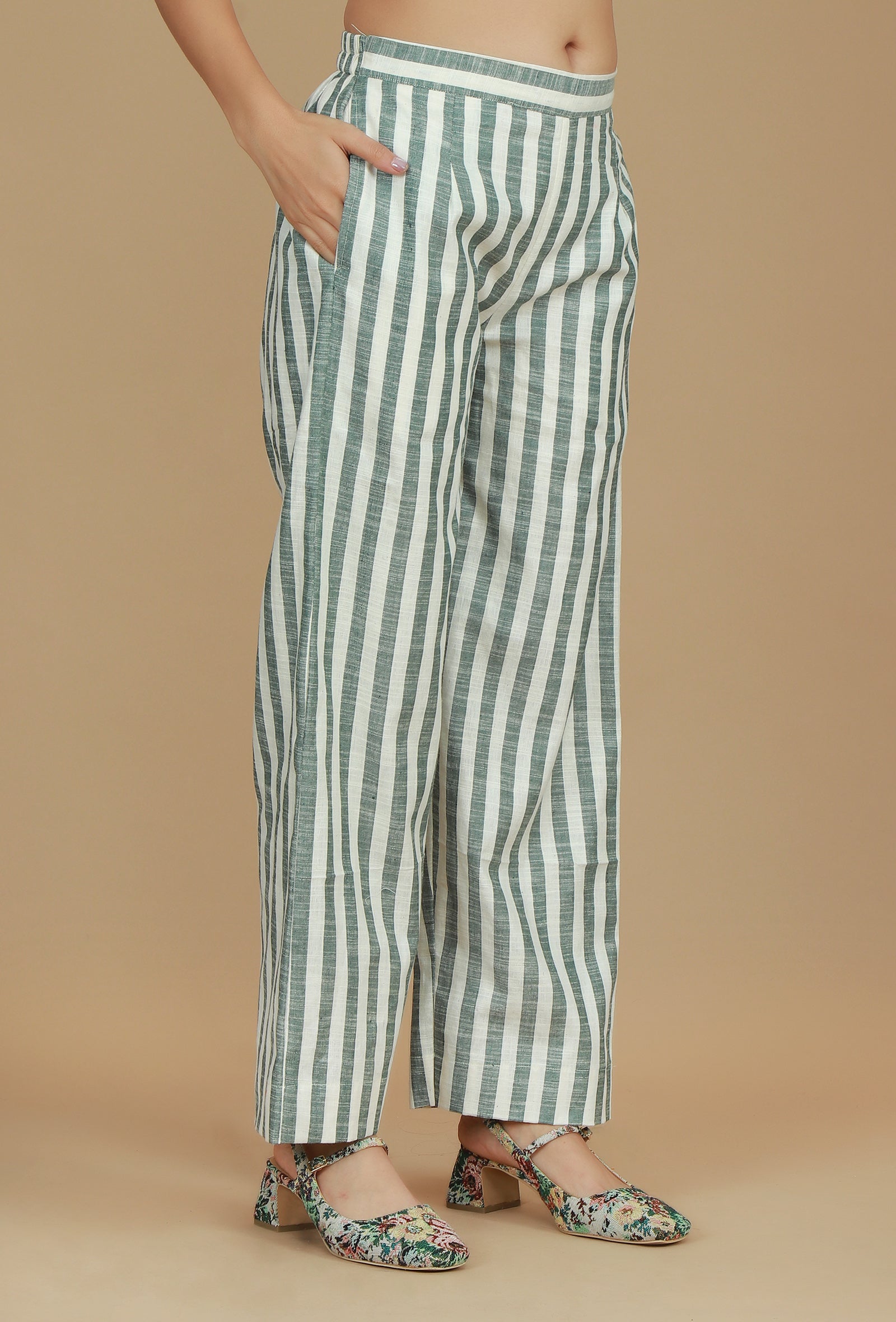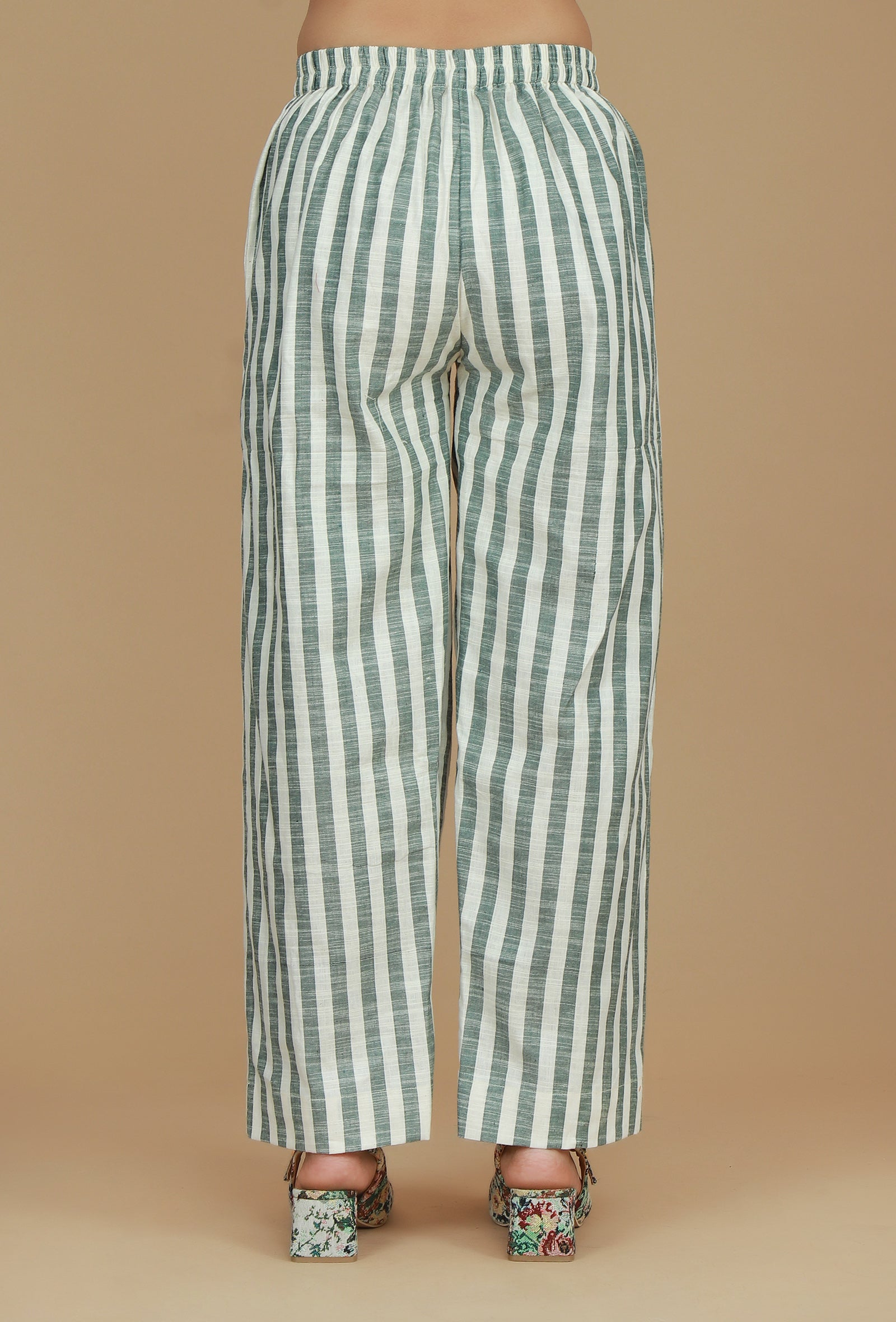 Green & White Striped Cotton Pants