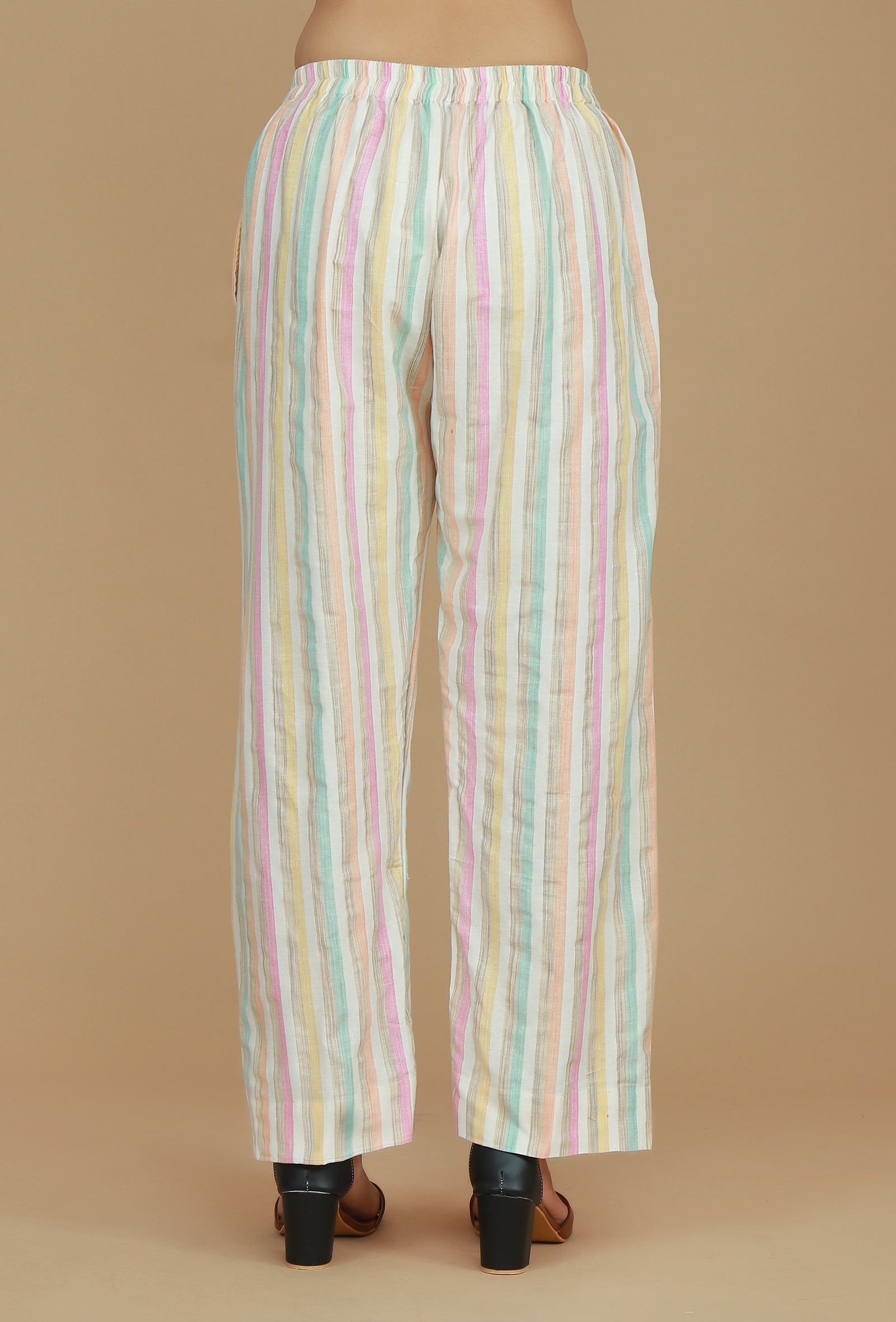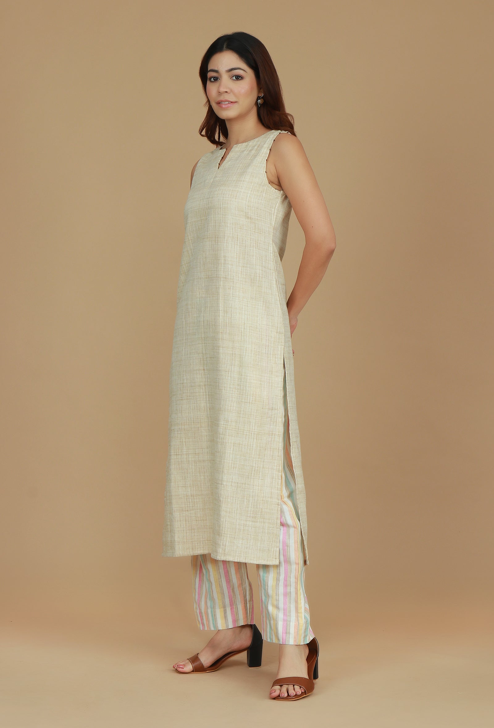 A subtle and stylish set featuring a sleeveless beige cotton khadi kurta paired with multicolor striped cotton viscose pants. The kurta’s textured weave and side slits offer comfort and elegance, while the pastel stripes on the pants add a refreshing, modern touch — perfect for everyday sophistication.