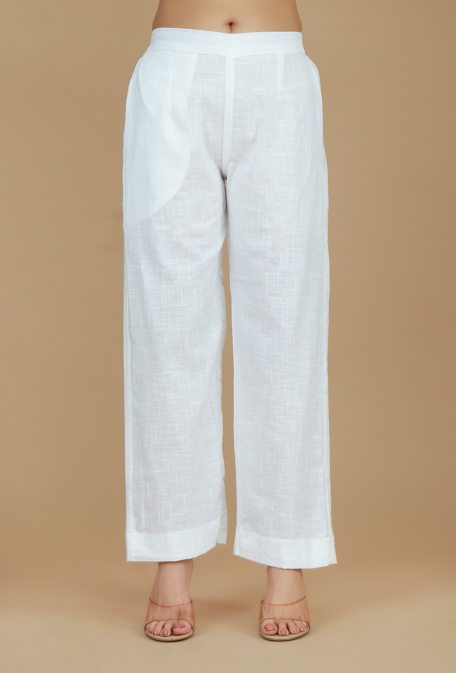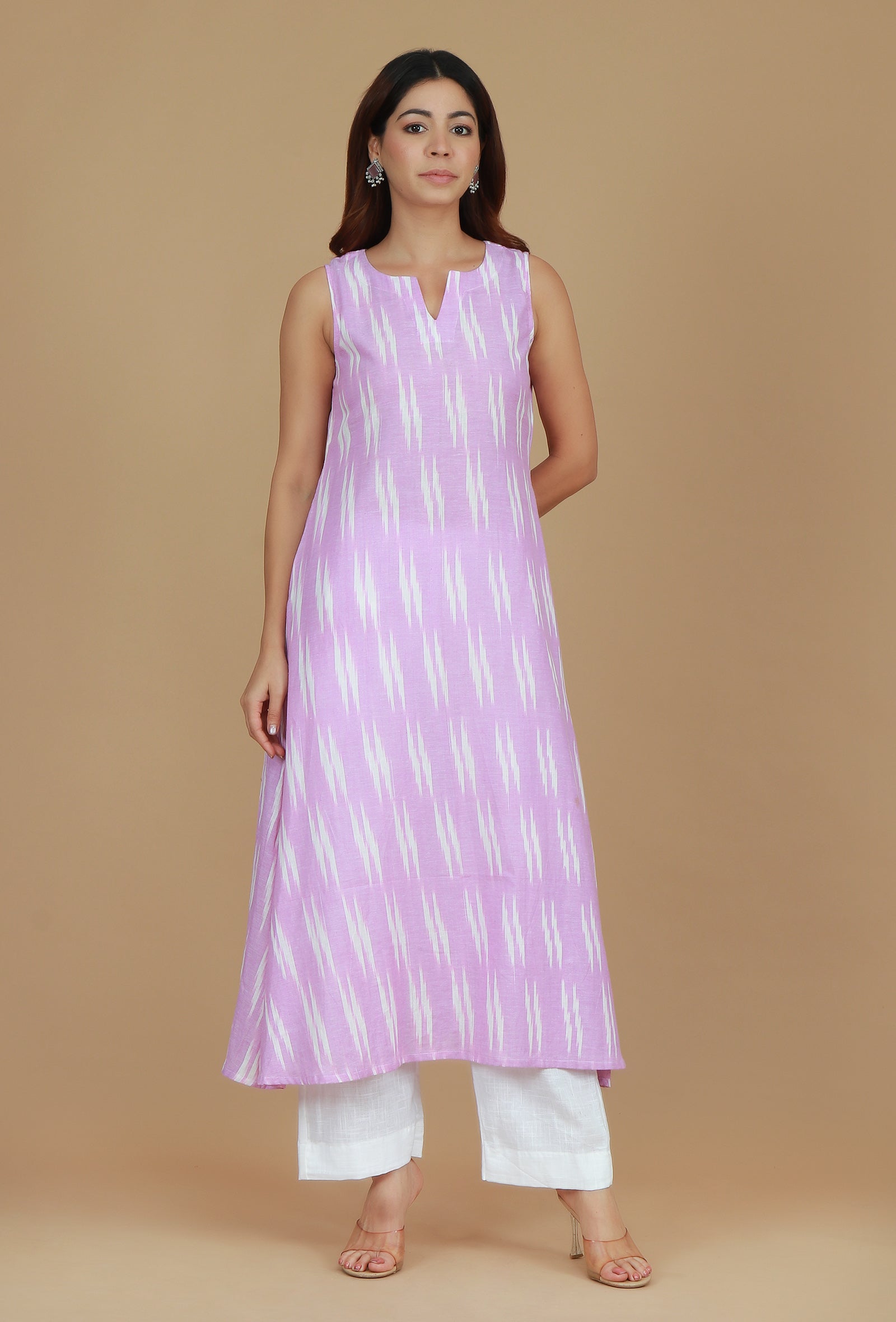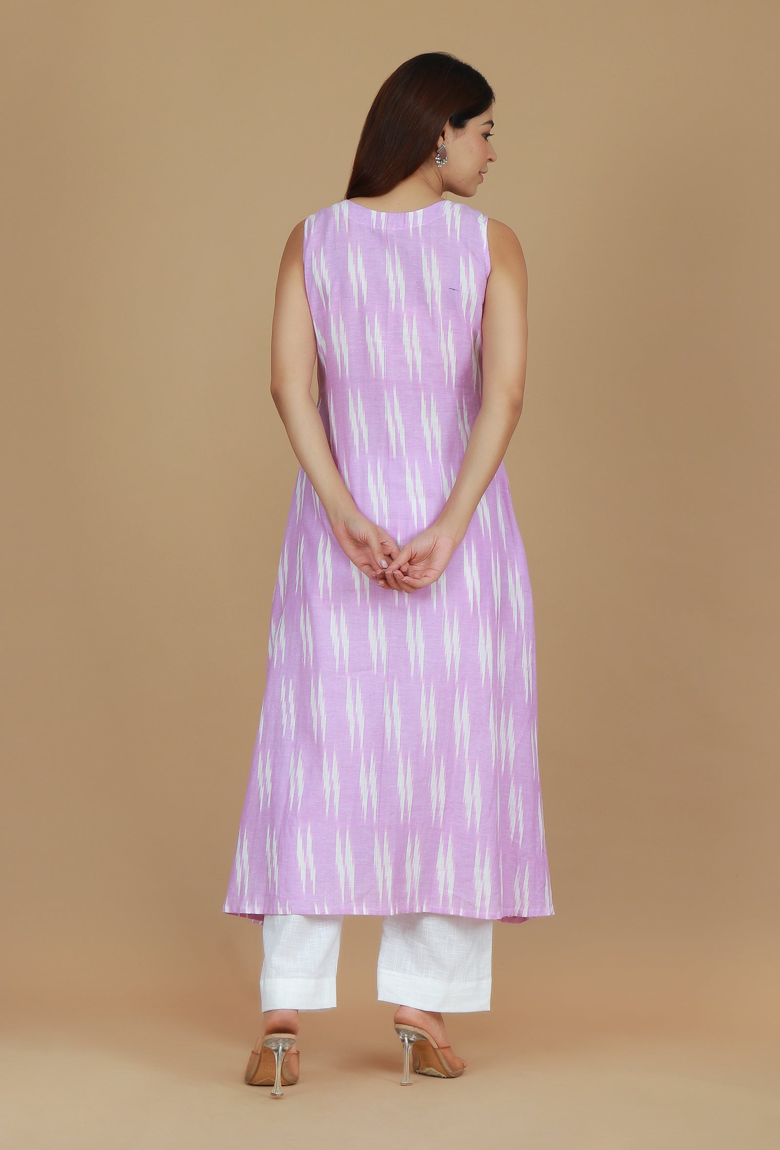 A soothing and elegant ensemble featuring a lavender Ikat cotton kurta paired with crisp white pants. The sleeveless kurta is styled with a notch neckline and a straight flared silhouette, offering a breezy yet sophisticated look — perfect for everyday elegance or casual gatherings.