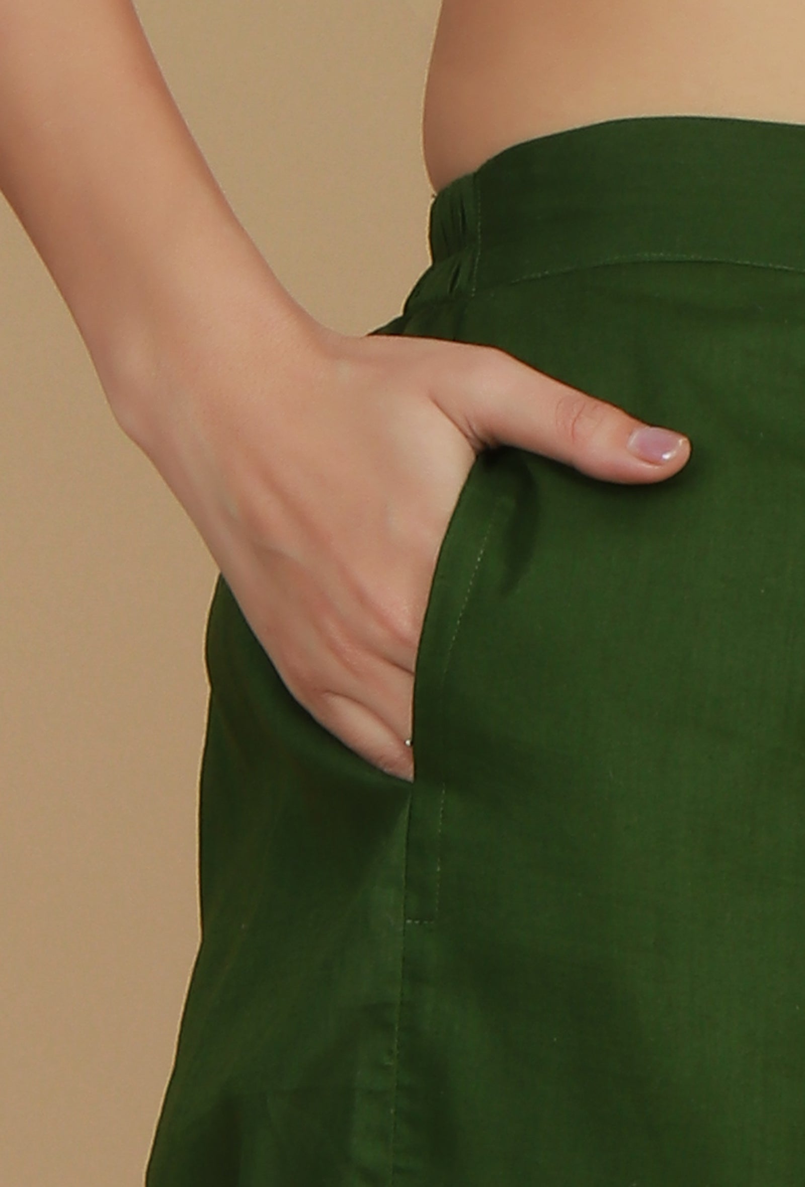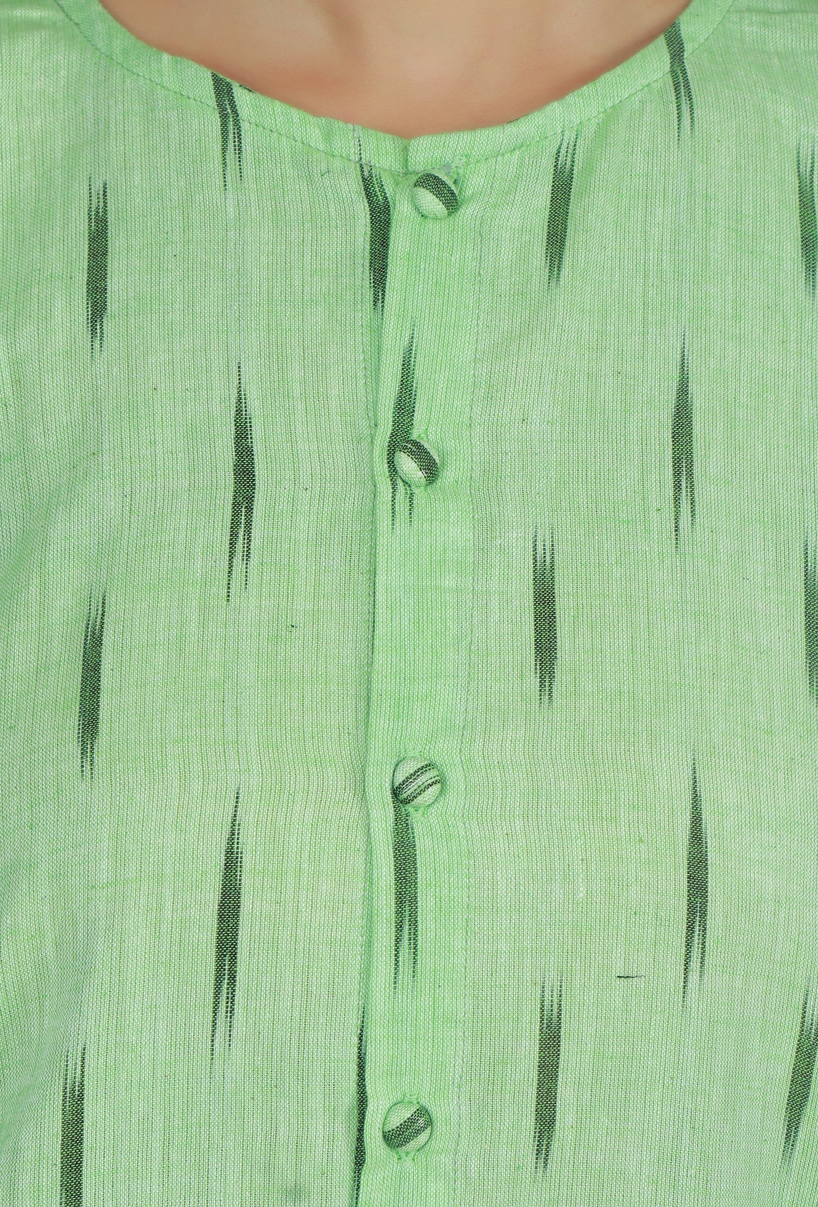 A stylish set crafted from breathable cotton fabric. The light green kurta features a beautiful Ikat weave pattern with a button-down front and long sleeves, creating a smart and elegant appeal. It pairs perfectly with solid dark green straight pants, offering a balanced and refreshing look for daywear or casual outings.
