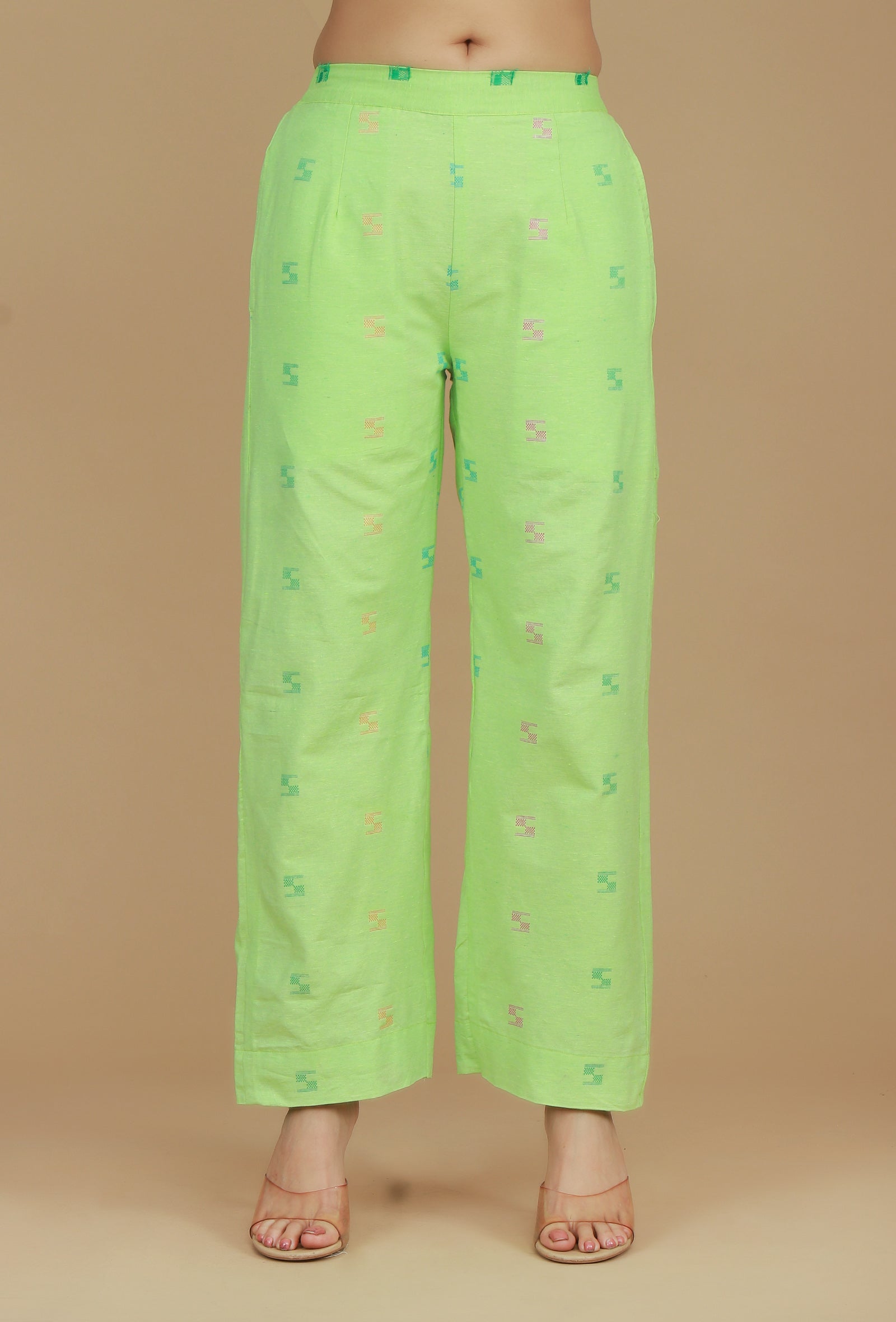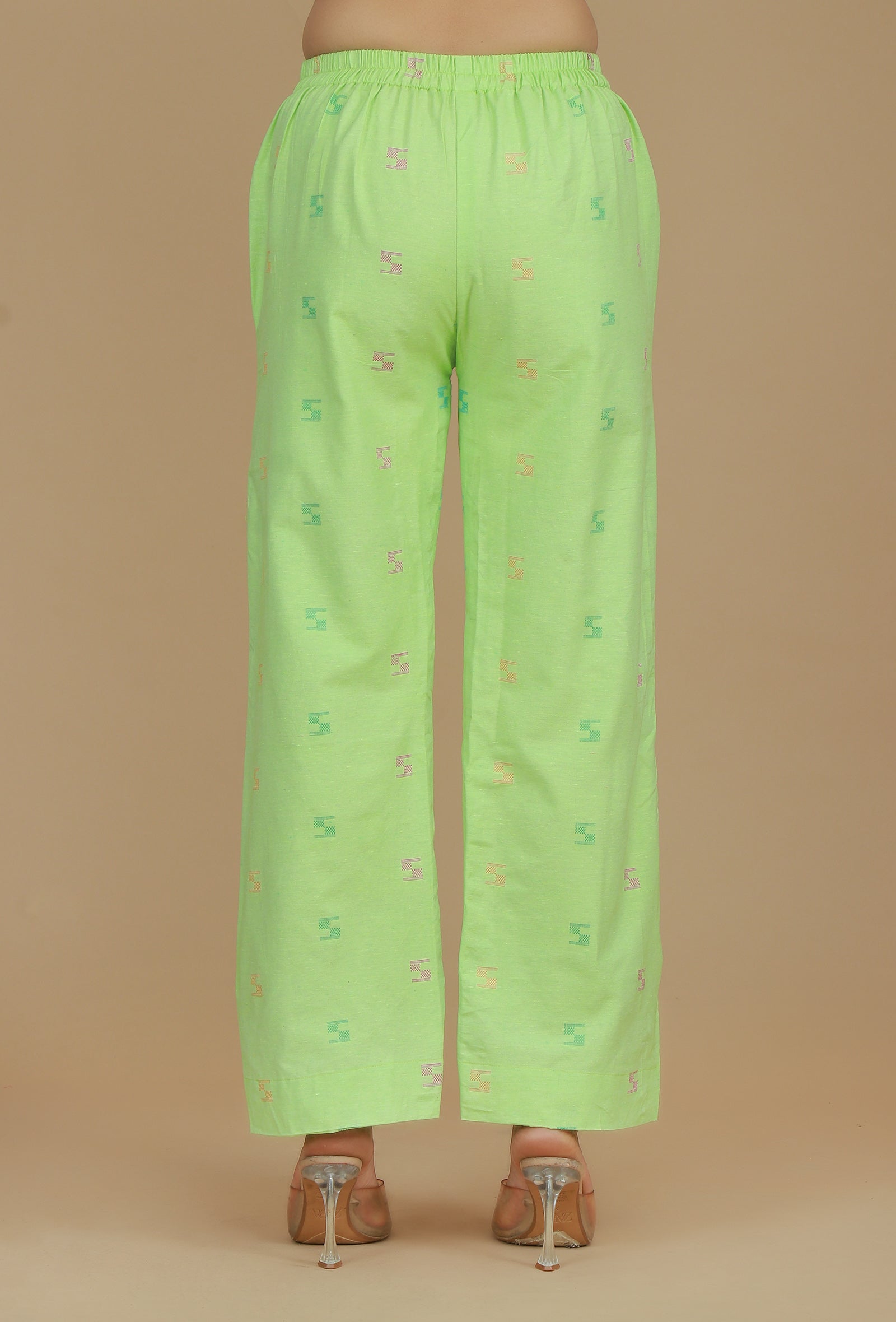 This refreshing set of 2 features a lime green sleeveless kurta crafted in breathable cotton viscose fabric with multicolor vertical stripes and a button-down front. Paired with matching lime green pants adorned with delicate booti embroidery, this ensemble is perfect for casual daywear or summer outings. The soft fabric and soothing hues add charm and comfort to your look.