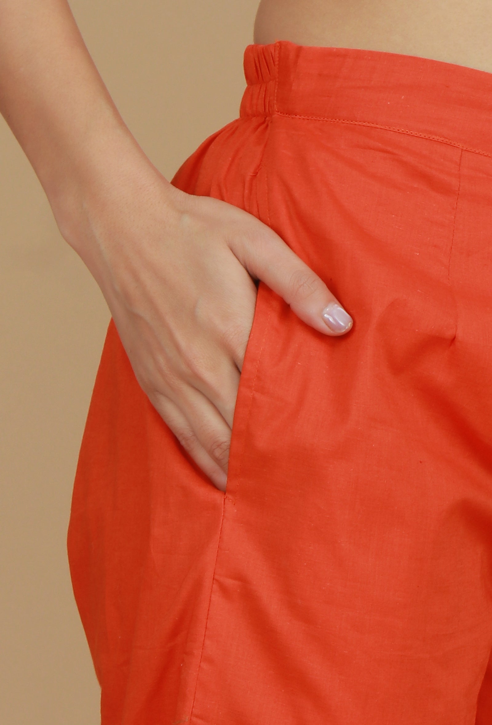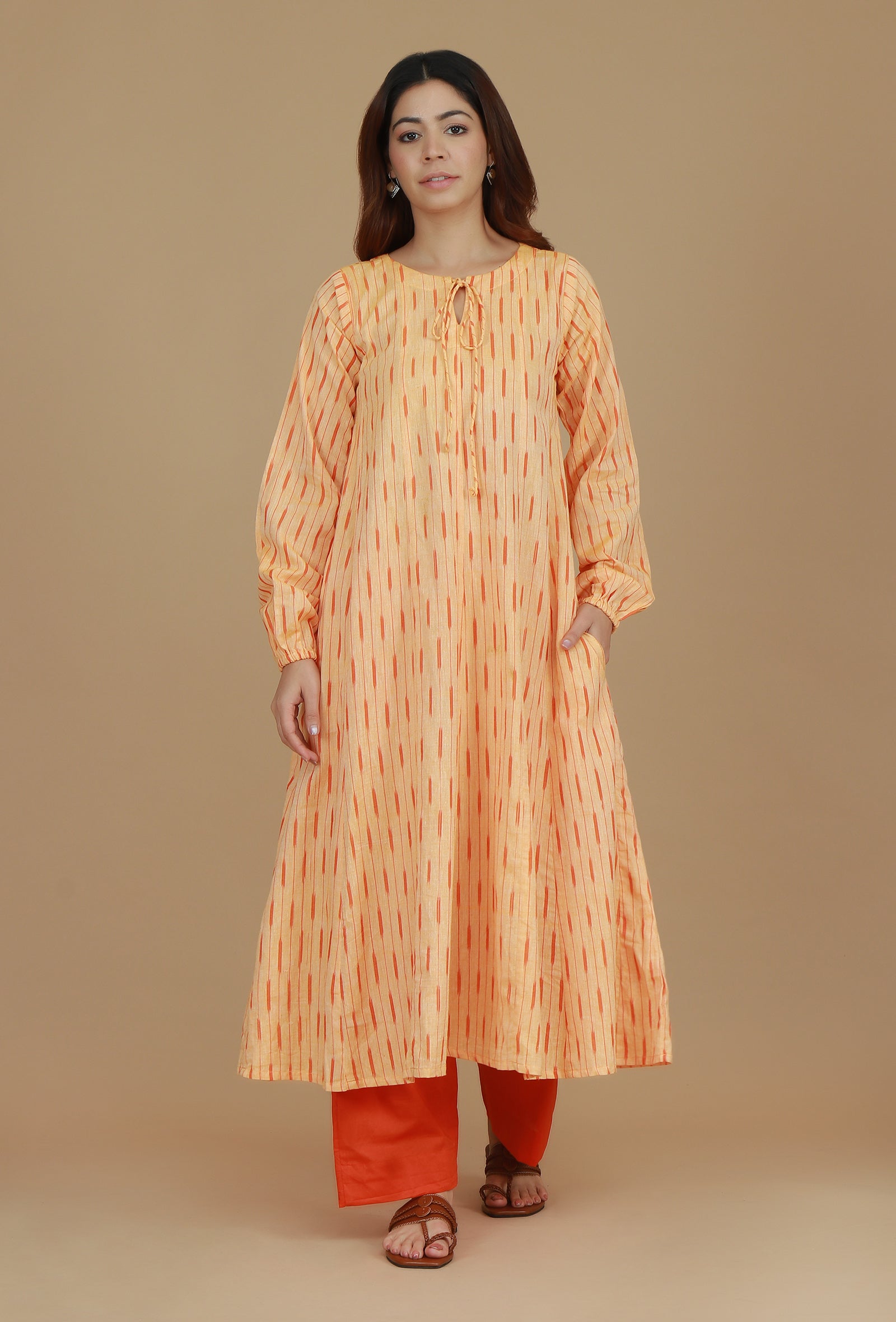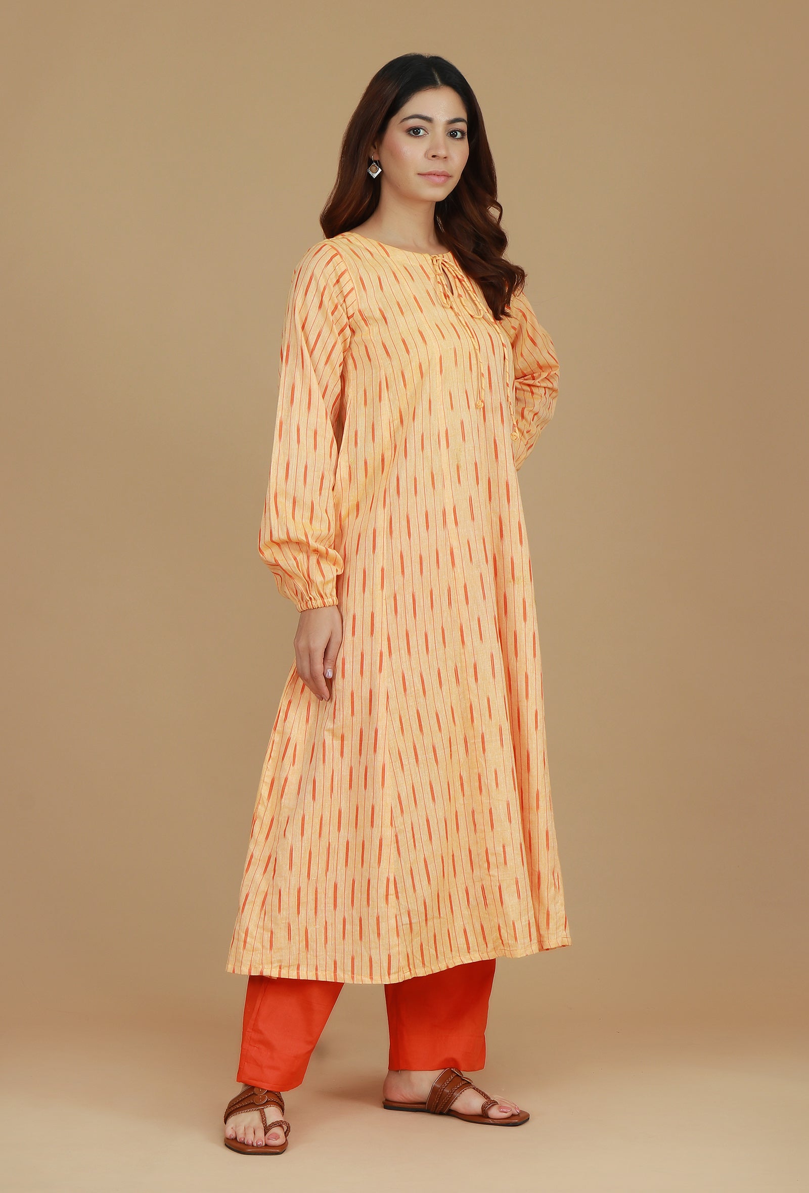 A stylish and vibrant set featuring a beautifully woven orange Ikat cotton kurta, paired with matching solid orange pants. The kurta is designed with a flattering tie-up neckline and long sleeves, offering a comfortable yet chic silhouette. Ideal for casual outings or festive occasions, this ensemble brings a touch of traditional elegance with modern appeal.