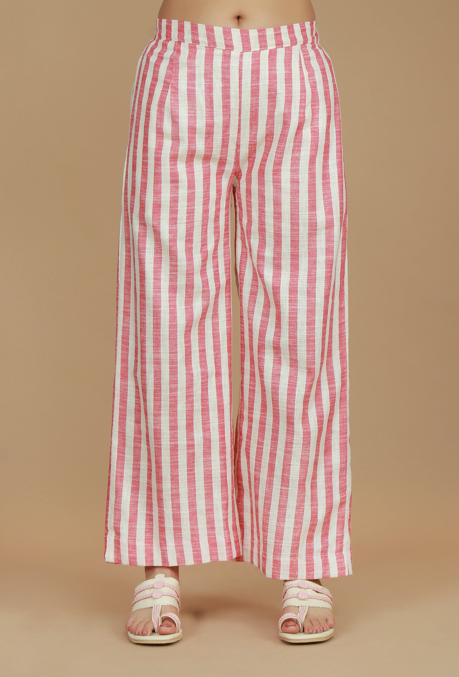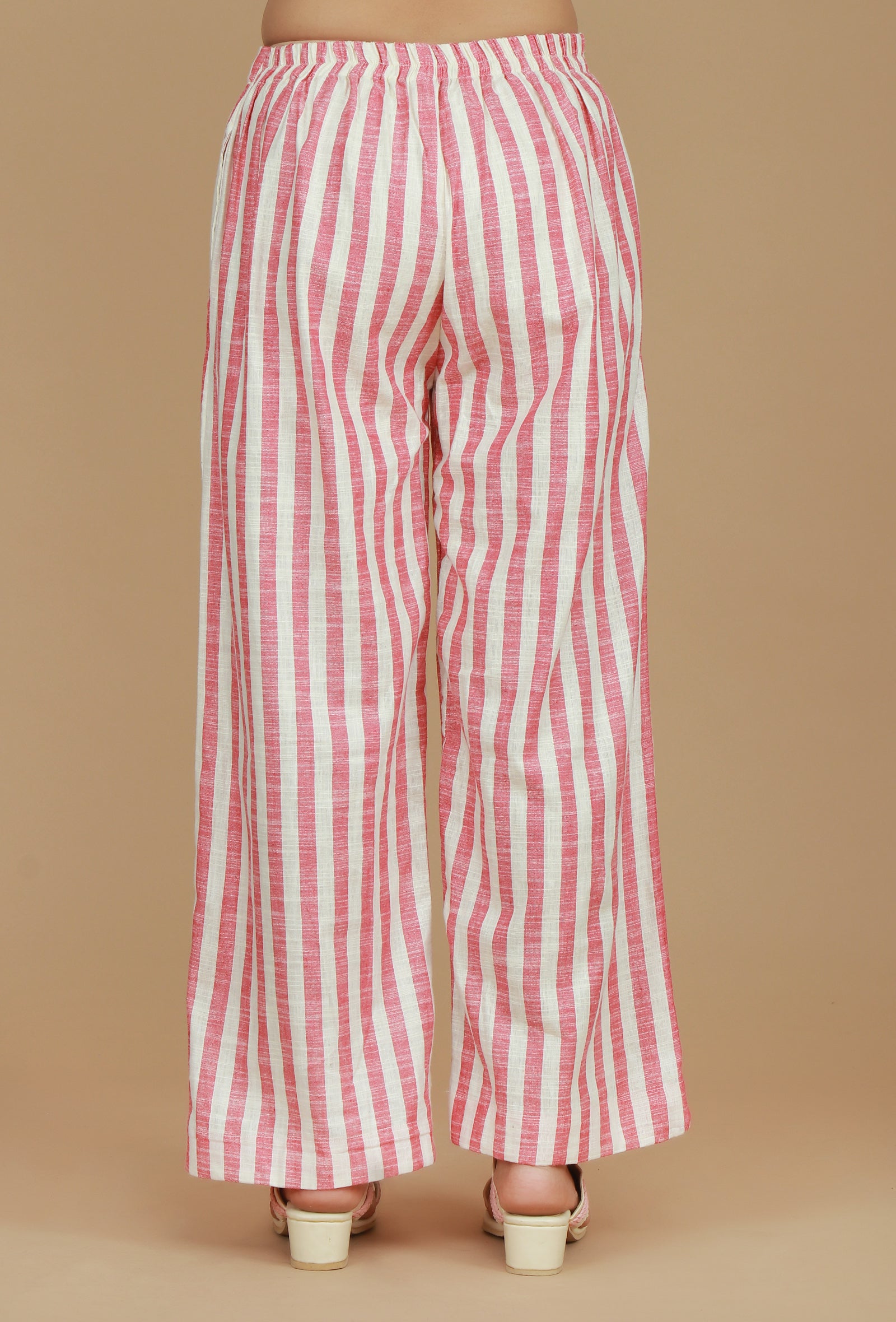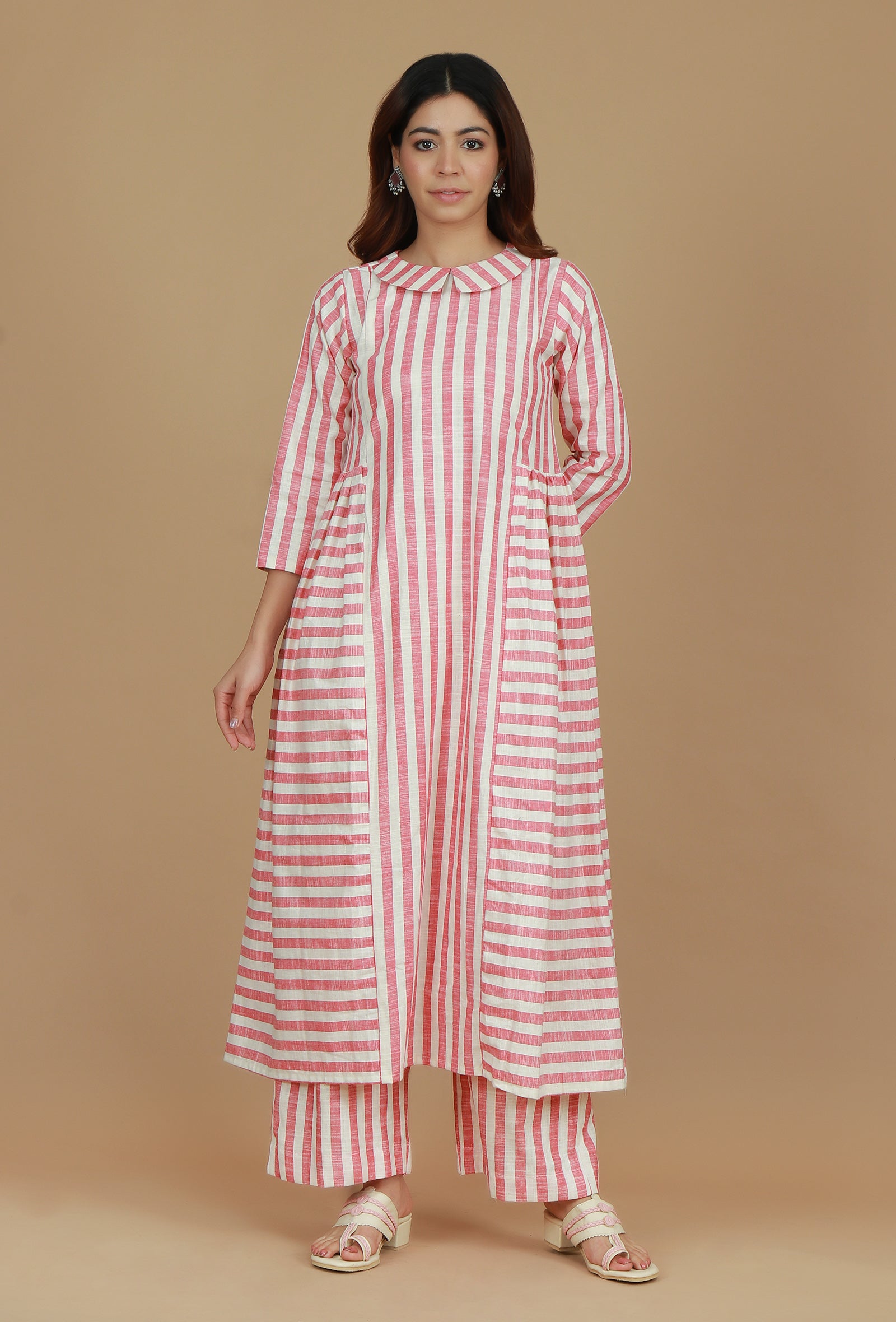 A stylish set featuring a pink and white striped cotton viscose kurta paired with matching pants. The kurta is designed with a flattering A-line silhouette, 3/4th sleeves, and a chic Peter Pan collar, blending comfort with contemporary elegance. Perfect for day outings or casual festive wear.