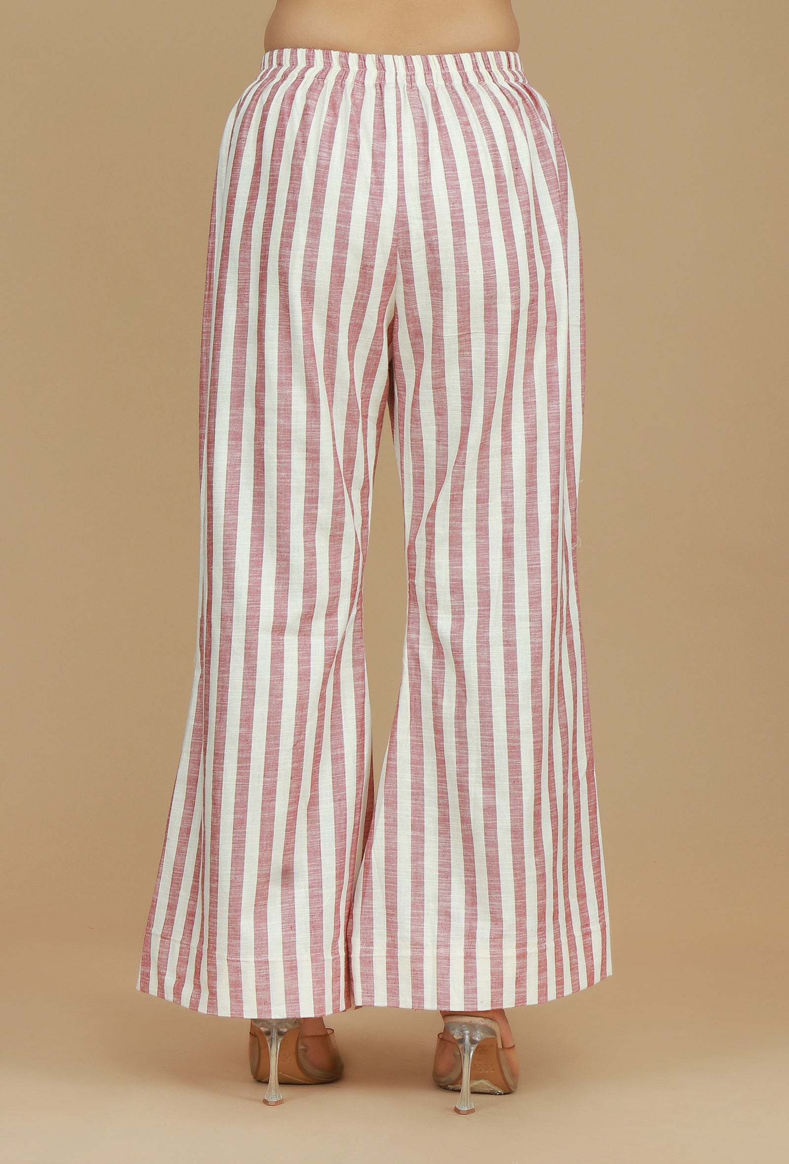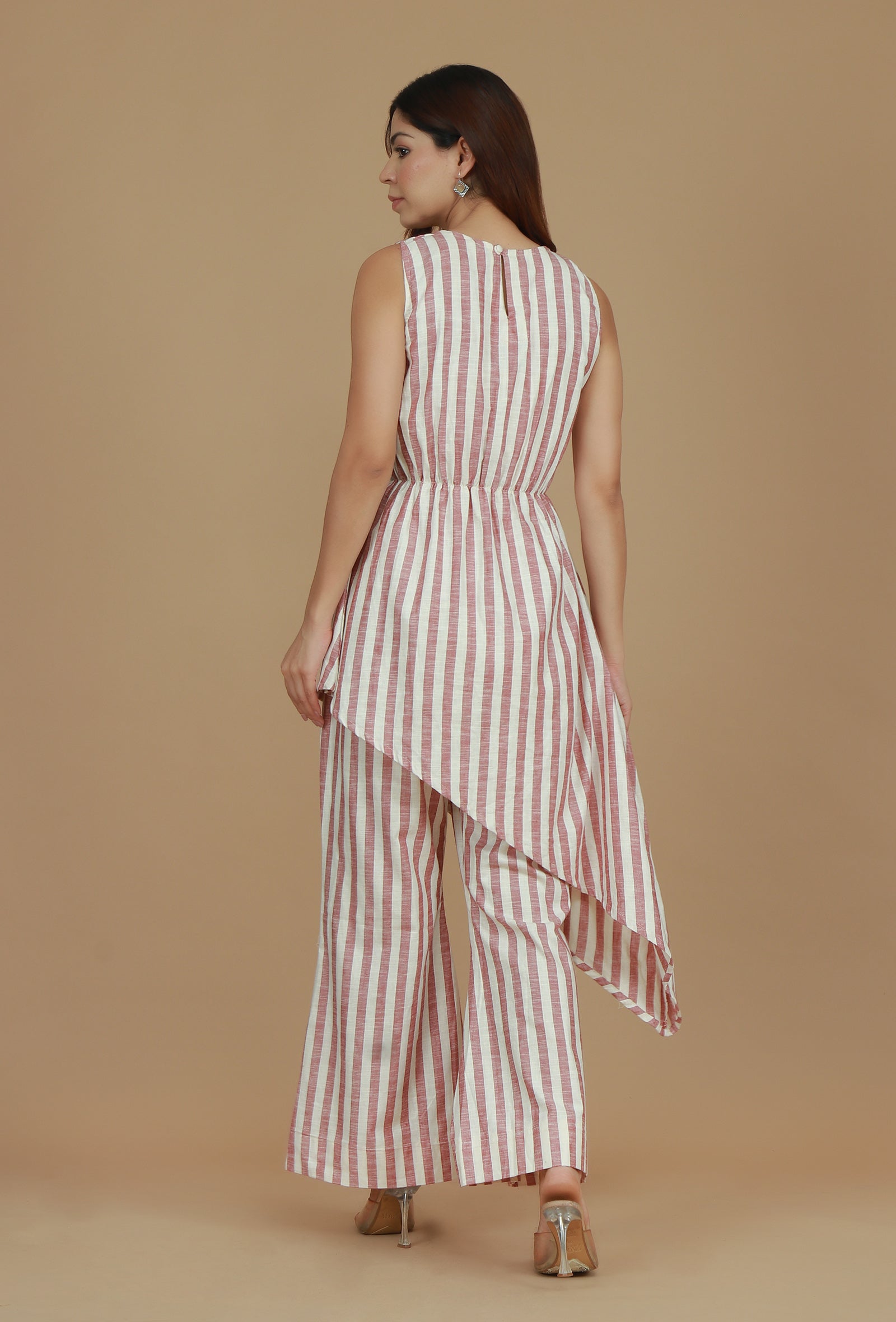 This chic co-ord set crafted in soft cotton viscose fabric features vertical rose and ivory stripes for a contemporary look. The sleeveless asymmetric top with gathered waistline pairs perfectly with matching wide-leg striped pants, creating a stylish and comfortable outfit for both casual and semi-formal occasions.