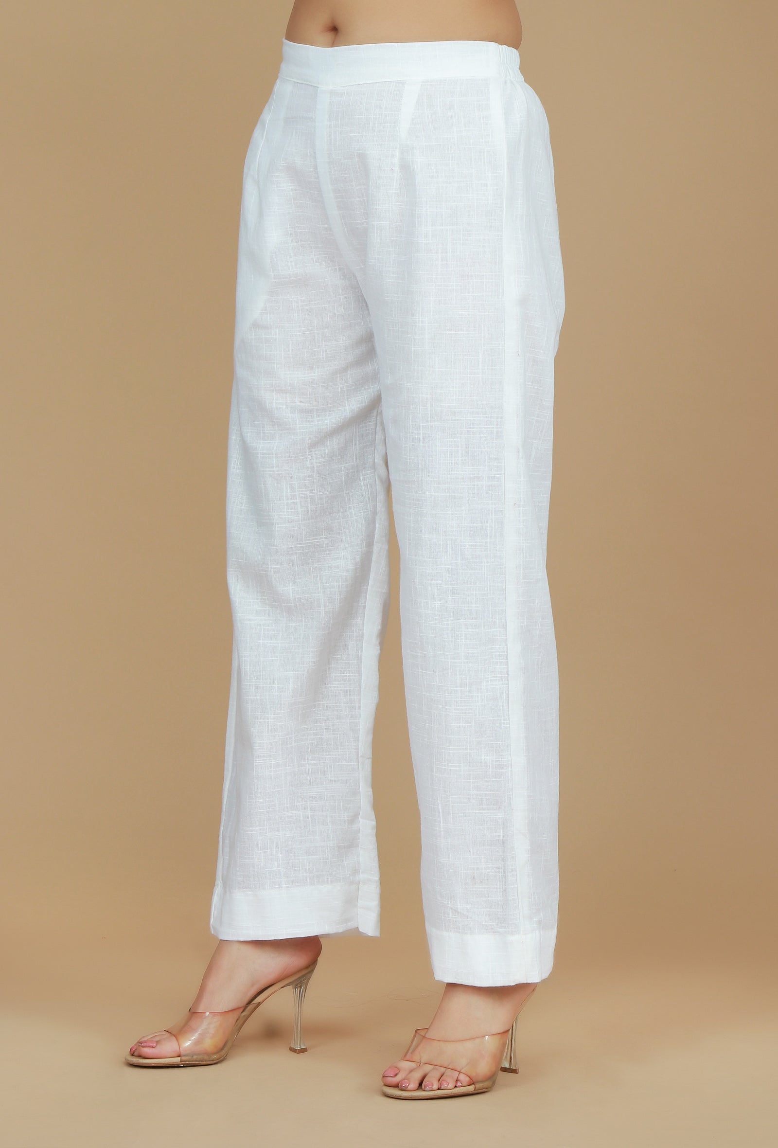 Classic solid white cotton pants with a straight fit, perfect for pairing with printed or woven kurtas. Comfortable, breathable, and versatile for daily wear.
