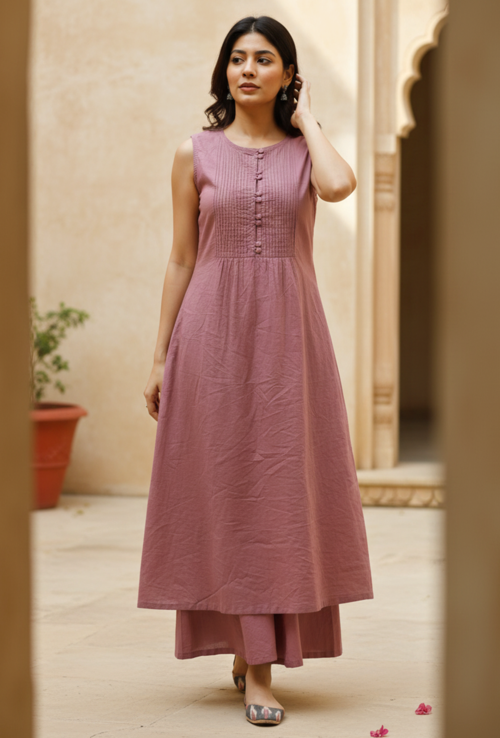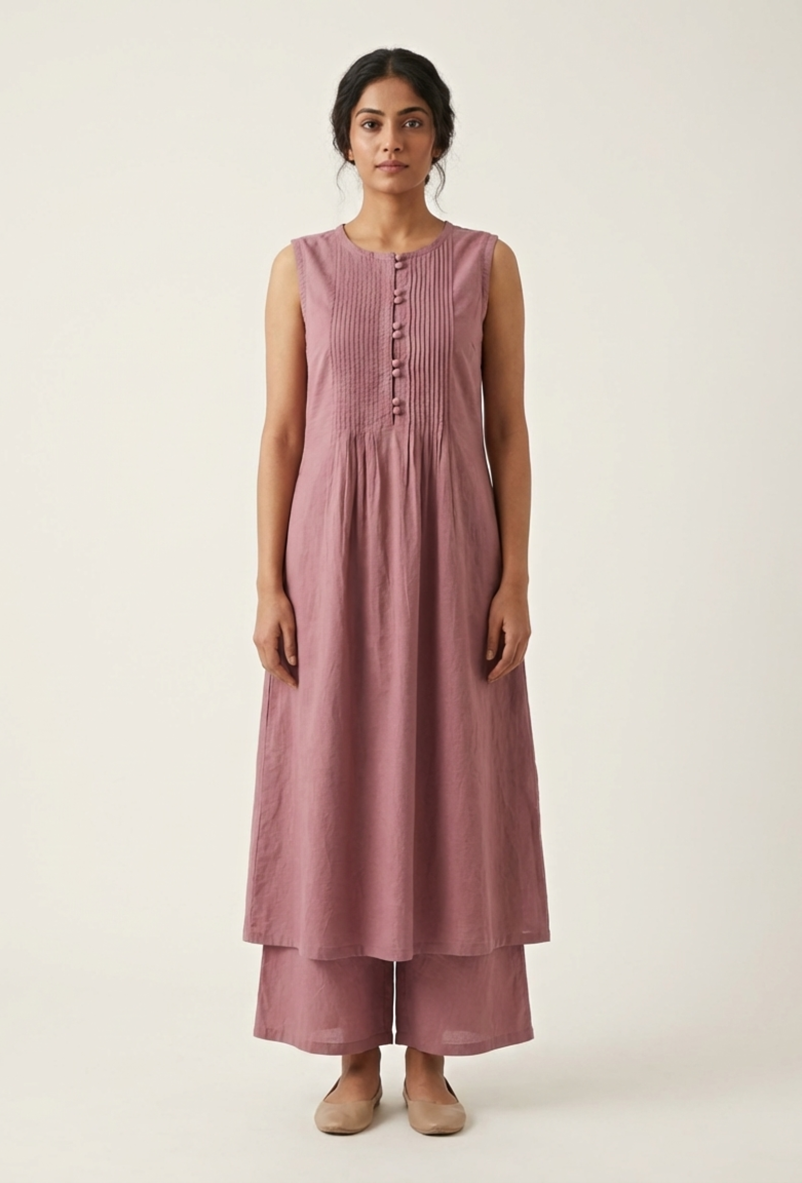 This violet kurta with pintucks and gathers on the front is a graceful summer kurta, with elegant piping on the neck. It is 100% cotton with a round neck and fabric buttons. This is perfect for summer with an A-line fit and no sleeves. You can style this with our favorite culottes. This product includes the kurta only.