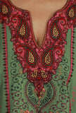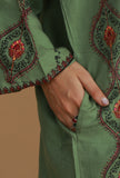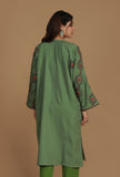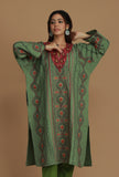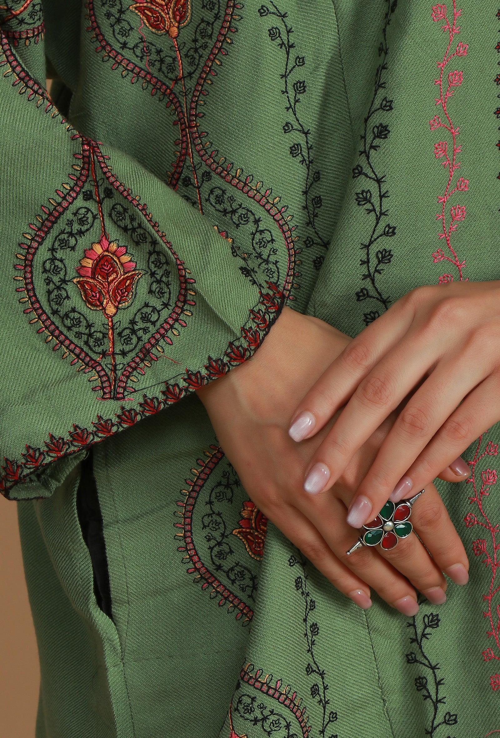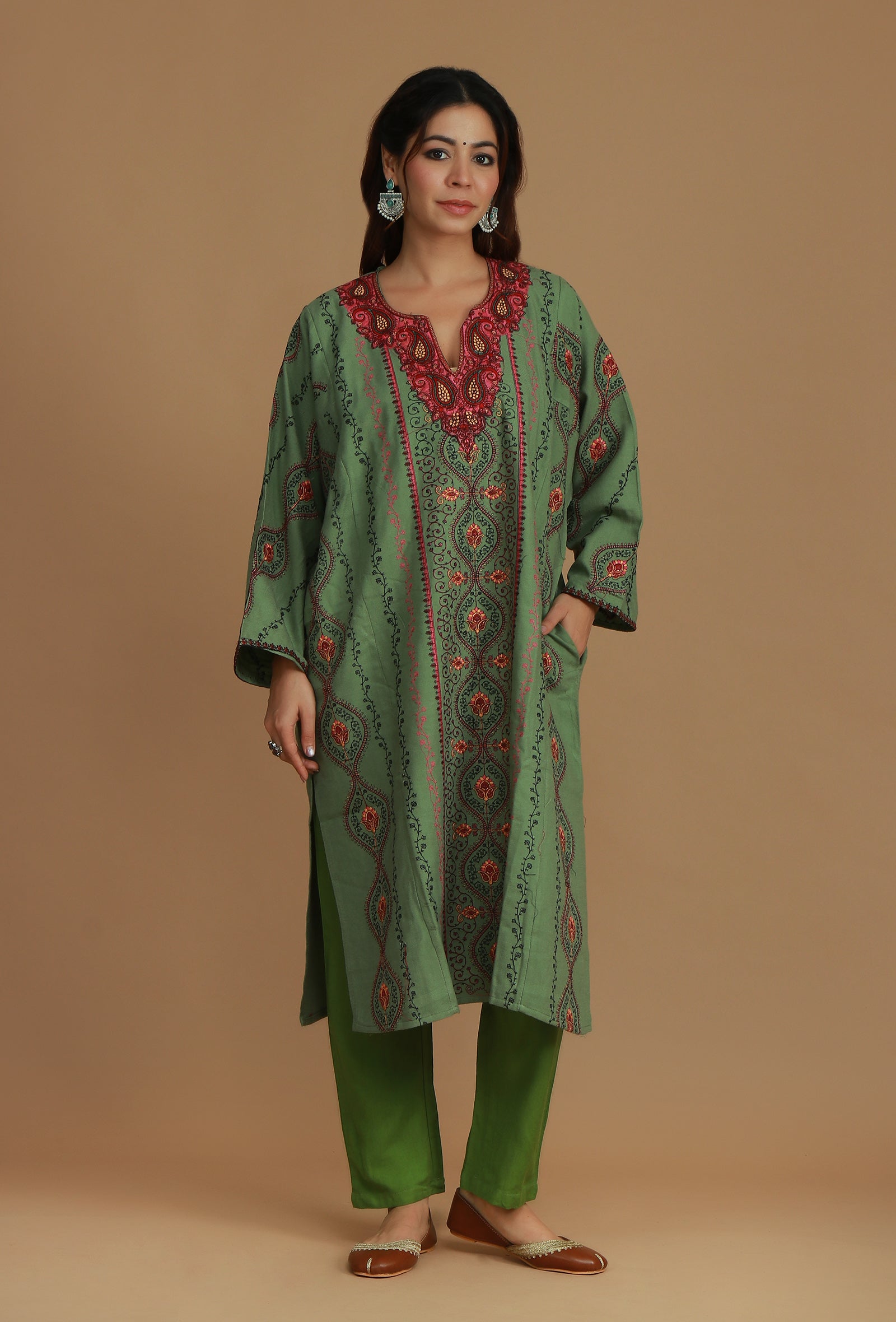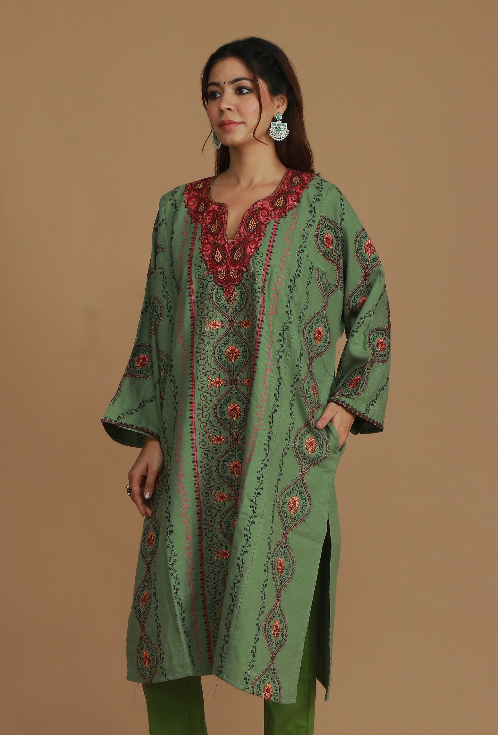 This warm Sage Green phiran features Aari embroidery covering the entire body with intricate vine and trellis patterns. The detailed design, including a bold V-neckline, offers a traditional yet unique and cozy winter style.