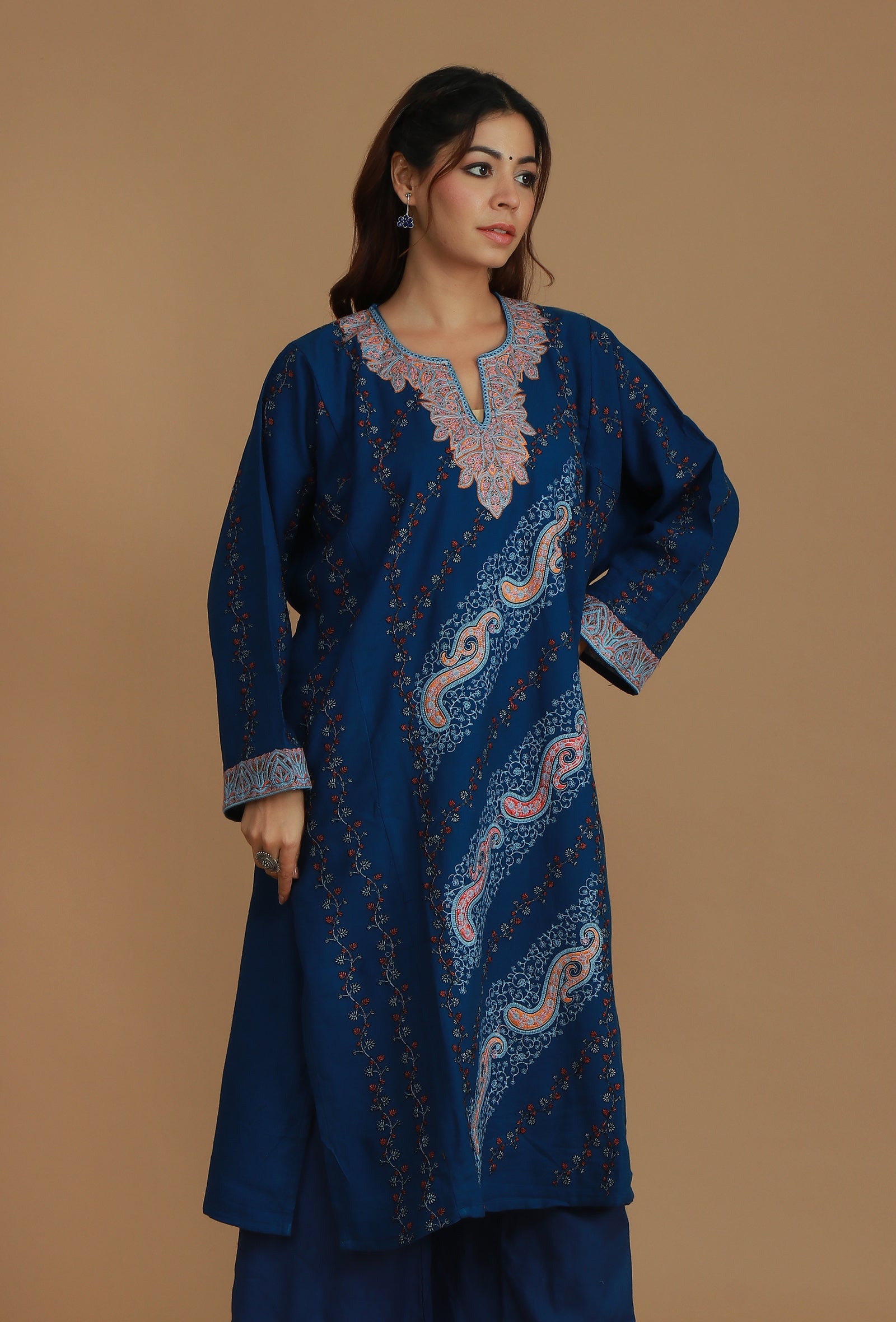 This warm Indigo Blue phiran features dense Aari embroidery across the entire body in paisley and vine motifs. The ornate design, including a detailed V-neckline and cuffs, provides a sophisticated and warm traditional look.