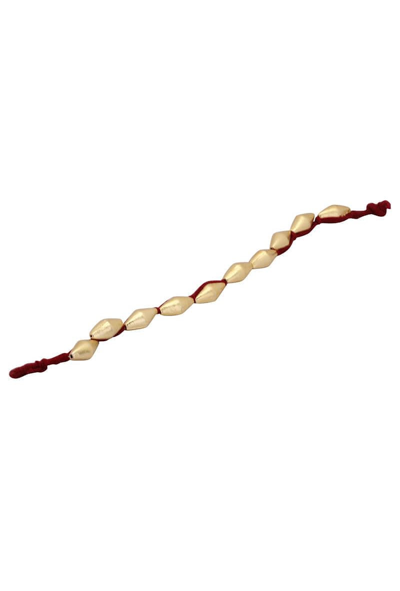 Sweet and simple, this anklet uses a single strand of dholki shaped beads. These beads are crafted from German silver and polished a bright golden colour, then carefully threaded onto a red cord to create this beautiful anklet. Note: Size may vary as these are Hand-made. Dimension In Inches: L: 8 inches Dimension In Centimeters: L: 20 cm