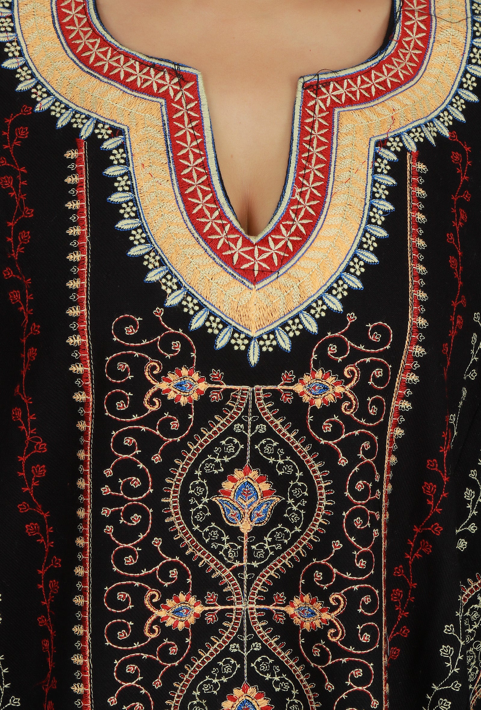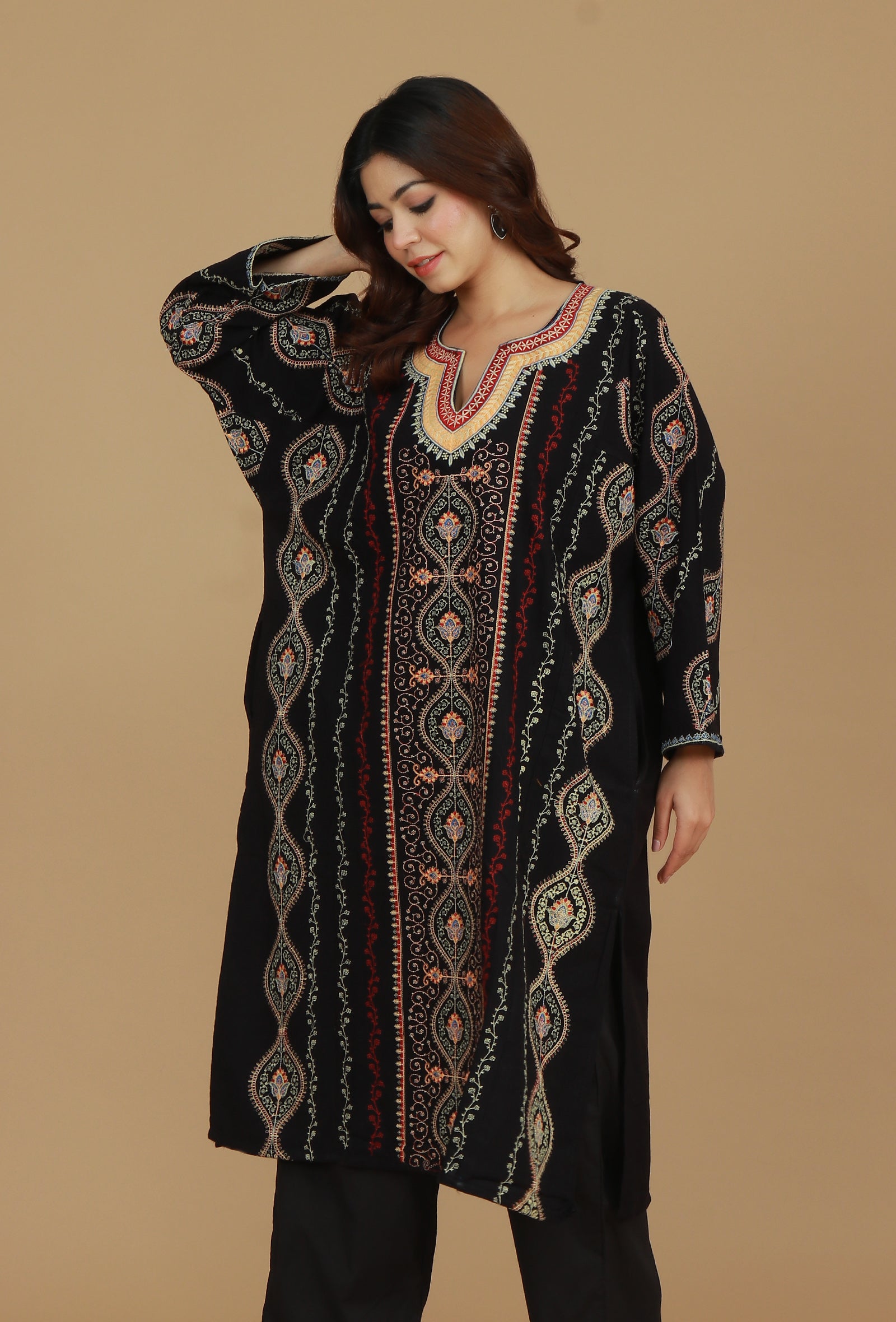 Elegant free-size black phiran adorned with intricate Kashmiri-inspired multicolour embroidery. Designed with a V-neckline and relaxed fit, this timeless piece offers both comfort and charm, perfect for festive occasions and winter wear.
